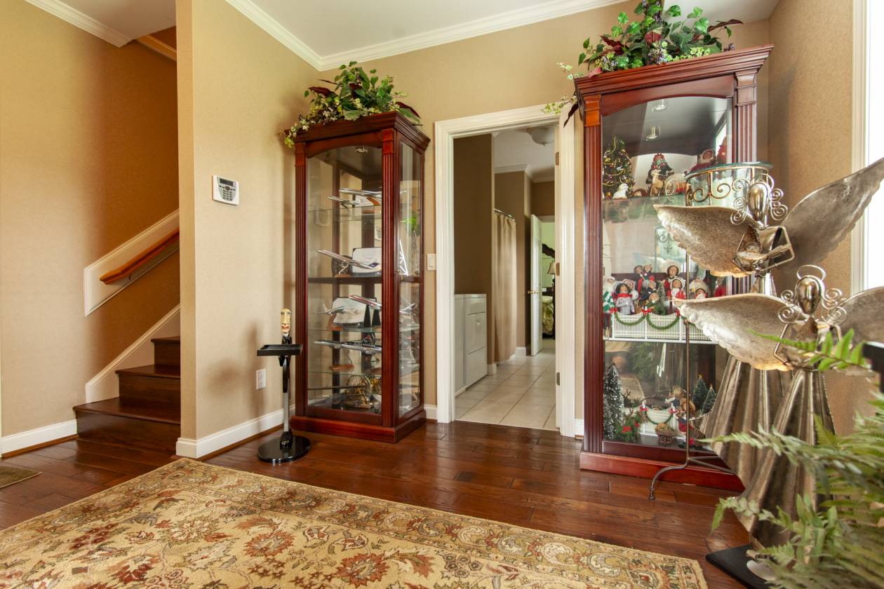 The home, which was built in 2000 and renovated in 2013 to include new hardwood floors throughout most rooms, ungraded kitchen cabinets with granite countertops, high end appliances and large pantry and boost an open family and entertaining area. The kitchen being the heart of the home, is separated by a center island with seating for 6 and is part of open living area where the cook can enjoy the big screen TV which is surrounded by built in custom cabinets and shelves, the gas fireplace and the spacious adjacent dining area with built in buffet. All while enjoying the views onto the front porch and down the driveway.