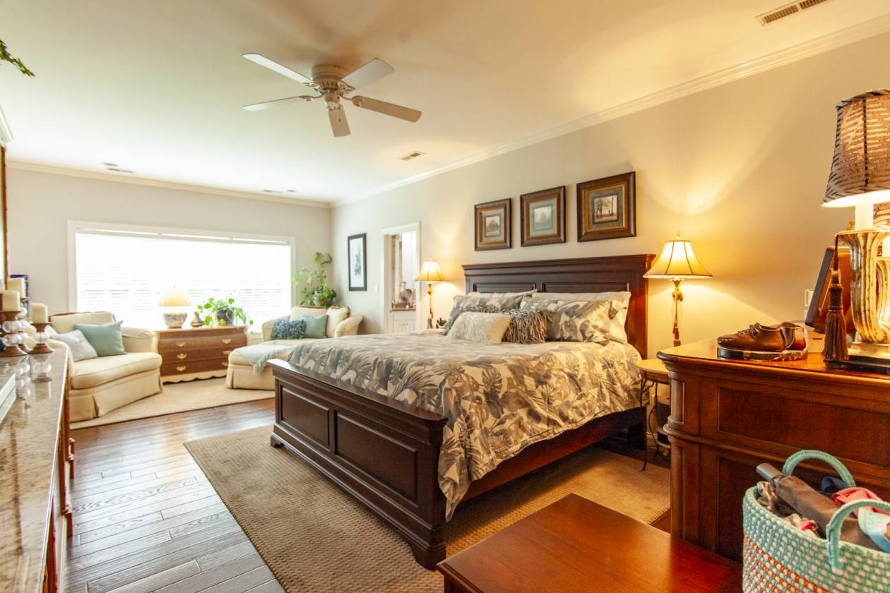 The primary bedroom is a private retreat, large enough to accommodate a seating area for quiet reading or lounging. The large tile bath features a walk-in shower, air pulse tub, double sink vanity with granite tops and an adjoining laundry room which in turn connects to an oversize custom closet including built-in cloths hampers and ironing board. There is an additional cedar lined closet for seasonal storage and linens.