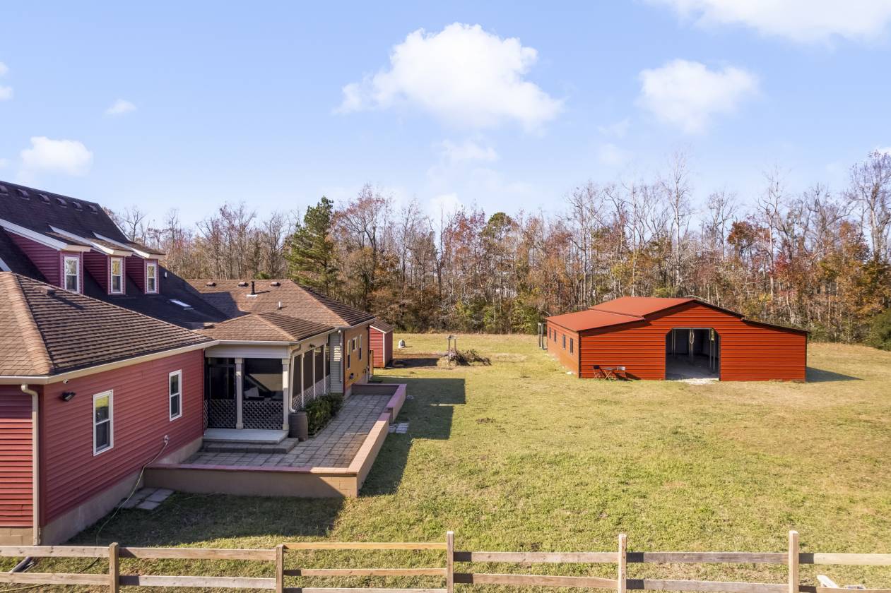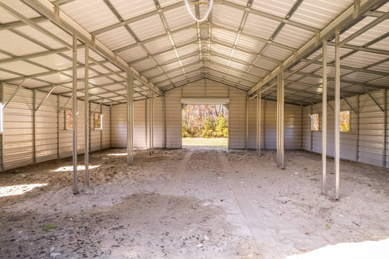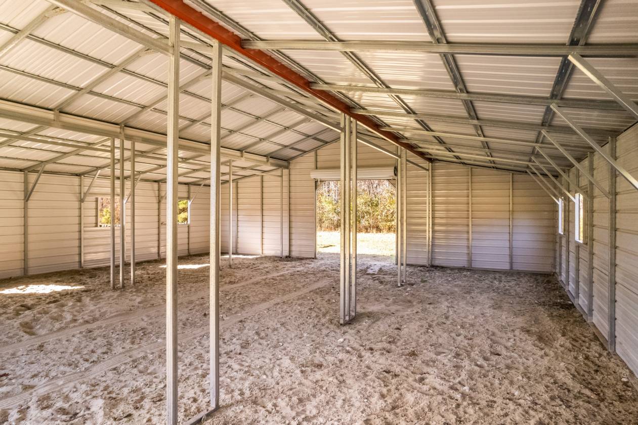 The brand-new metal barn is ready for your vision, featuring freshly graded sand footing, an 18-foot center aisle, and eight 12x12 steel stall frame-outs. The open layout allows endless design options—build out 4 stalls and a workshop or a full 8-stall setup. You also have a large fenced riding area, a side paddock, and the joy of seeing your horses right from your bedroom window. Barn dimensions: 42 ft wide x 50 ft long.