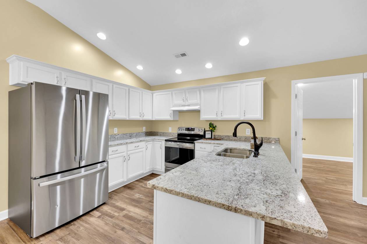 - The spacious 1,312 sq ft barndominium-style apartment has been recently renovated and offers a bright, open-concept kitchen, dining, and living area. The kitchen features a large breakfast bar, white cabinetry, beautiful granite countertops, and stainless steel appliances that convey. Formerly decorated as a four-bedroom layout, the space includes multiple flex rooms that can easily adapt to guest space, office use, or hobby rooms.