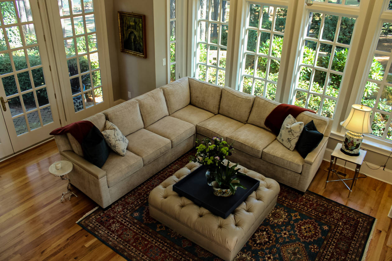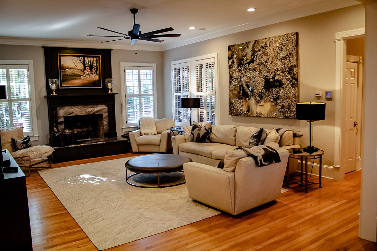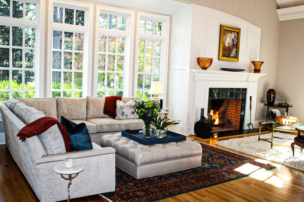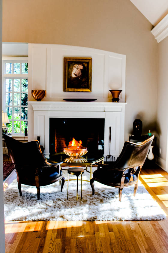 - • Large formal living room with wood burning fireplace and views of pond