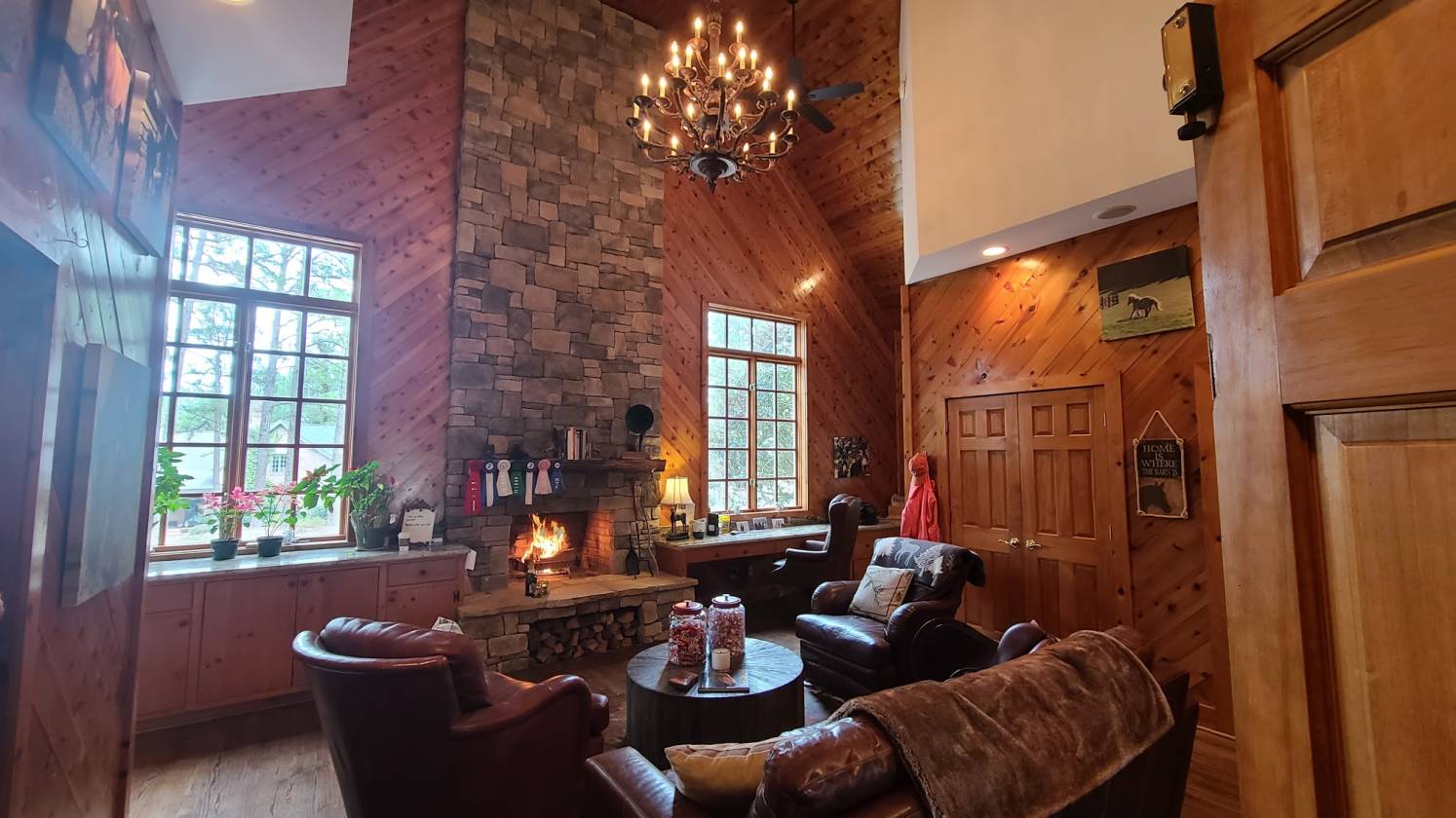 - • Exquisite tack room with hardwood floors and 20 foot stone fireplace