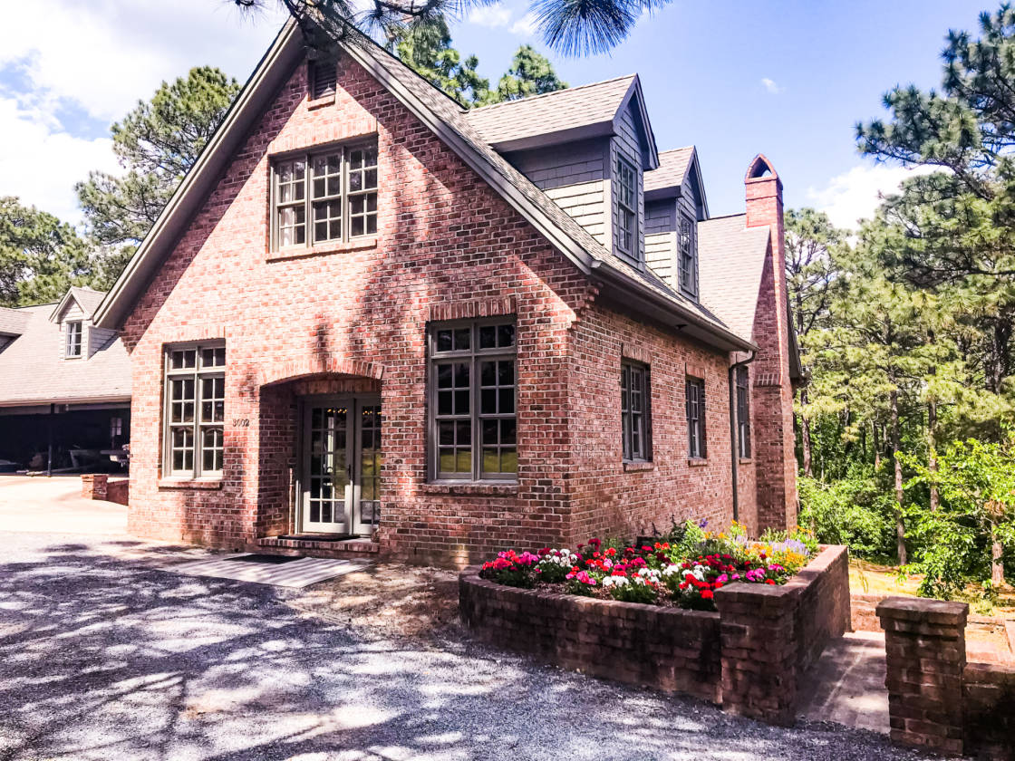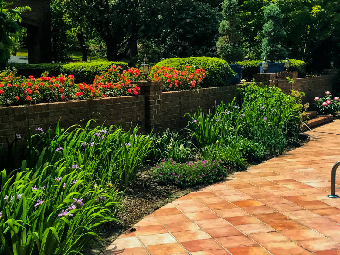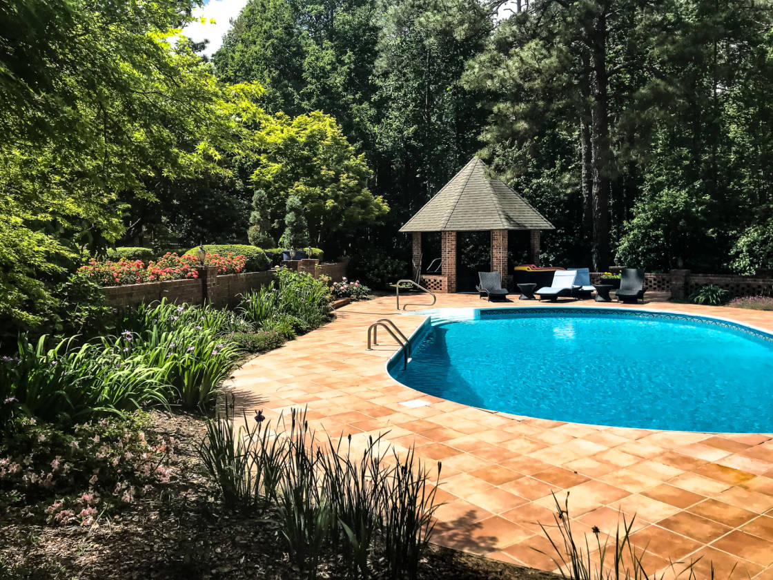 - • Extensive brick paths and patio space overlooking pool and pond