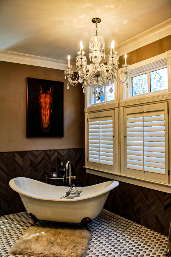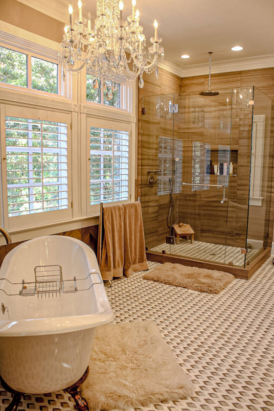 - fireplace, private balcony overlooking pool and fire pit. Bathroom with walk in glass shower, claw foot tub, his and her vanities and separate