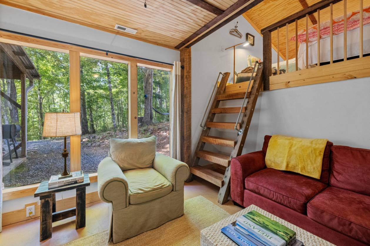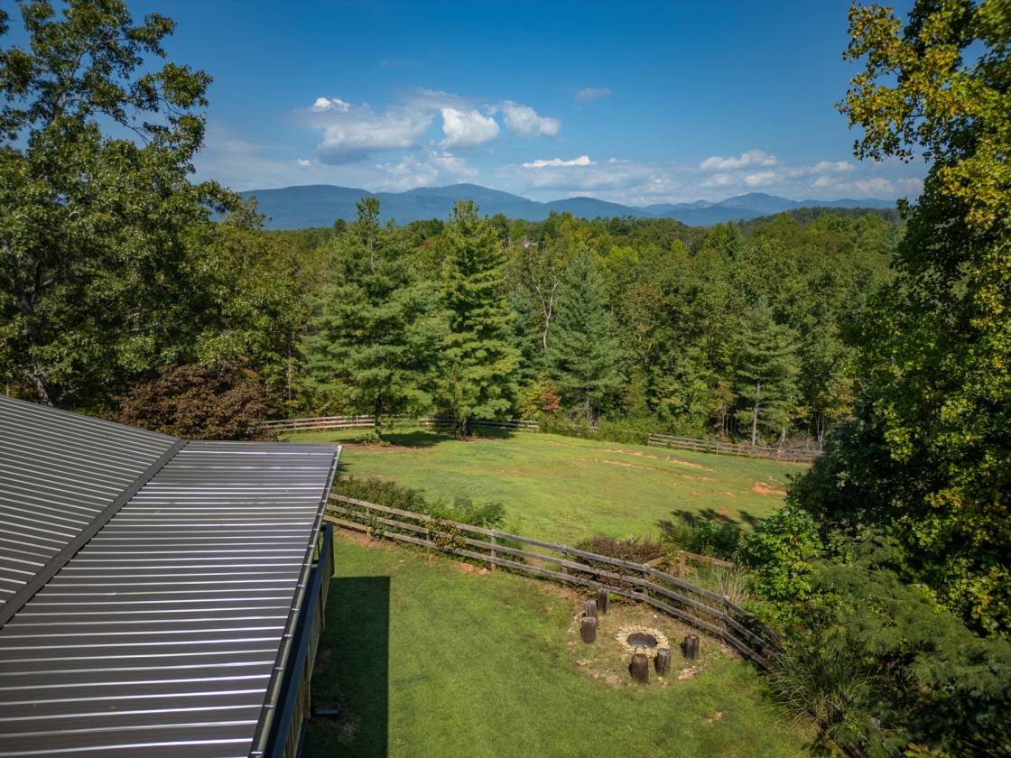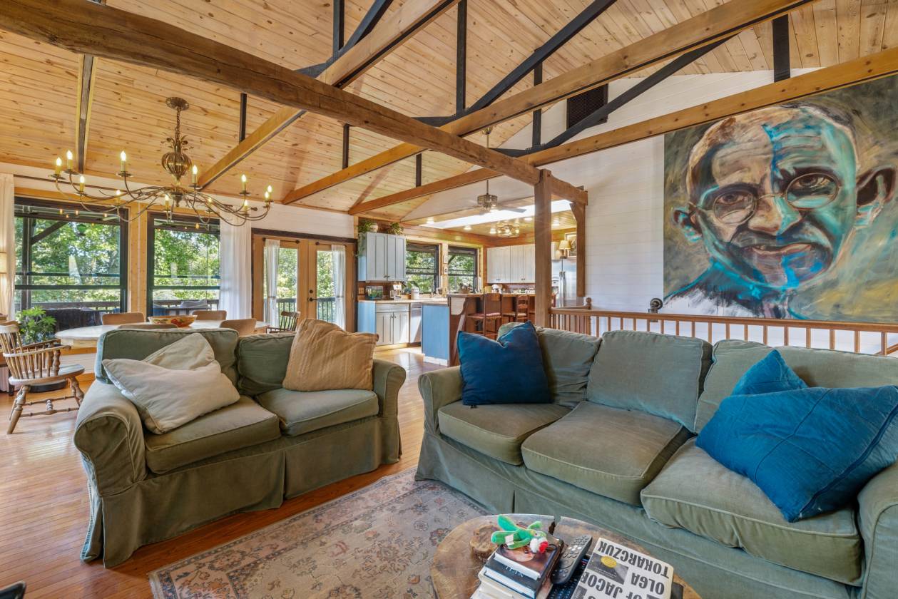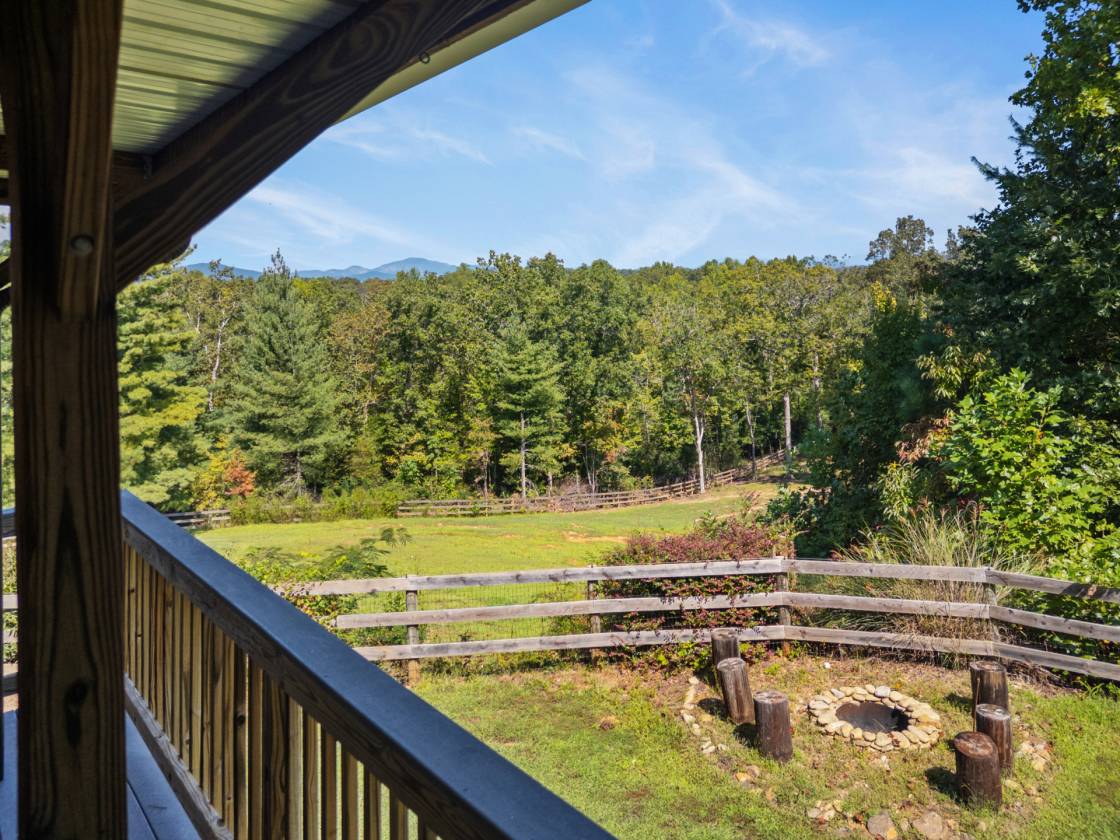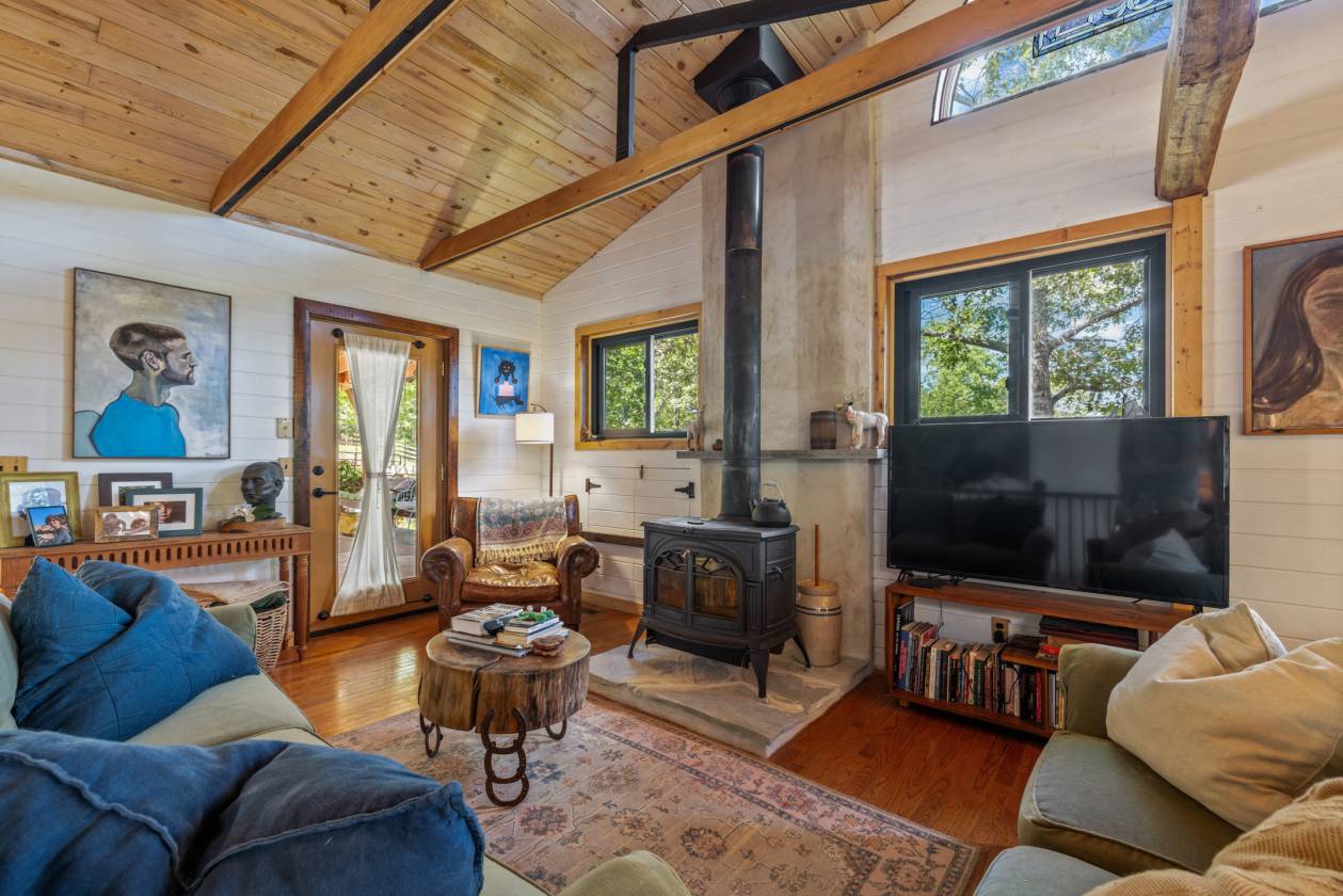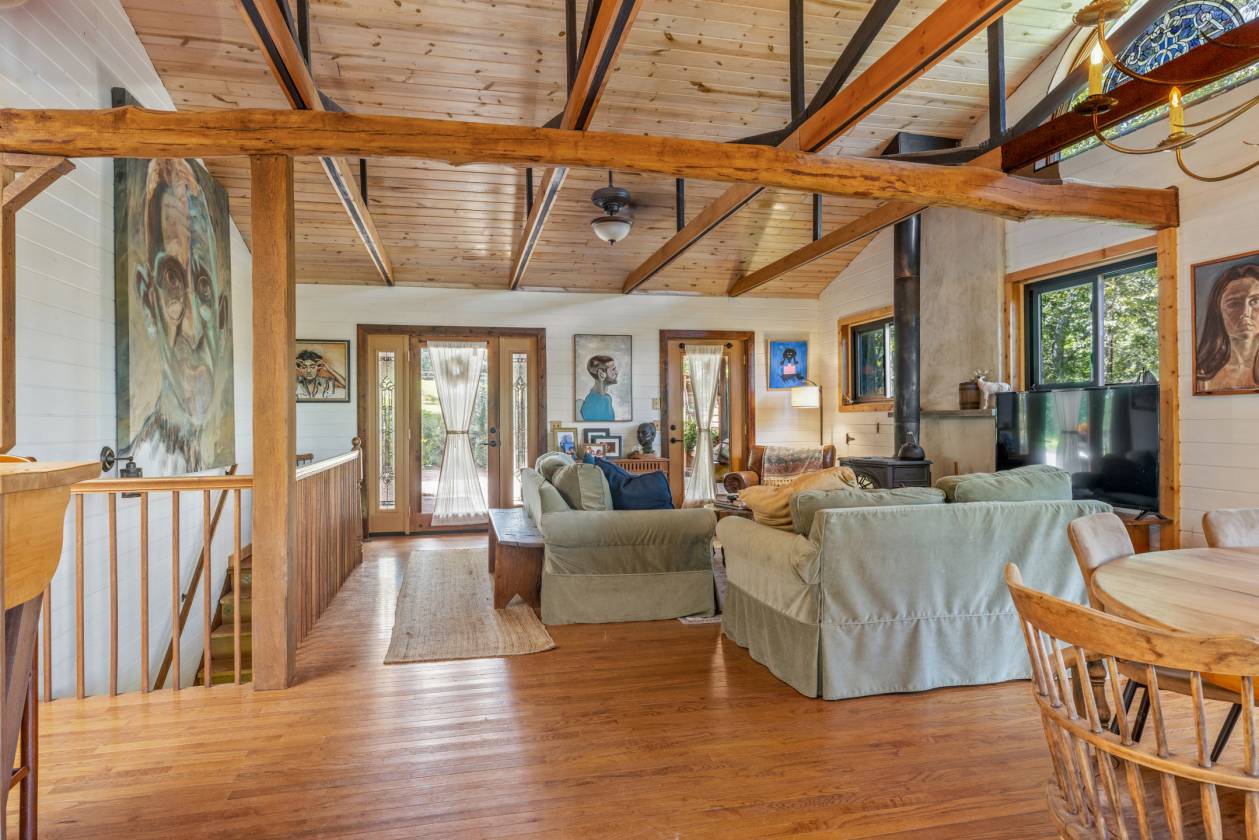 Perched high on 25 wooded acres with cleared pasture, this custom retreat is built for people who live outside. A private half-mile winding drive leads past a 60' x 40' workshop with a 2 bedroom efficiency apartment before continuing to the main house with sunset views. - Your perfect base camp after a day in the saddle or on the trails. Step inside and you’re greeted by open ceilings lined with pine tongue-and-groove boards, hand-hewn oak beams, and an artful wood stove surround. The open floor plan invites gatherings, while the main-level primary suite offers a walk in shower and new countertops and sinks. Every detail, from boot-friendly entrances to gear-ready storage, is designed for life lived in muddy boots and trail dust. Year-round and winter mountain views frame the backdrop.