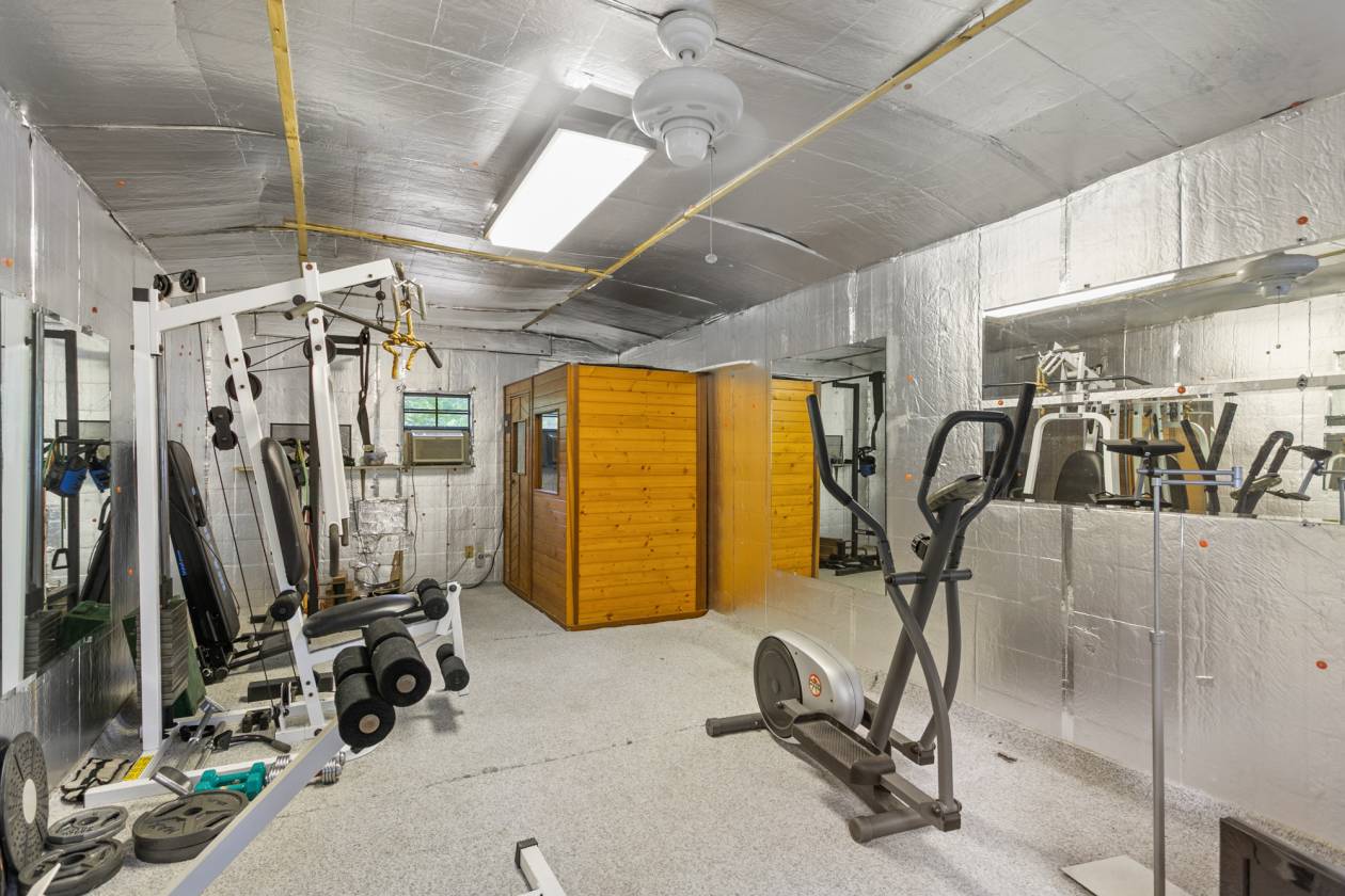 Home gym with electric, mirrored walls, and sauna