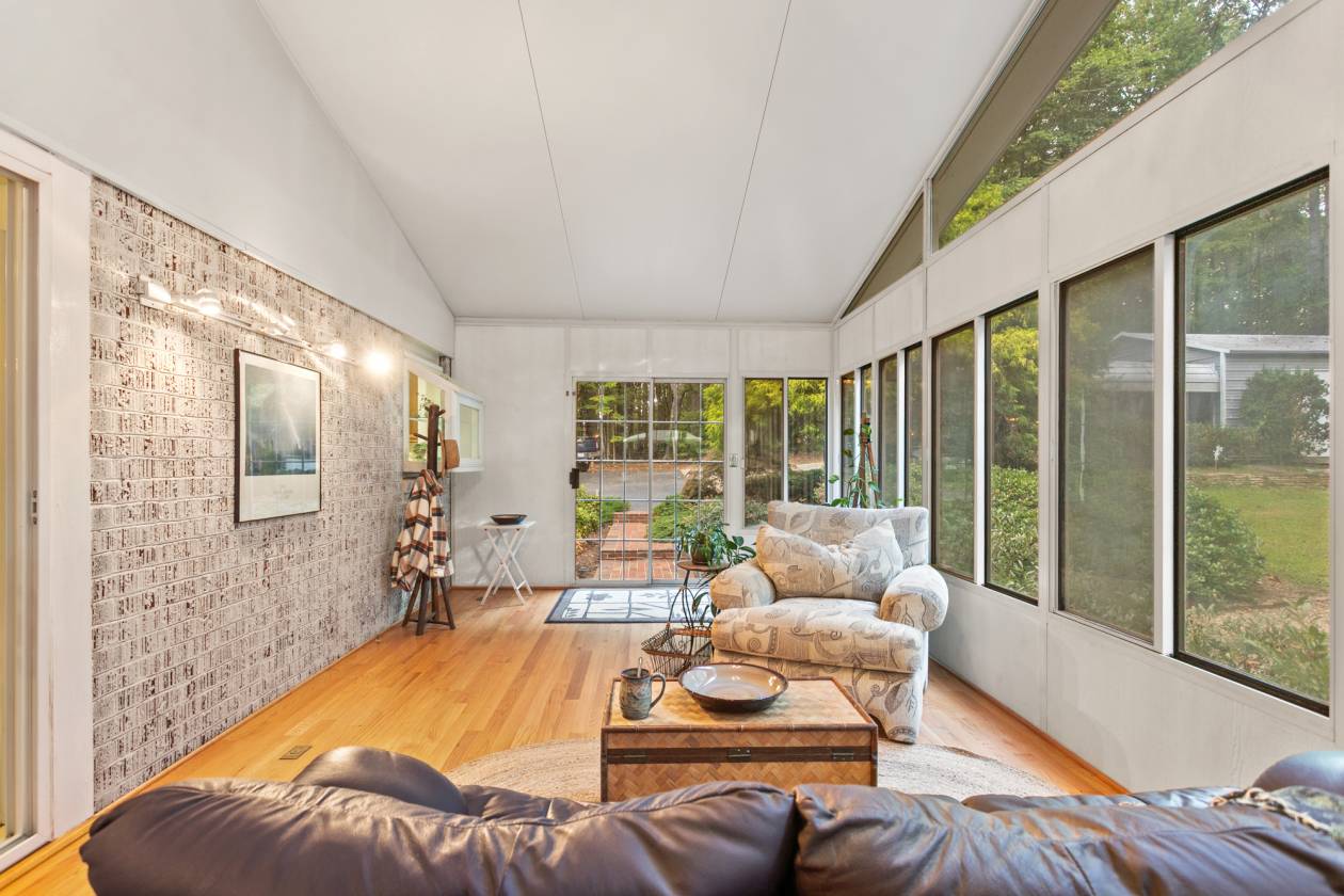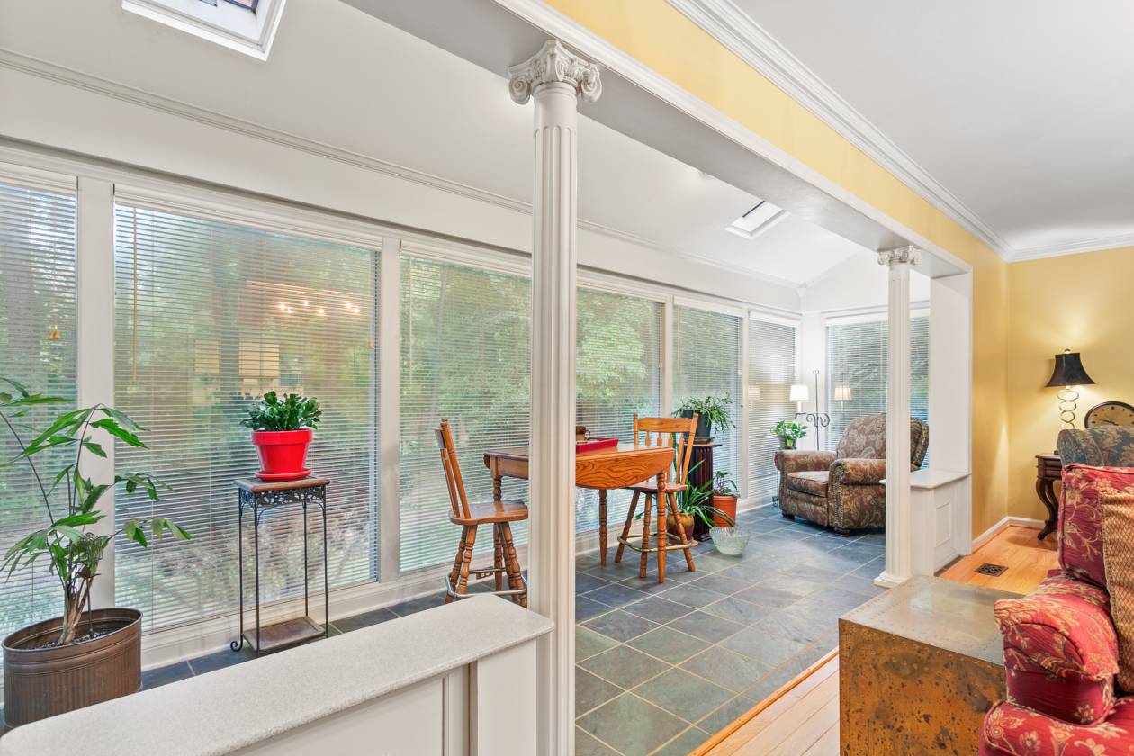 • Sunroom with slate flooring and expansive windows