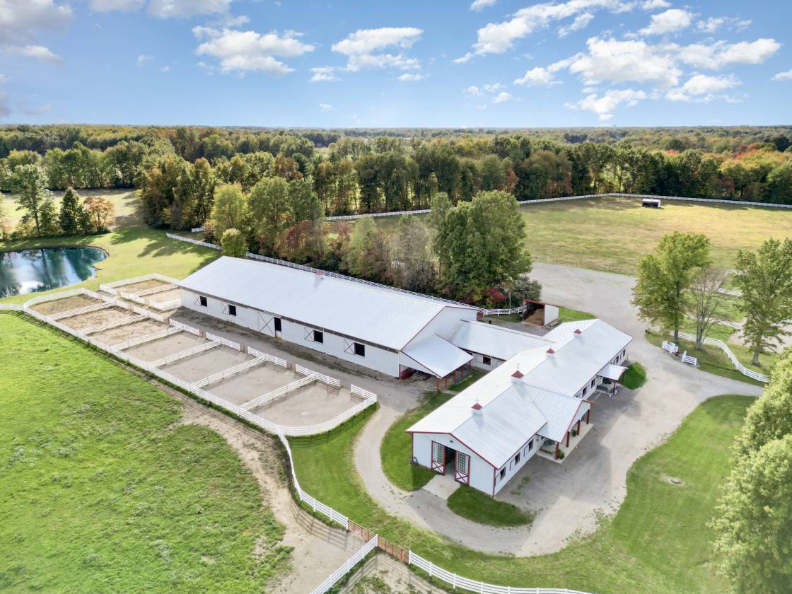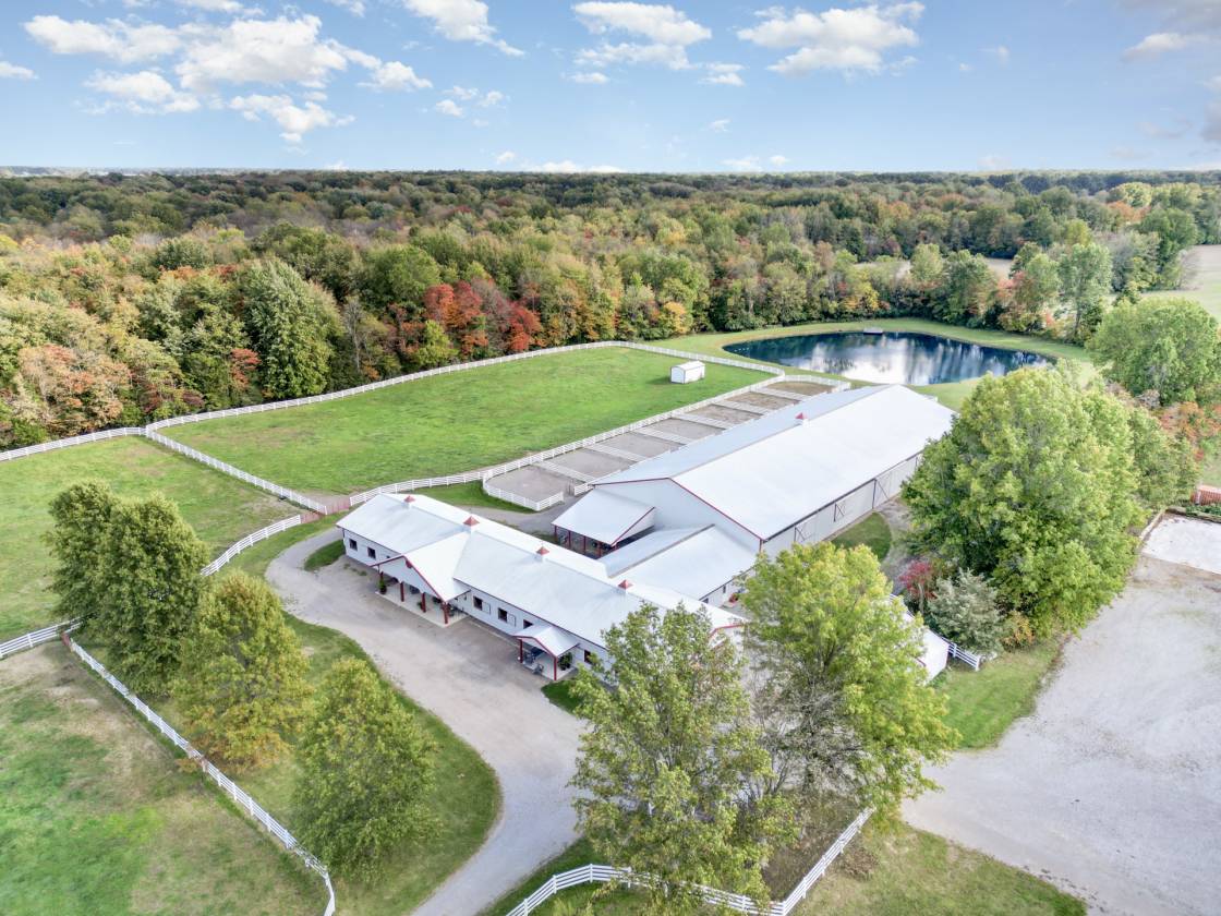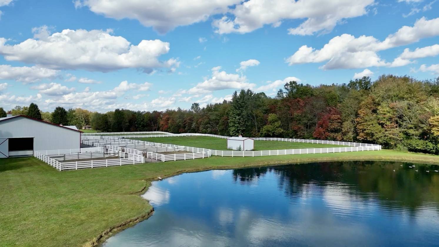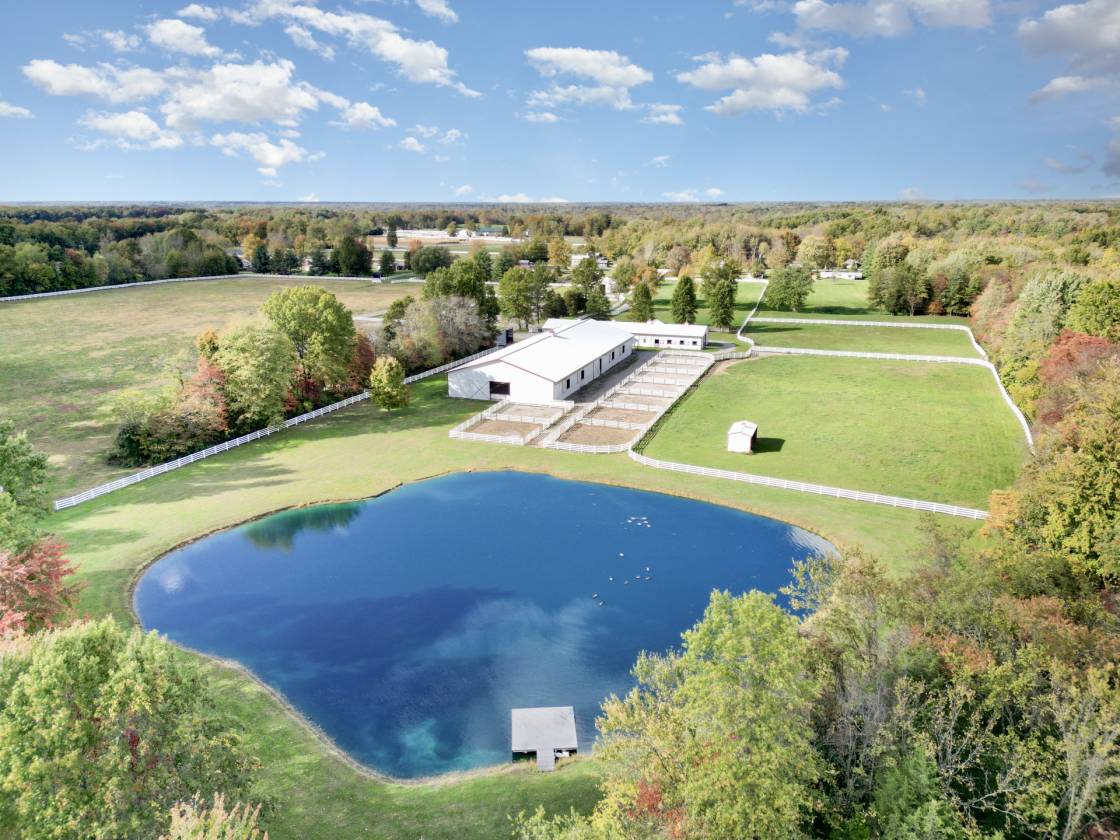 Stunning 69-acre gated equestrian training facility just 30 miles from The World Equestrian Center. Designed for the serious competitor, the property features an 80x200 indoor arena with 16-ft ceilings, GGT footing, mirrors, and an overhead watering system, plus a 70x210 outdoor arena with sand footing. The main barn offers 22 matted stalls, an office, feed room, 1.5 baths, and climate-controlled tack and viewing rooms. Traveling riders will appreciate the oversized turnaround lot and 4-stall layover barn (40x50). With 9 pastures, 9 dry lots with limestone screenings, and ~35 tillable acres, it’s ideal for training and boarding. Additional highlights include a Barn Manager/Caretaker’s farmhouse and a ¾-acre stocked pond with Trex dock. A rare opportunity to own a premier equestrian estate in a prime location.