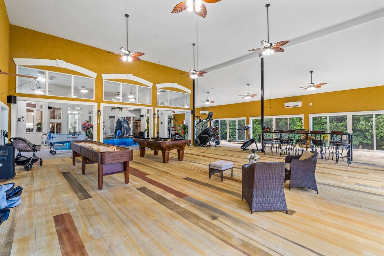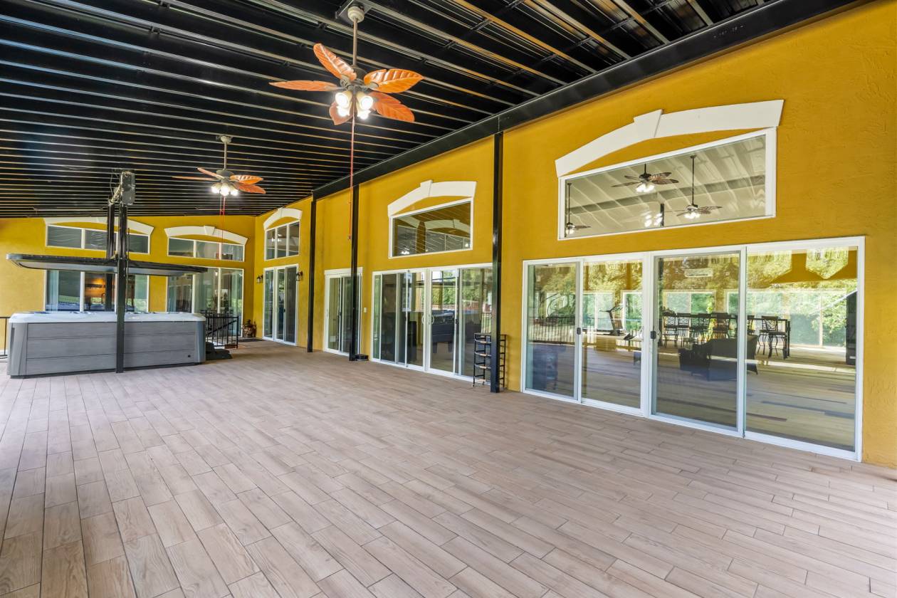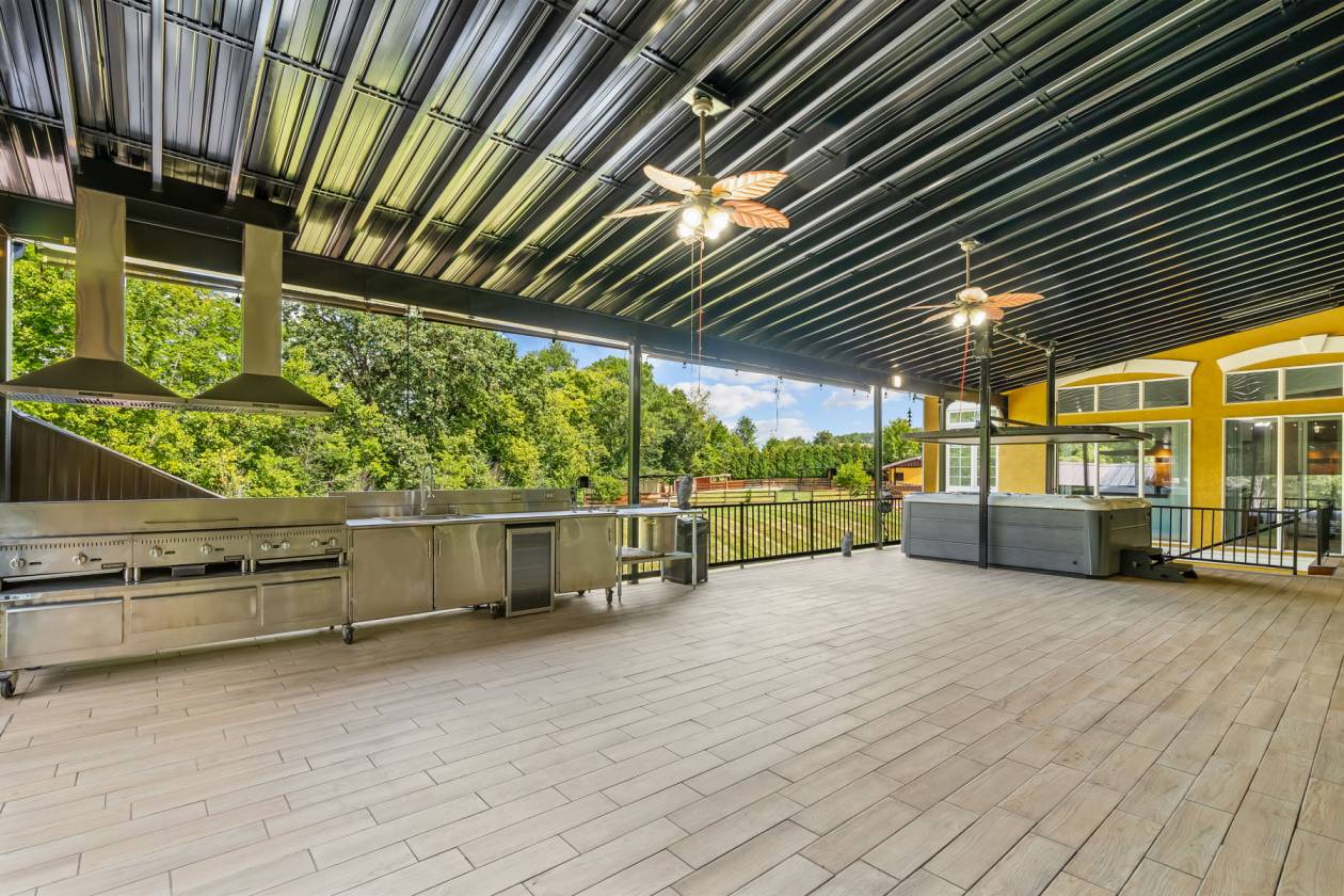- 1200 square feet of deck space that has an industrial kitchen and a hot tub with an automatic remote-controlled cover.