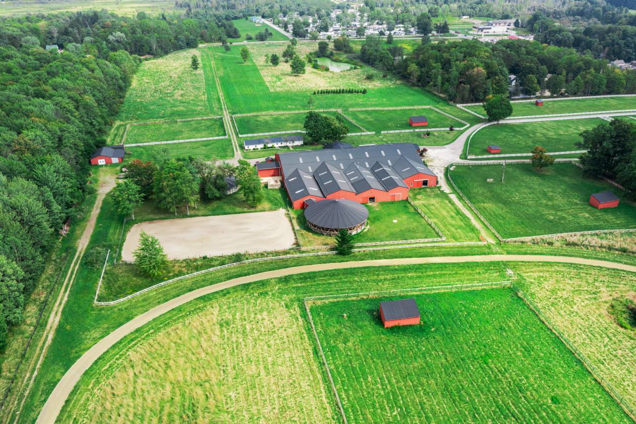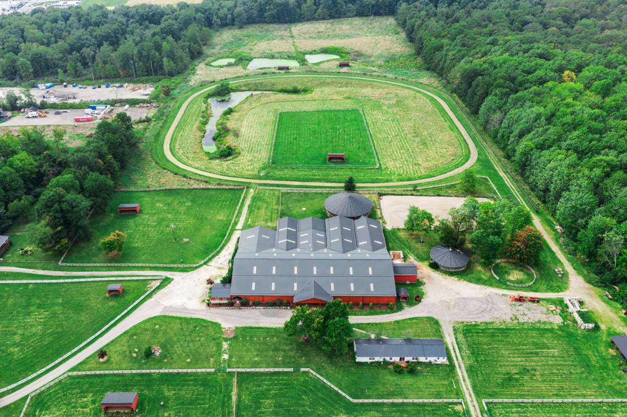 Welcome to JSR Equine Center, a premier 58-acre equestrian estate in Chardon, Ohio, reimagined with over $1M in recent upgrades. Enter through a new $36,000 industrial gate and freshly paved drive to discover 10 fenced paddocks (eight with automatic water), five ponds, and world-class facilities, two indoor round pens, an outdoor round pen, a full outdoor racetrack, a round pen, a four-horse jogging machine, and multiple run-in sheds with automatic water.