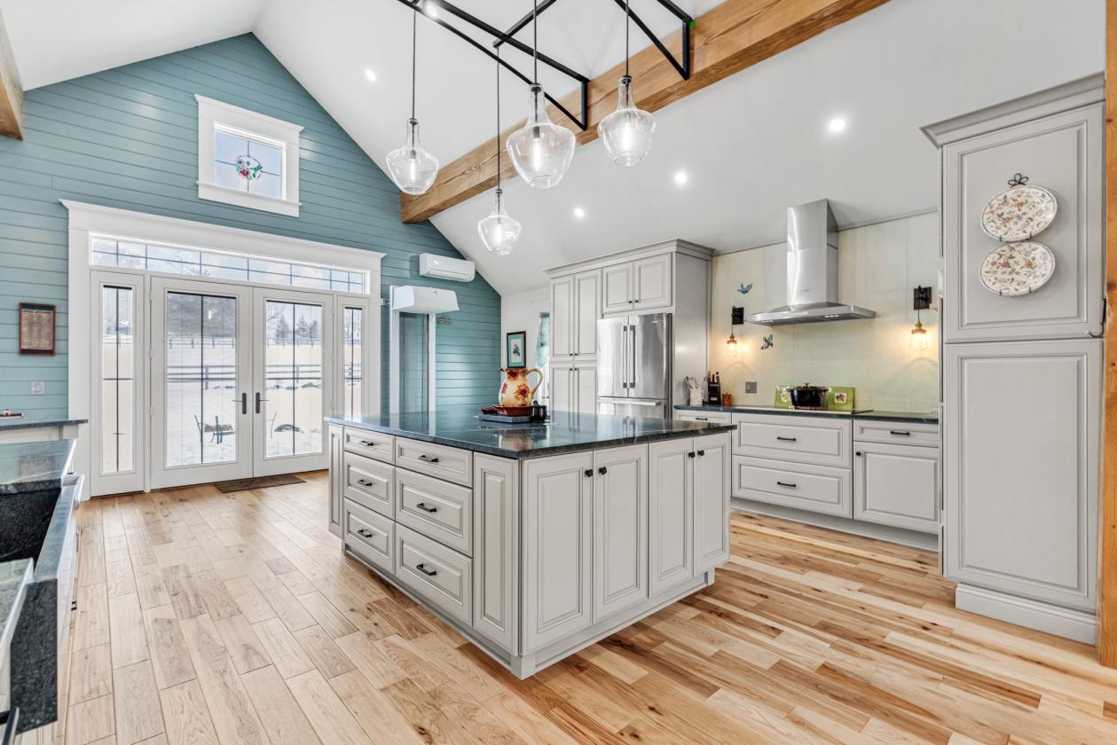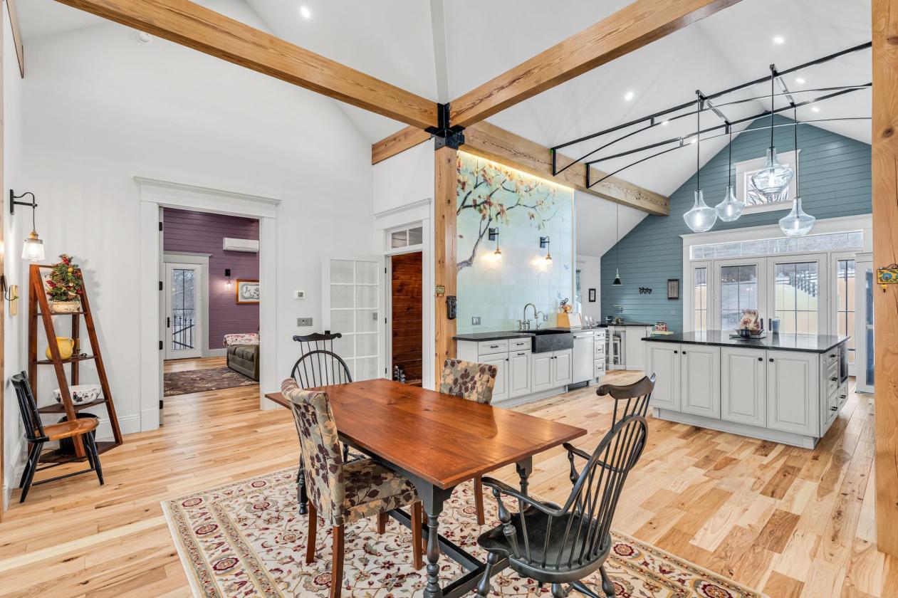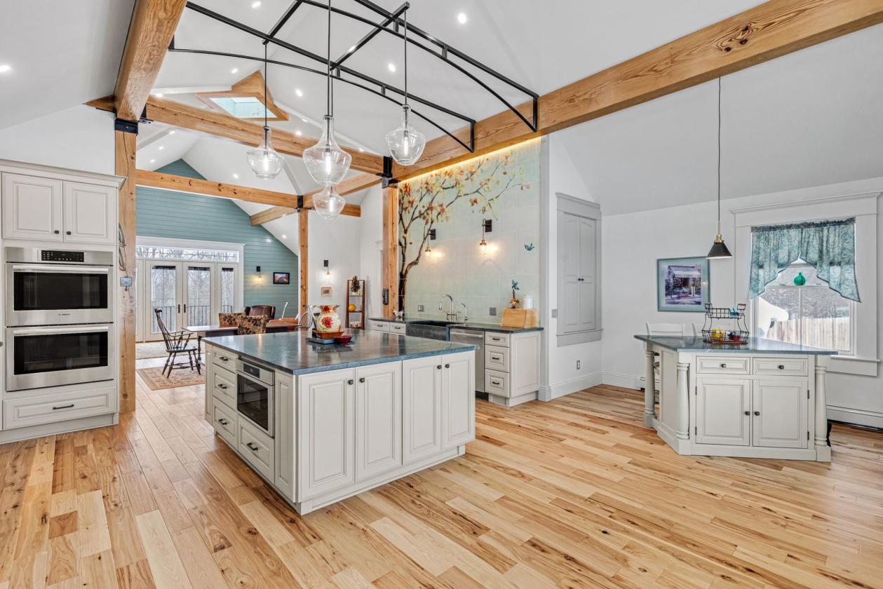 - The heart of the home is a beautifully appointed chef’s kitchen, designed for both entertaining and everyday use. It features custom cabinetry, a premium appliance package, an expansive green soapstone island, hand-crafted artistic tile backsplash, and a farmhouse sink. Hand-scraped hickory hardwood floors extend throughout the living areas, adding warmth and durability well suited to a country estate lifestyle.