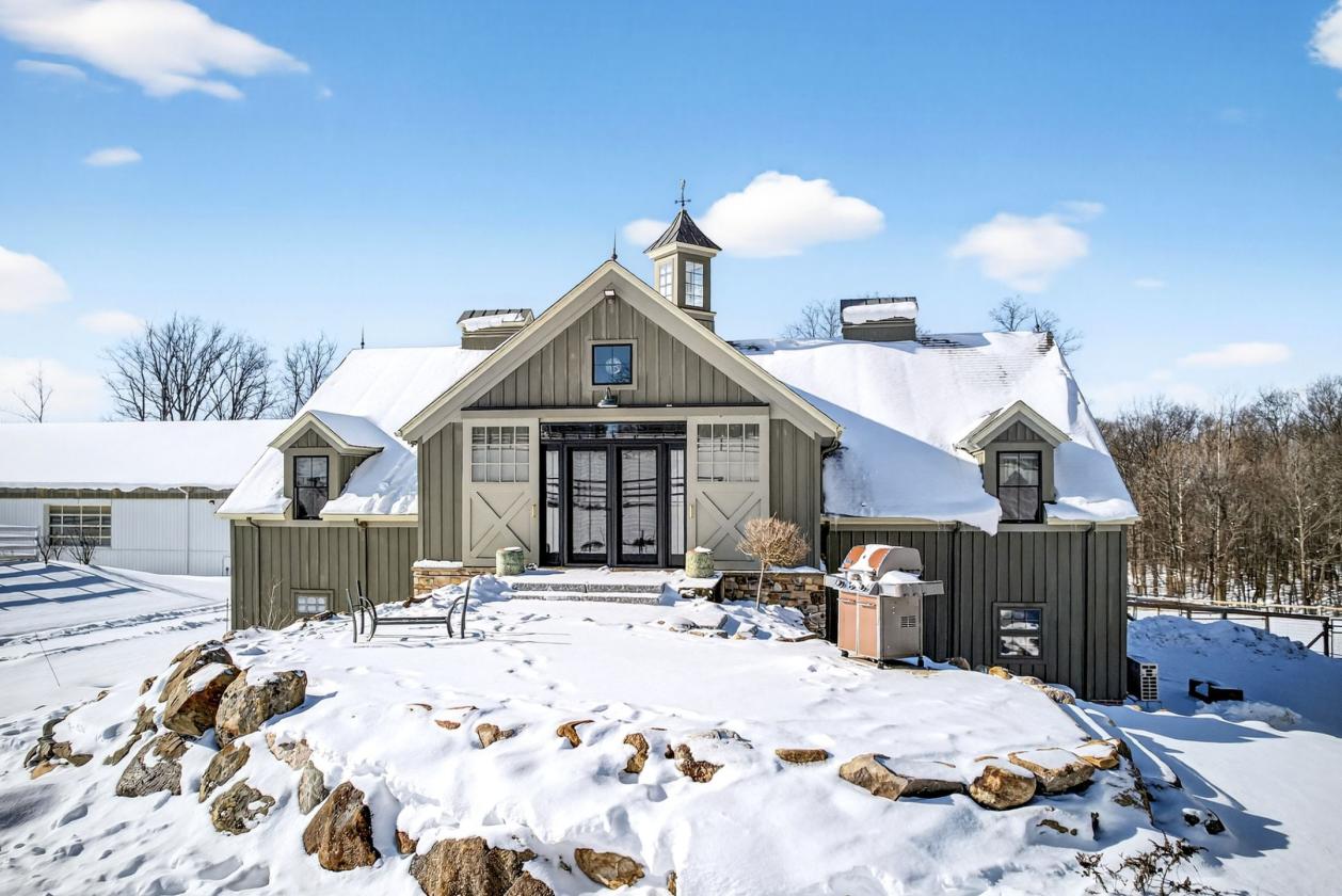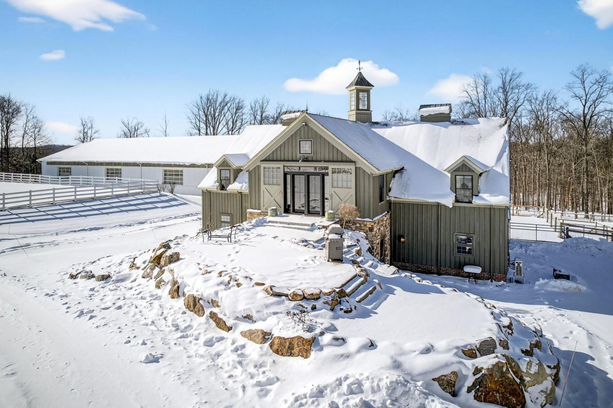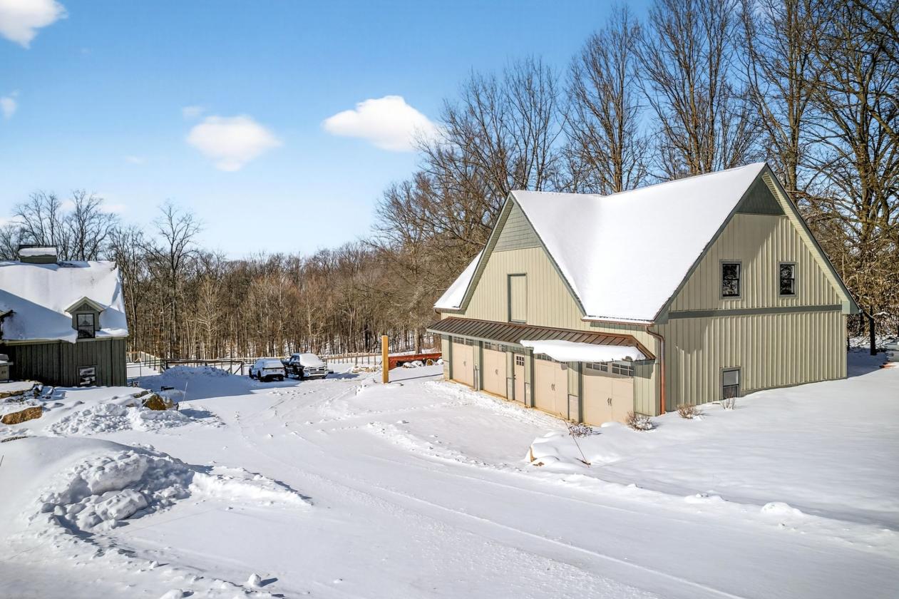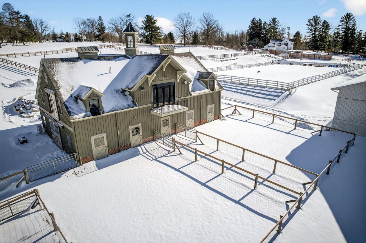 Perched at one of the highest elevations in Geauga County and bordering the Holden Arboretum, this exceptional equestrian estate offers panoramic views, remarkable privacy, and direct access to miles of scenic riding trails from the property. Located in Chardon and in Chardon schools, it combines everyday convenience with a country lifestyle. The Tony Paskevich designed residence has been extensively renovated with luxury, comfort, and long-term livability. A new elevator allows for effortless movement throughout the home. Vaulted ceilings with exposed beams, custom architectural details, and an abundance of natural light define the interiors. The chef’s kitchen features custom cabinetry, an expansive green soapstone island, artistic tilework, and hand-scraped hickory floors. Spa-inspired bathrooms include an 8 x 6 zero-entry shower and a soaking tub, blending elegance with thoughtful design. The equestrian facilities are purpose-built for daily function and year-round use. The 7-stall barn offers direct turnout access from five stalls, a dedicated wash bay with integrated drainage. All pastures are enclosed with newly installed three-rail fencing, providing durability & safety. A newly constructed oversized 50’ x 30’ four-car garage with an upper-level hay loft complements the barn and offers exceptional storage and operational efficiency. Anchoring the property is a fully insulated, steel-trussed 100x180 indoor riding arena designed to accommodate multiple disciplines. A full perimeter of see-through garage doors fills the space with natural light and, when opened, creates a rare indoor-outdoor riding experience ideal for Northeast Ohio’s seasons. Additional highlights include a thoughtfully designed garden area featuring a waterfall, koi pond, greenhouse, red cedar raised beds, and newly planted fruit trees. This is a rare opportunity to own a comprehensively designed estate where luxury living, accessibility, and equestrian excellence exist in seamless balance.