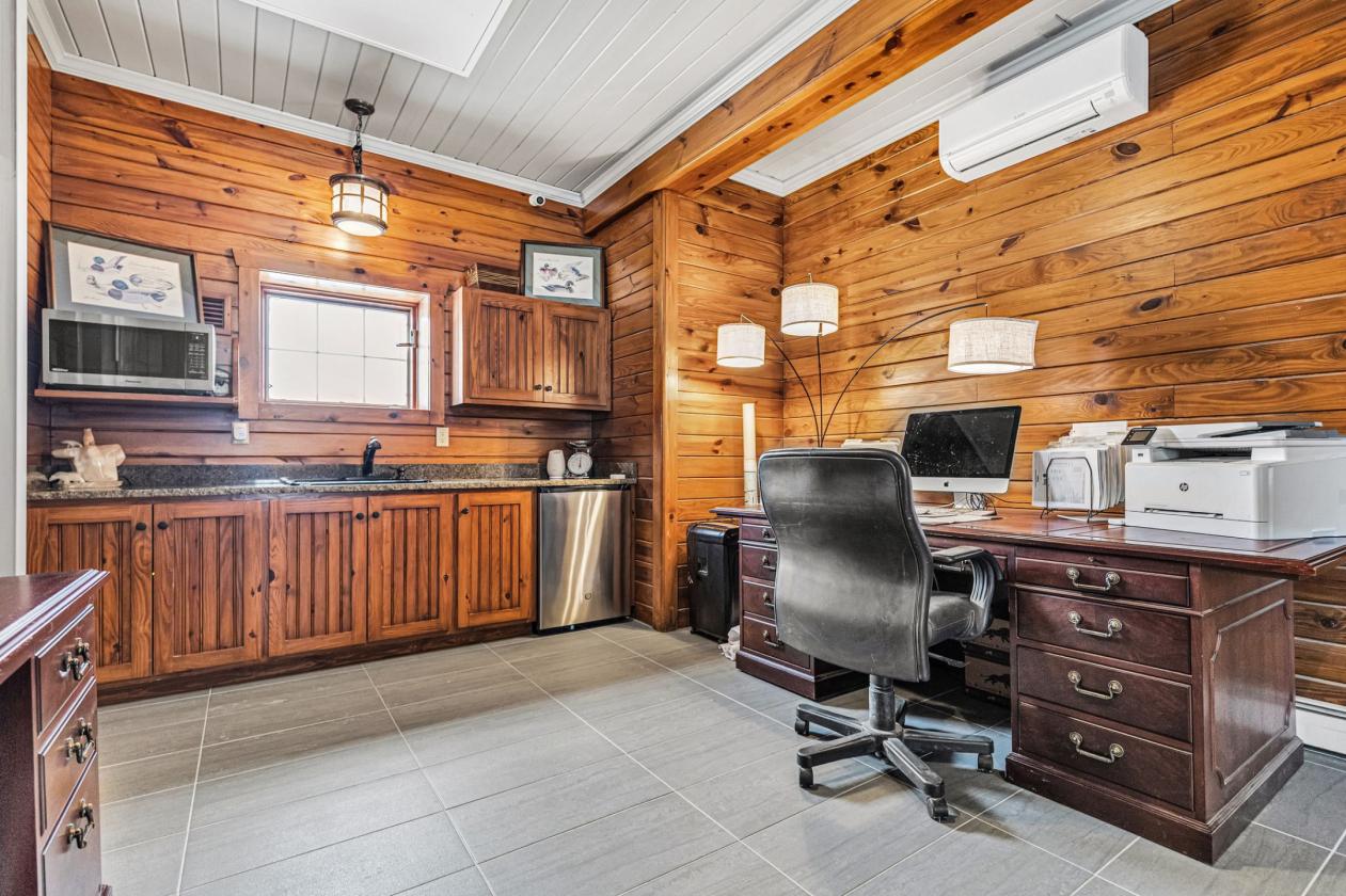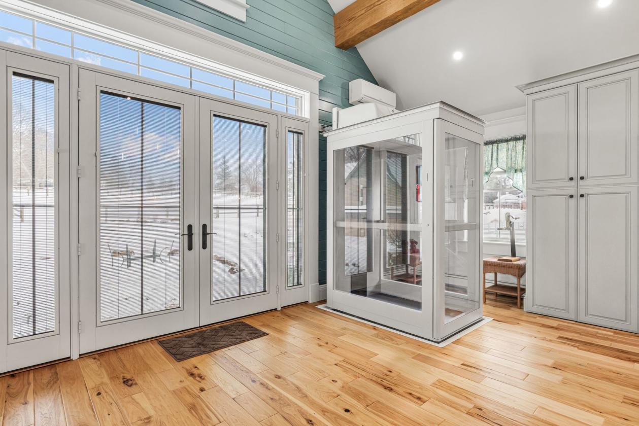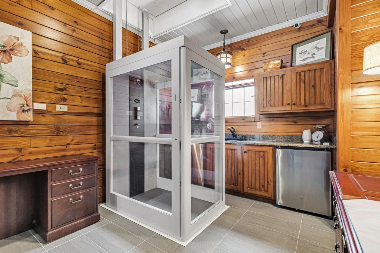 - Throughout the residence, 42-inch-wide doorways and a discreet, newly installed shaftless elevator provide seamless accessibility across all levels. This is true universal design—integrated thoughtfully so the home feels elegant and expansive rather than adapted. Vaulted ceilings with exposed beams, custom architectural details, and abundant natural light create warm, inviting spaces that feel both substantial and comfortable.