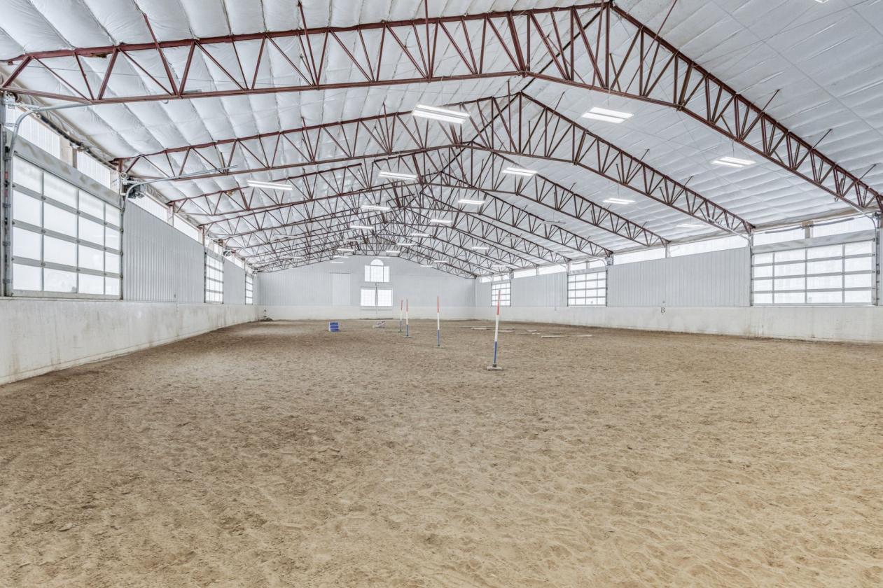 - Anchoring the equestrian infrastructure is a fully insulated indoor riding arena measuring approximately 100’ x 180’, constructed with steel clear-span trusses to eliminate interior support posts and maximize usable riding space. Designed to accommodate multiple disciplines, the arena offers true four-season functionality in Northeast Ohio’s climate. A full perimeter of see-through garage doors surrounds the arena, flooding the space with natural light and creating an open, airy environment rarely found in indoor facilities. When opened, these doors provide natural ventilation and deliver a seamless indoor-outdoor riding experience, allowing riders to enjoy the feel of being outside while remaining protected from the elements.