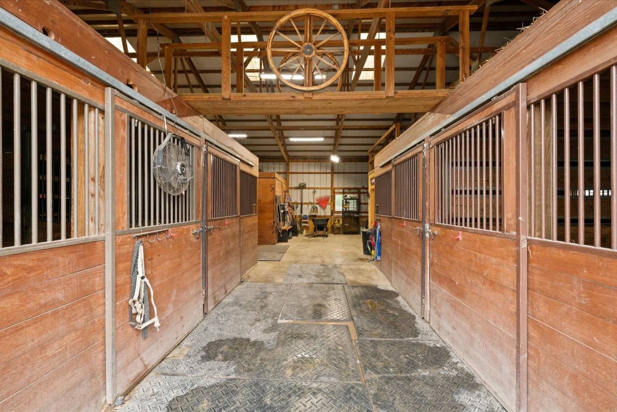 - Morton-built indoor sand riding arena with 8 stalls, tack room, feed room, water, exhaust fans and individual fans in stalls.