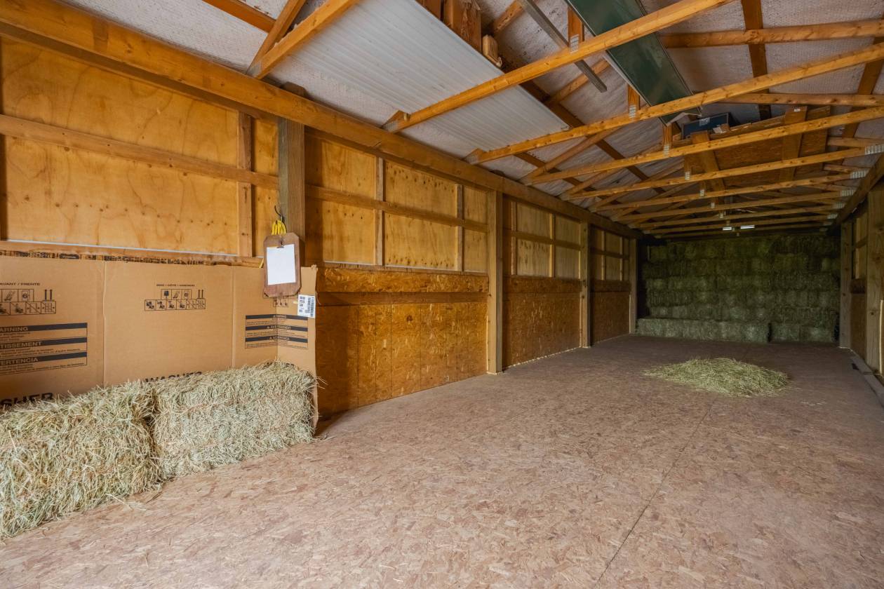 - Equestrian amenities include a monitor-style stable with six fully matted stalls—one 10x12 and five 10x10—set on packed clay and limestone. The 8x11 tack room features a concrete floor, electrical outlets, and overhead lighting, offering generous space for tack and supplies. Each stall is equipped with exterior outlets for heated buckets, clippers, or fans, and the concrete aisle ensures easy maintenance. The loft above accommodates approximately 500 bales of hay. The land is ideally configured for grazing and riding. You'll find a 2.5-acre front pasture, a 1.5-acre back pasture, and two smaller pastures—ideal for turnout or training—totaling roughly 1 acre. A 5-acre hay field provides additional options for rotational grazing and could easily be fenced. The property is fully enclosed with coated fencing for safety and durability.