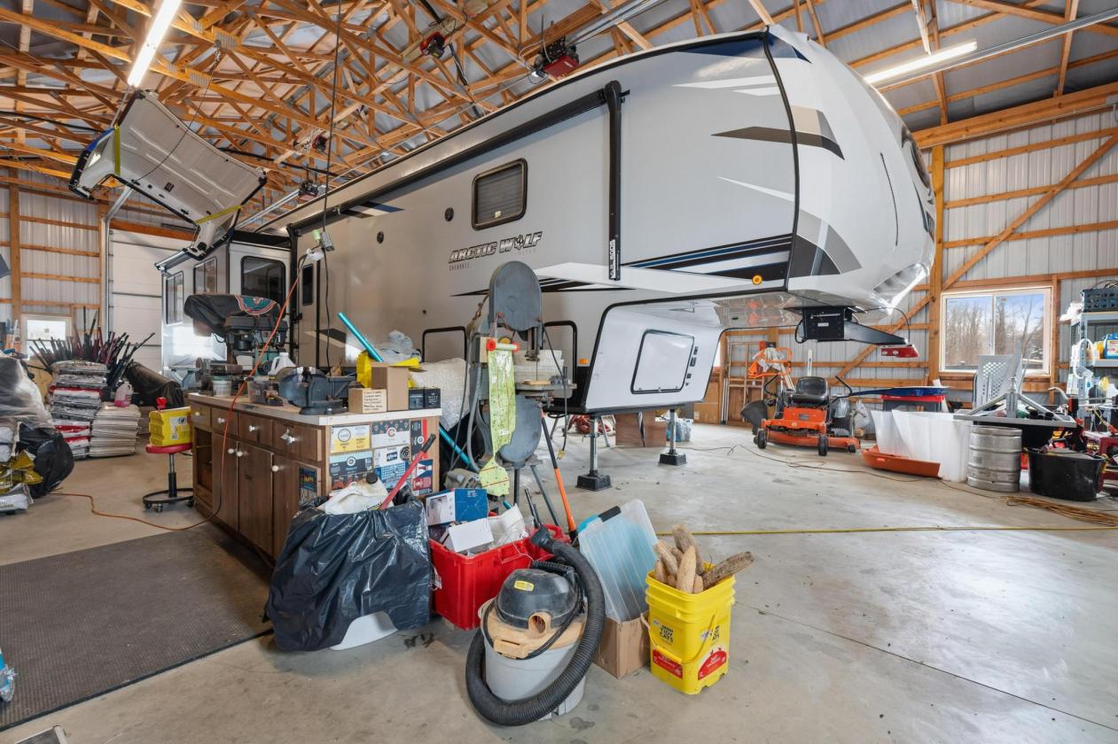 - Large Garage/Indoor RV parking area attached (2 Overhead Automatic 14' doors)