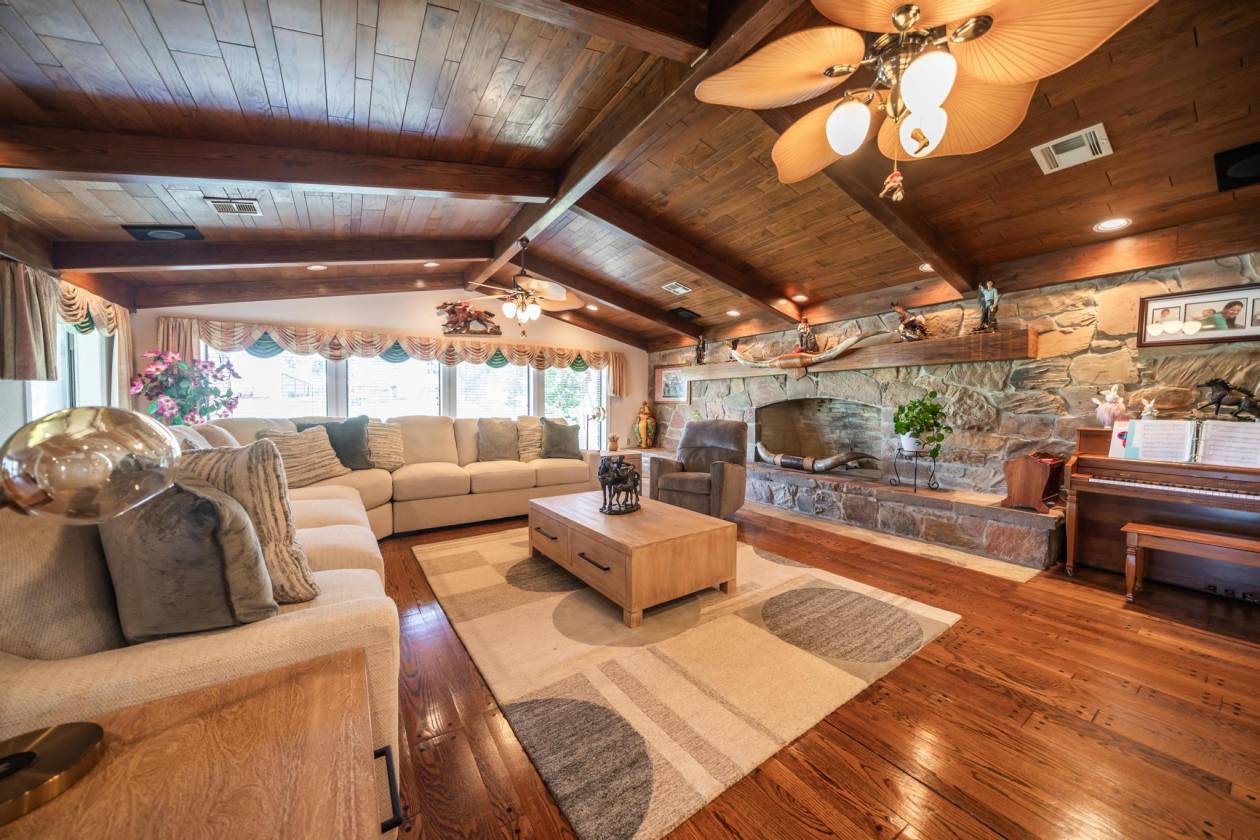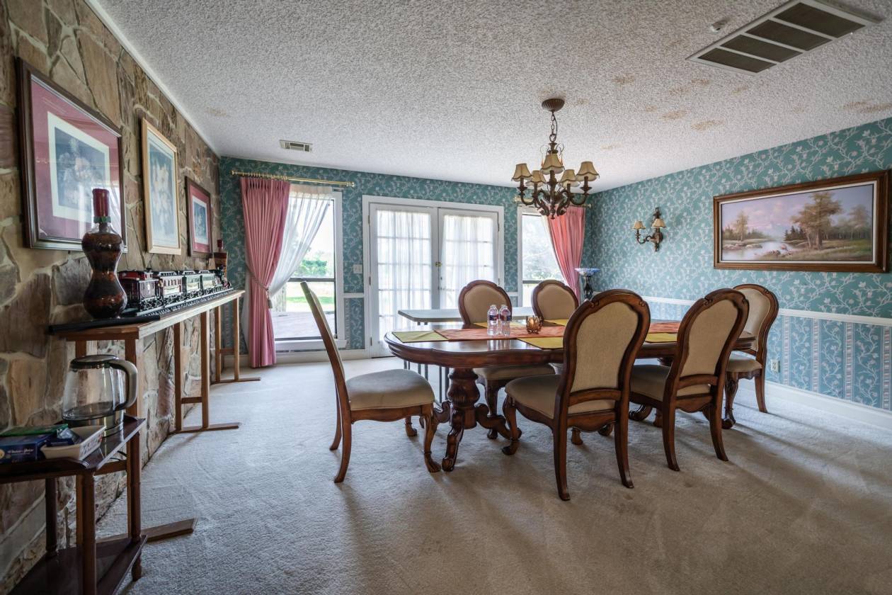 - Additional structures at the headquarters include the main ranch residence, ideally situated just inside the front gate. This spacious 5,147-square-foot home features 4 bedrooms and 3 bathrooms, offering comfortable accommodations for owners or ranch managers. The interior boasts a large open-concept great room, an additional living area, and a formal dining room—perfect for both relaxed living and entertaining. Positioned to overlook a scenic pond, the home provides a clear view of the main ranch headquarters, blending privacy with a commanding vantage point of daily operations.