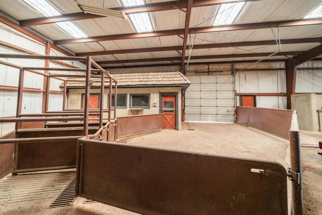 - The STAR brand headquarters building offers 13,440 square feet 192'x70' of wide-span open space with 18-foot ceilings, designed to support high-volume equine operations. Located just beyond the front gate, the main building is thoughtfully positioned for optimal access and efficiency. It features six offices, a kitchen and bathroom, a large tack room, and three custom wash bays with built-in drains. Multiple roll-up doors provide easy access to adjacent loafing barns, and the all-concrete flooring supports heavy-duty use—currently utilized for equipment storage. Originally serving as the central hub of ranch operations, this versatile facility is surrounded by pens and arenas, and presents a wide range of potential uses beyond its initial design.
