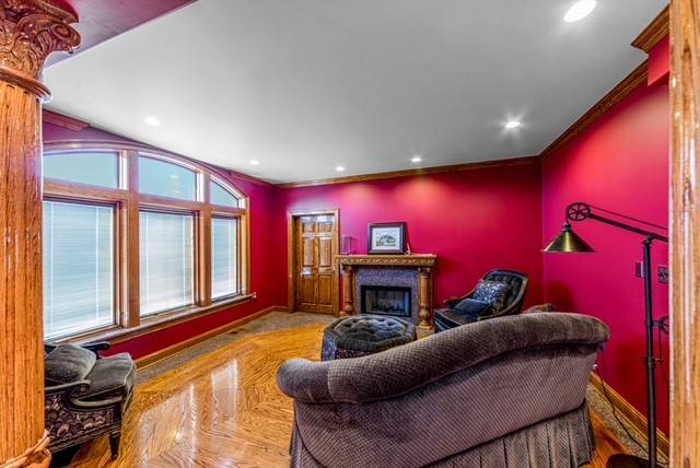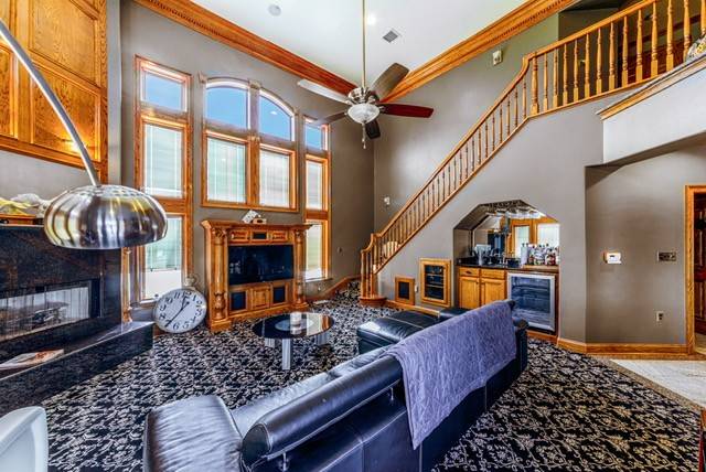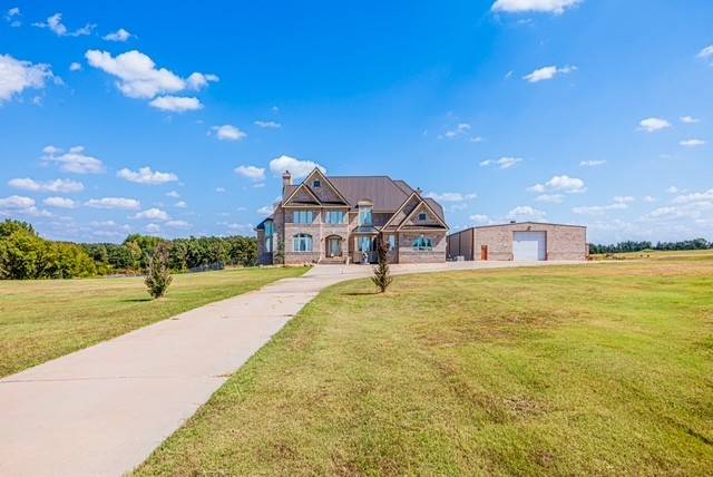 - Designed for entertaining and luxurious country living this home showcases 6 bedrooms and 4.5 bathrooms, and over the top craftmanship throughout. Enter through the grand foyer into a home filled with light, soaring ceiling, and 4 fireplaces. The main level features multiple living and dining areas, a chef's dream kitchen with gas and electric cooktops, double ovens, microwave, ice maker, bun warmer, commercial hood, and commercial refrigerator, pus both a butlers panty and a kitchen pantry. The family room includes a wine bar and a two-story ceiling, perfect for entertaining. The primary suite is a private retreat with double walk-in closest and fireplace, sitting area over looking the property, jacuzzi tub, separate shower, and double sinks. Other interior highlights include a theater room (equipment remains), sunroom overlooking the pond and the storybook tree, safe room or second office, elevator, lift chair, two full kitchens and three living spaces, built-ins throughout, and wood, carpet, marble and imported Italian travertine flooring. The homes design offers multiple balconies, a walk-out basement, covered patios, and outdoor lighting that complement the stunning rural setting. The long concrete driveway provides plenty of parking and leads to a three car garage with built-ins.
