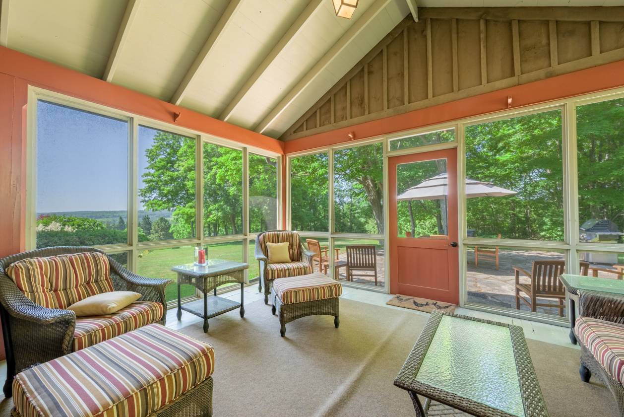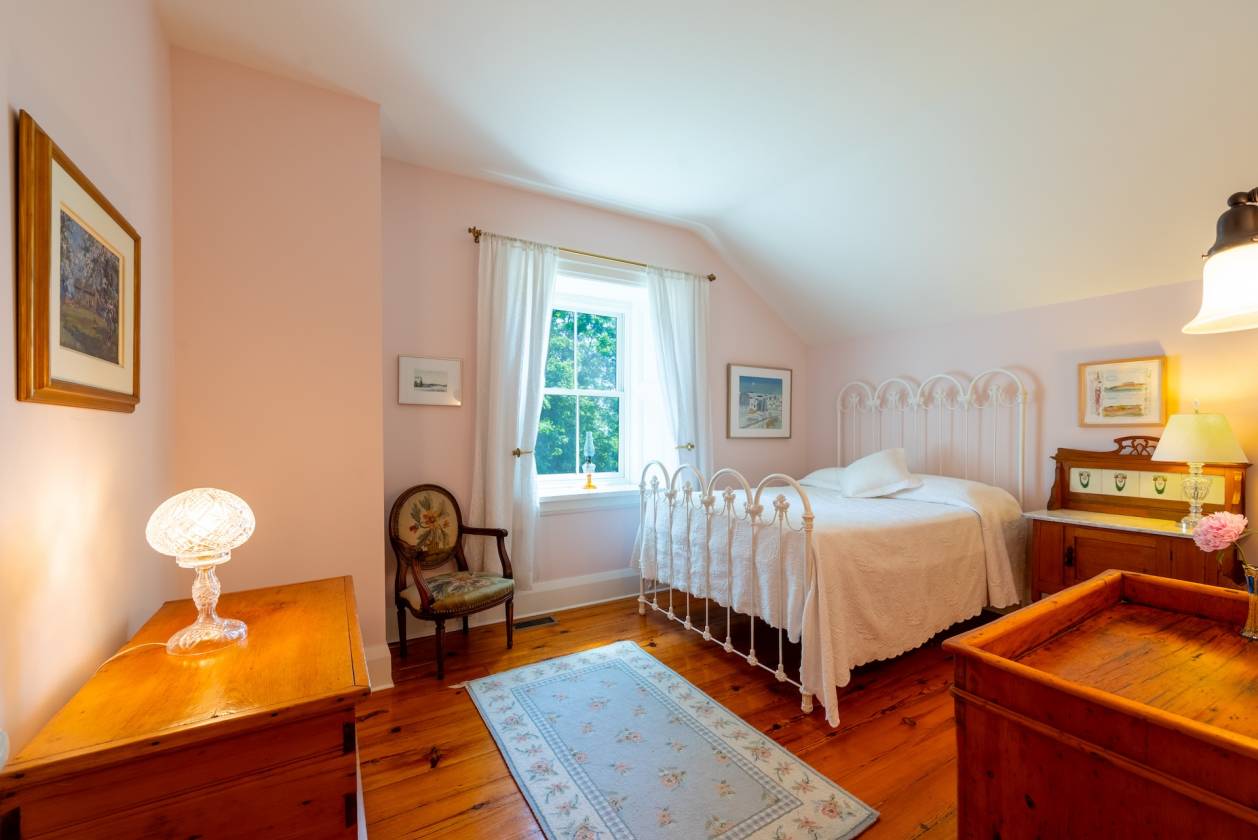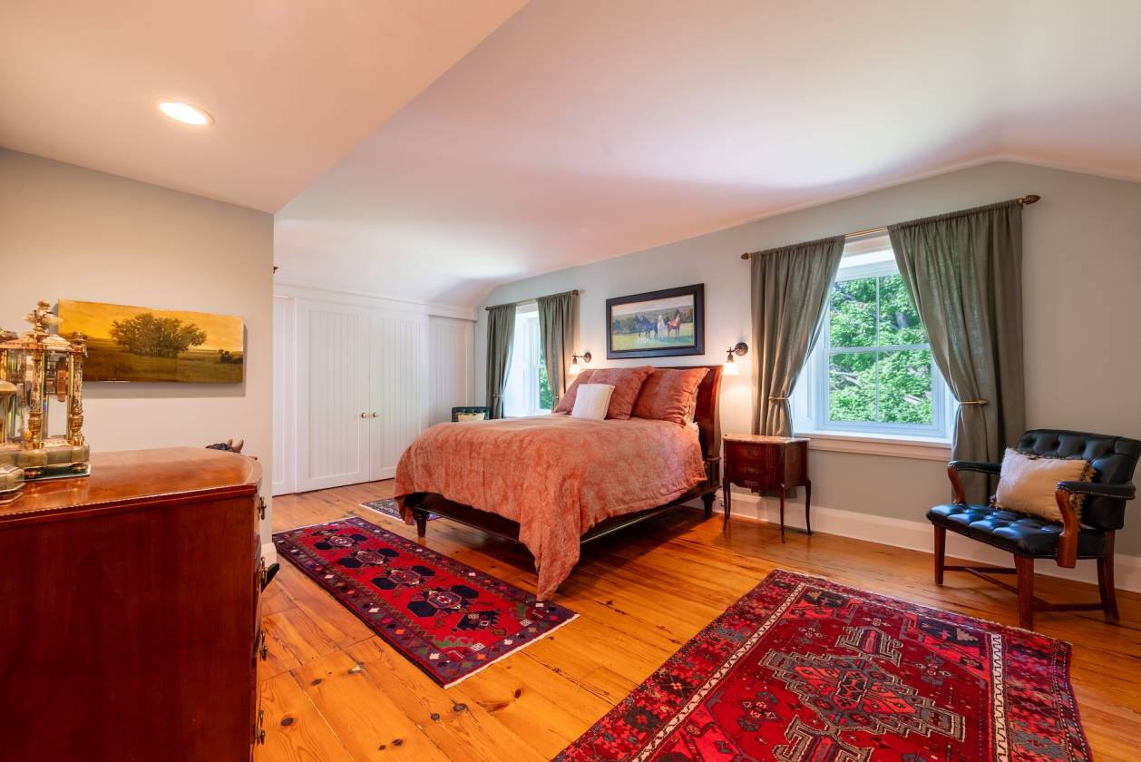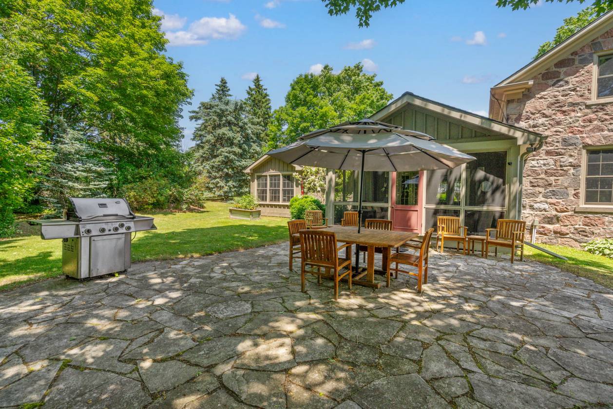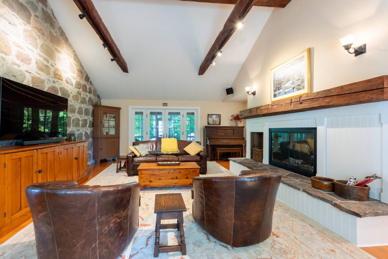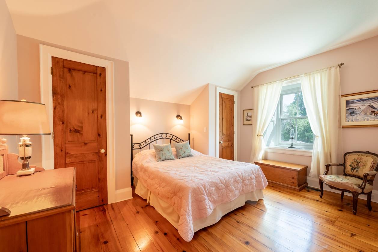 The centrepiece is an 1856 Century Stone Home, painstakingly restored and thoughtfully expanded with a handsome board-and-batten addition. Step inside and you’re greeted by the warmth of original hardwood floors, handcrafted wainscoting, and fireplaces that have anchored family gatherings for generations. Yet, the comforts are entirely modern: a bright, welcoming kitchen, elegant dining room, and a screened porch that invites long summer evenings overlooking the grounds.