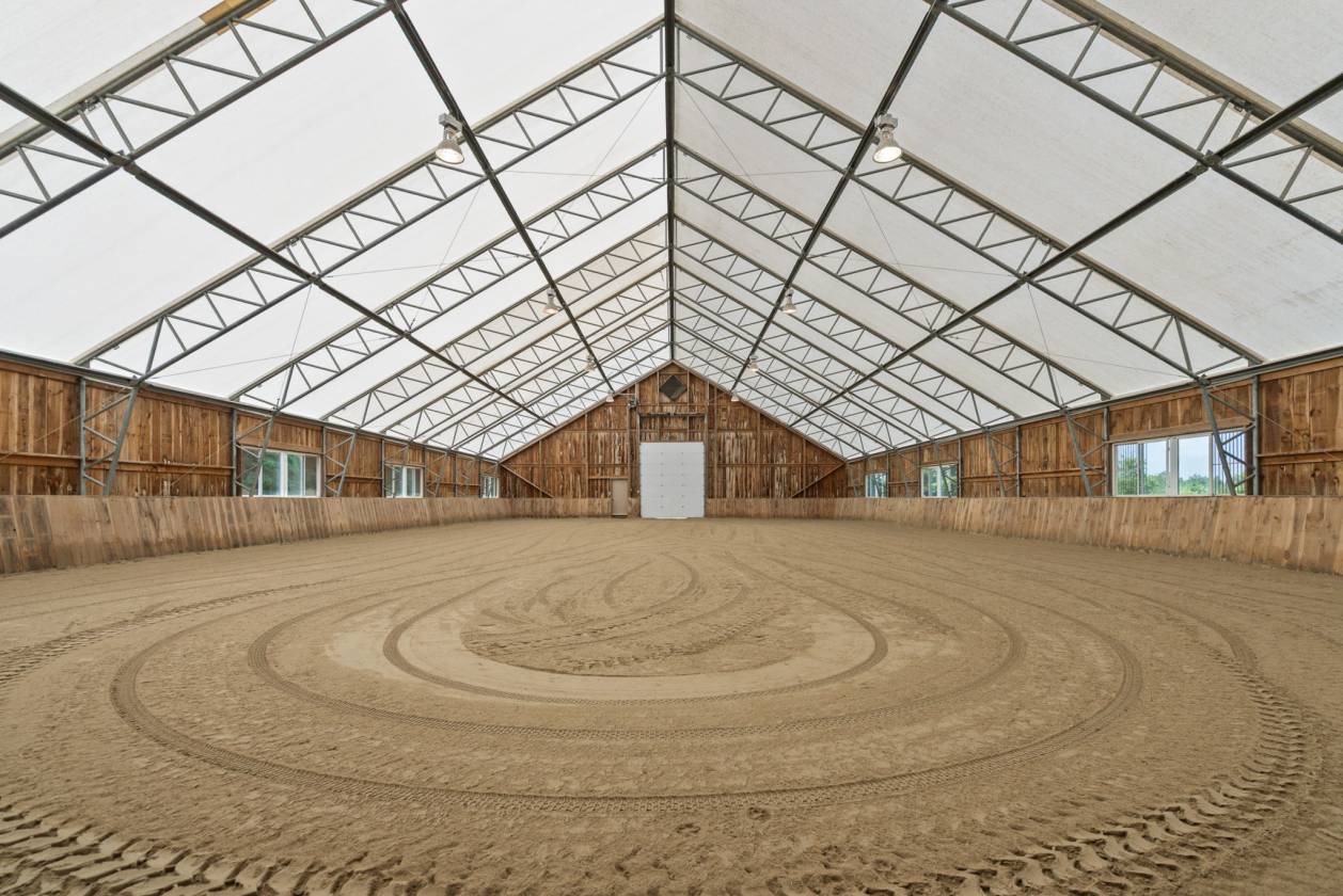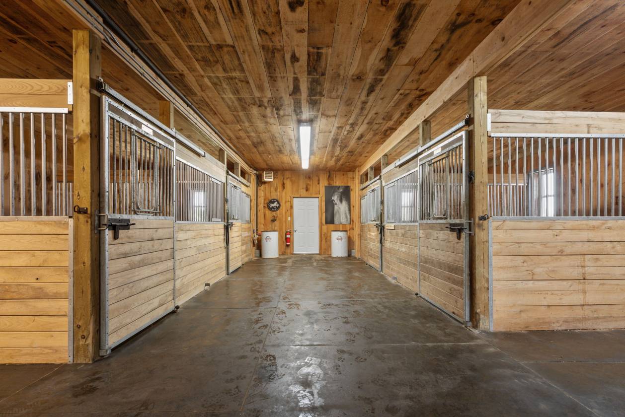 Beyond the home lies the heart of the estate: equestrian facilities that would satisfy even the most discerning rider. The heated six-stall barn comes complete with a tack room and viewing area, hay storage, and a washroom—a space designed for both practicality and pride. An attached 60’ x 120’ indoor arena ensures year-round training, while an outdoor sand ring, generous paddocks, and a large run-in shed give horses the freedom they deserve.