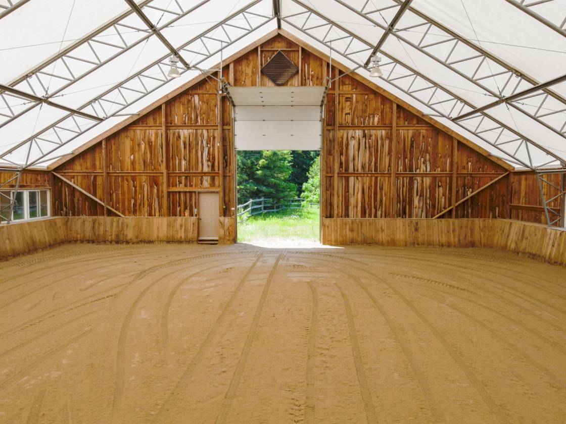 • Well designed 6 stall barn with heated tack rm with viewing area over looking the bright 60' x 120' indoor arena with 2nd floor hay storage.
