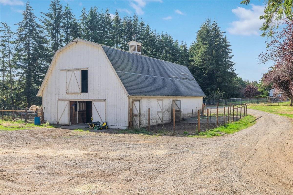 Discover the perfect blend of versatility, and outdoor recreation just 30 miles southeast of Portland, in close proximity to Oregon City. This exceptional estate features a spacious 6,530 sqft, 5-bedroom, 4-bathroom home set on 20 lush acres, offering a range of options with room for everyone, entertaining, and equestrian pursuits. The interior showcases soaring vaulted ceilings, Brazilian cherry hardwood floors, walls of large windows providing incredible natural light, and a seamless flow between multiple living, family, and entertaining areas—ideal for hosting gatherings or enjoying quiet family evenings. The chef’s kitchen offers granite countertops, stainless steel appliances, double ovens, a large butcher block island, and a copper farm sink overlooking pastures. The primary suite includes multiple walk-in closets and an expansive bathroom, perfect as a private retreat. The basement contains a cozy fireplace, kitchenette, and walk-out access to the inground pool and hot tub—perfect for summer entertaining or relaxing year-round. Designed for flexible living, the estate provides options for multi-generational households with ample space and storage galore. Outdoor features include a large pool, patio, and landscaped yard, creating a private tucked away setting. Equestrian amenities include a main barn with up to 18 stalls (12x12), hay and implement storage, a second barn with 5 stalls and attached runs, a 72x120 indoor arena with sand footing, ten fenced turnouts, and onsite riding and hiking trails through the forest—ideal for boarding, training, or personal riding. Additional highlights include a rooftop astronomy observatory, abundant hobbyist options, and a utility/mudroom with an elevated dog wash. An auxiliary garage with power stubbed for a shop or additional ADU. This property offers unparalleled outdoor living, equestrian facilities, and versatile living options—perfect for those seeking an all-in-one