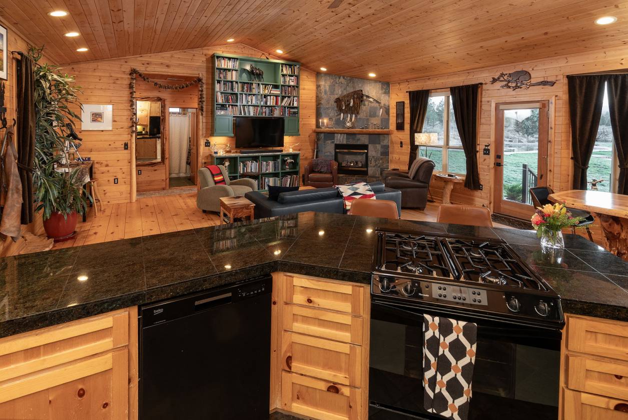 - Inside the home, natural elements & craftsmanship create an atmosphere of rustic elegance. Built as a single-story custom home by Steve Martin, it features vaulted knotty-pine ceilings & walls. Open concept floor plan flows between the living areas: the living room is anchored by a slate-surround propane fireplace &floor to ceiling built-in bookcase w/custom cabinetry & accent lighting. The country kitchen offers a propane cooktop, granite countertops, eating bar & adjacent pantry w/slate flooring matching the fireplace hearth. The primary suite is generously sized with an expansive walk-in closet, its en-suite bathroom is appointed w/granite countertops custom slate tile flooring surrounding a lg soaking tub & shower. A split floor plan provides two adtl bedrooms & full bath at opposite end of home for privacy. On the north side is a high-ceiling , insulated two car garage. This is a home built not just to shelter, but to inspire. The indoor comfort flows seamlessly outdoors allowing you to envision a private world-class equestrian estate.