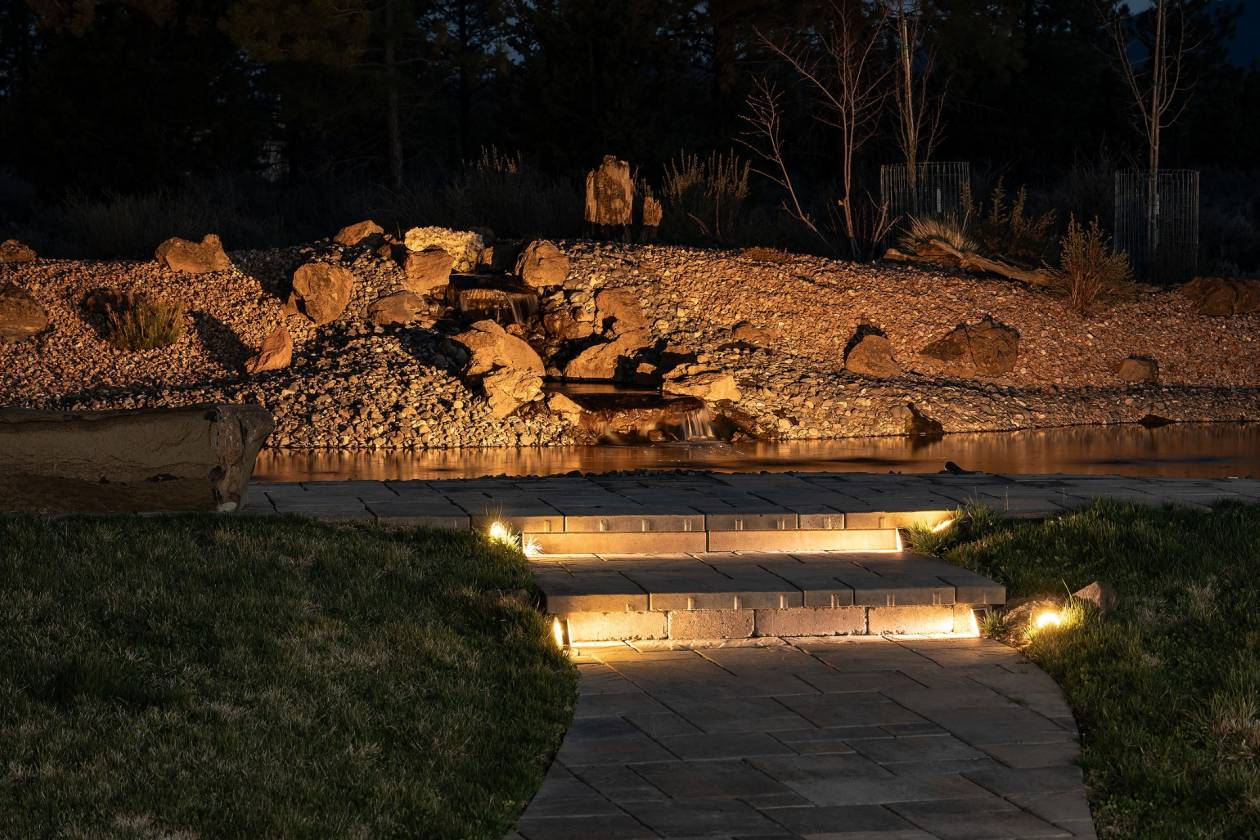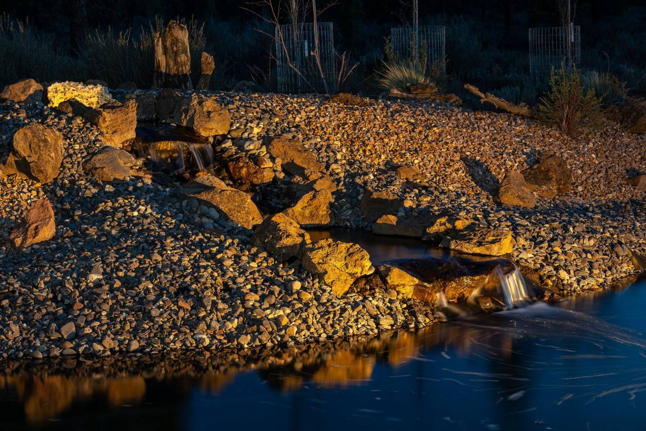 - Custom 15,000 -gallon pond, lined w/natural rock, gentle sloping pebble beach & basalt stone seating