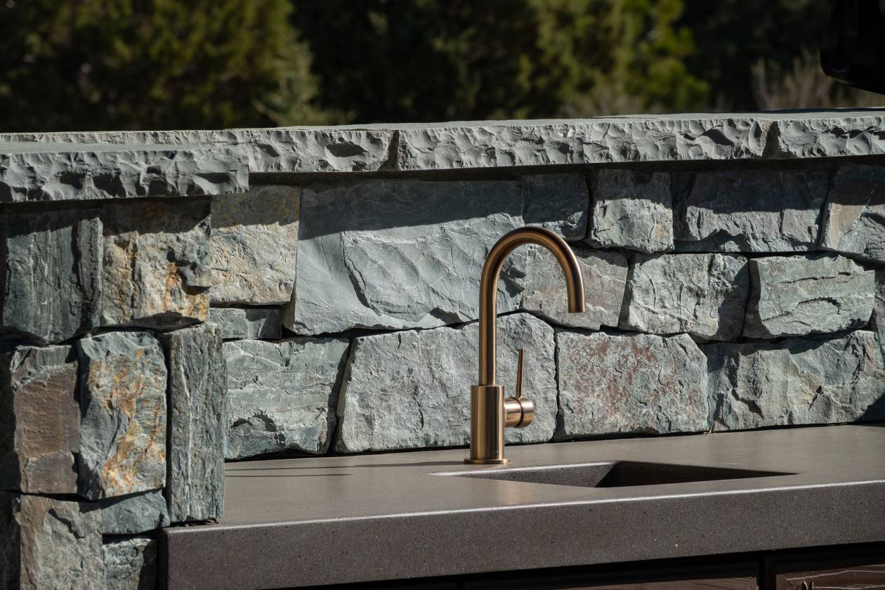- Vaulted timber Pergola designed by Nathan Good architects, outdoor kitchen built w/ Idaho glacial stone
