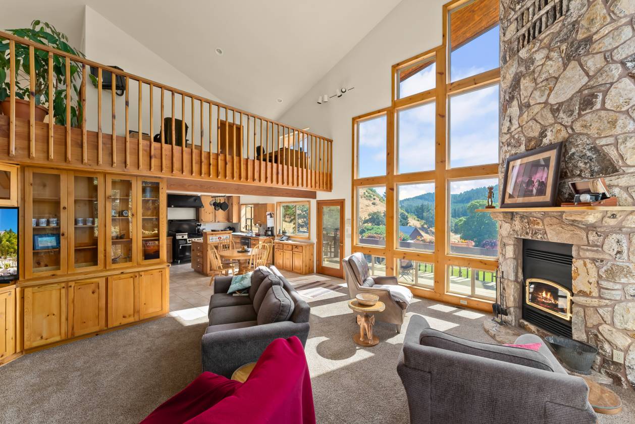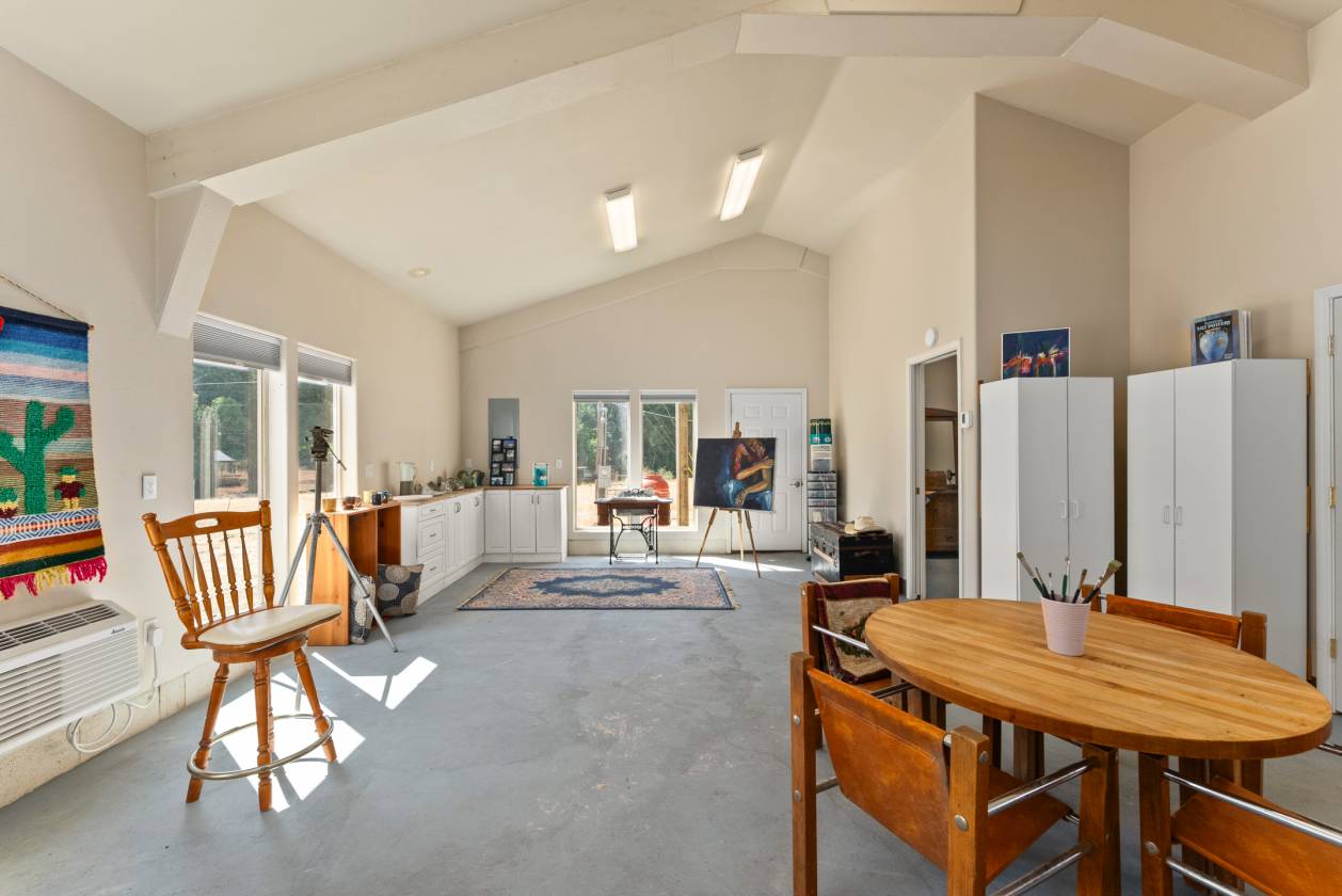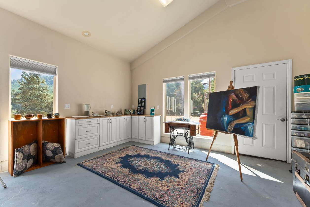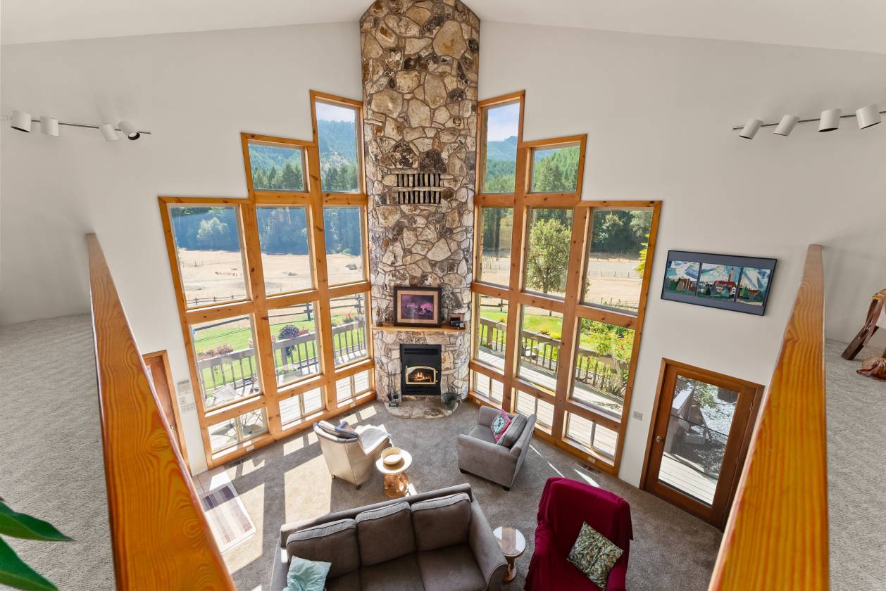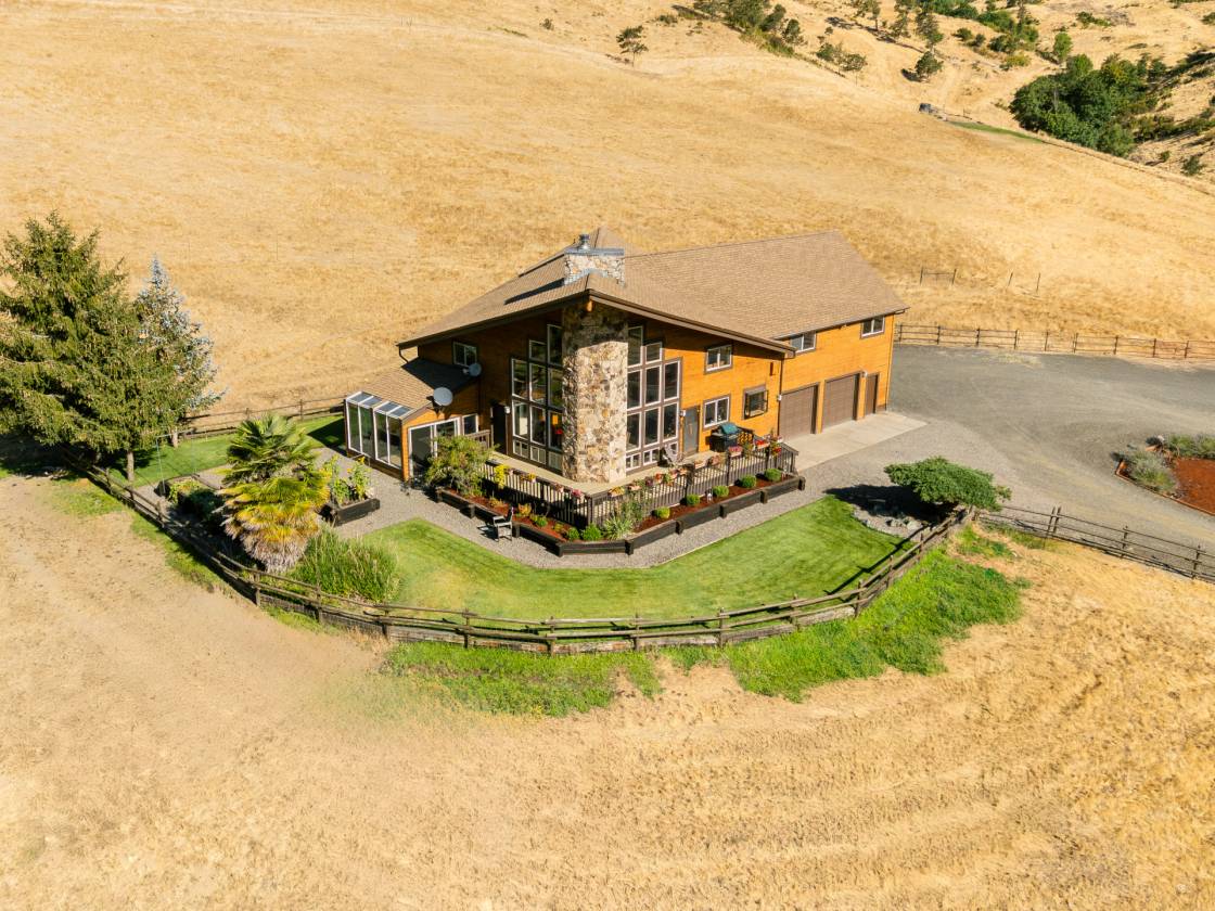 An Oregon Valley Sanctuary at it's finest. This exceptional working Ranch and custom-built ranch home sits on approximately 357 acres and is nestled in a valley with panoramic views of the hills, sunrise and sunset. Built in 1994, this one-owner home blends rustic charm with modern comfort. Grand 24' ceilings with a floor-to-ceiling river rock fireplace, and large windows that flood the living area with natural light while framing scenic views. The warmth of the fire and panoramic views are sure to warm the soul at anytime of the year. The kitchen boast a Gourmet Wolf propane stove, island, granite countertops and tile flooring. Upstairs you will find a large area to make into your game room, office, workout or entertainment area. There are two bedrooms, a bath and an office with plenty of storage throughout. Located on the main floor is the primary bedroom with a walk-in closet. From the primary bedroom you can enjoy your own private entrance to the solarium that hosts a hot tub for relaxation and enjoyment with views of the hills. The large two car garage offers lots of room for parking with an additional storage room, a covered carport, and room for RV parking. A solid concrete floor ADU has a private bath, kitchenette and ductless system. Make this studio yours for your next project, guest quarters or hobby room. A three bay machine shed with an enclosed one bay shop with 220W, two stalls with matts, tack room and grain room. Above the stalls and tack room there is ample room for storing hay or whatever you may need to stay dry. An approximately 100X200 arena with roping chute and catch pens sits down by a year round creek. Property is fenced for cattle and goats. A barn for the goats sits on the west end of the property. Currently there are approximately 250 goats and a handful of cows.