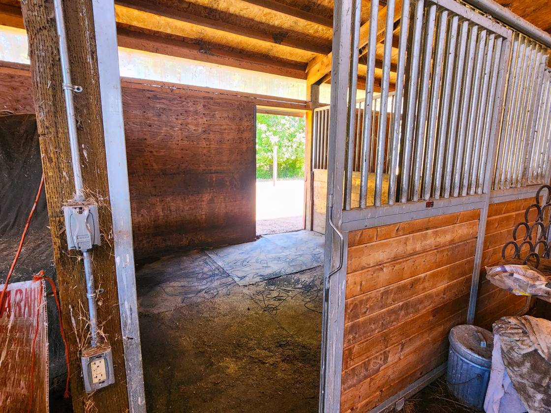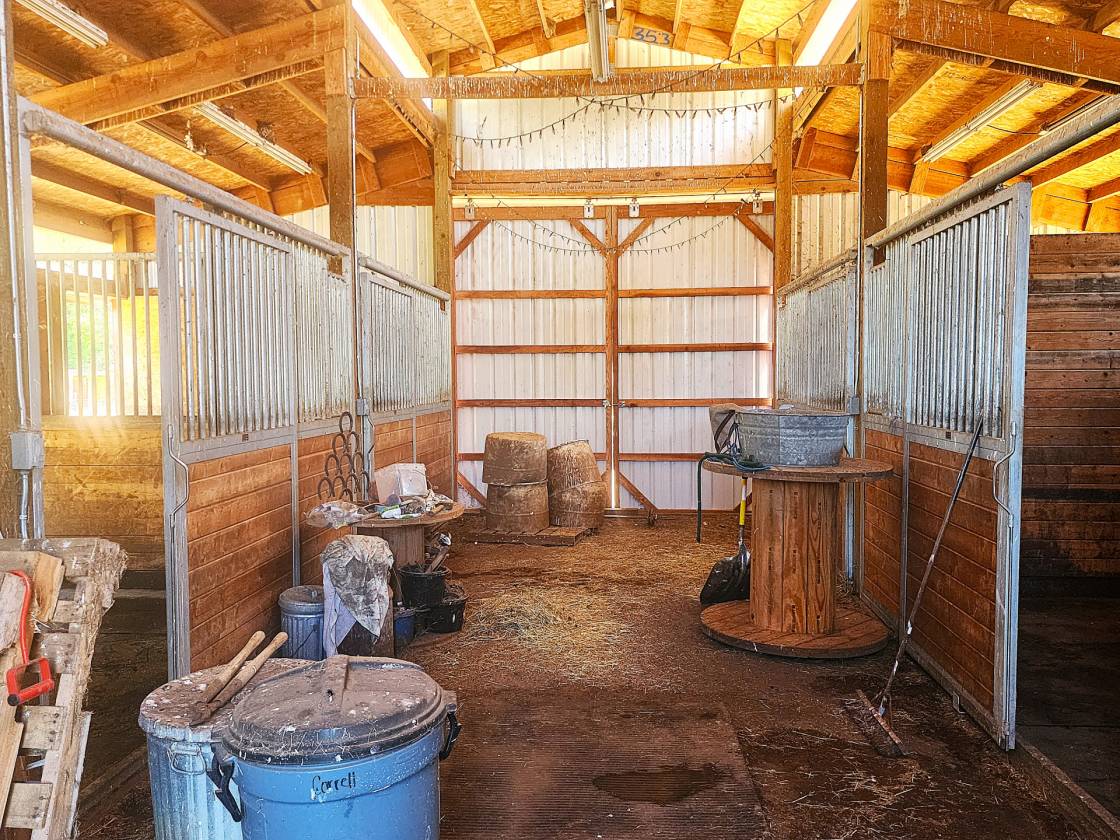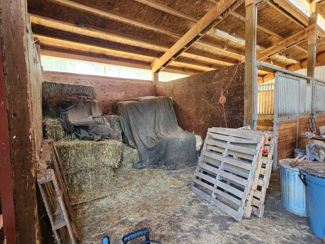 - Outbuildings include a hobby/tack room and a separate storage/canning room. A 3-bay ag building—perfect for hay storage, extra parking, or your favorite toys. Barn with 4 stalls, 2 equipment/tack rooms that could be extra stalls, ability to remove wall to expand stall for foaling and full water and electric access. Fenced and cross-fenced paddock space for livestock or horses.