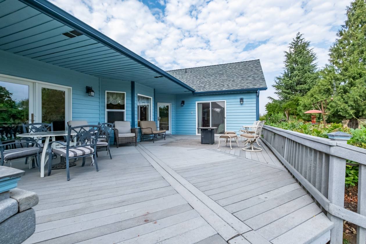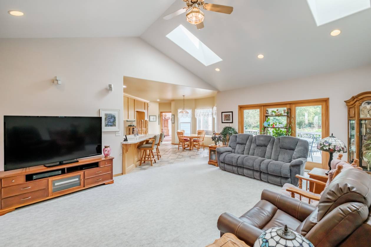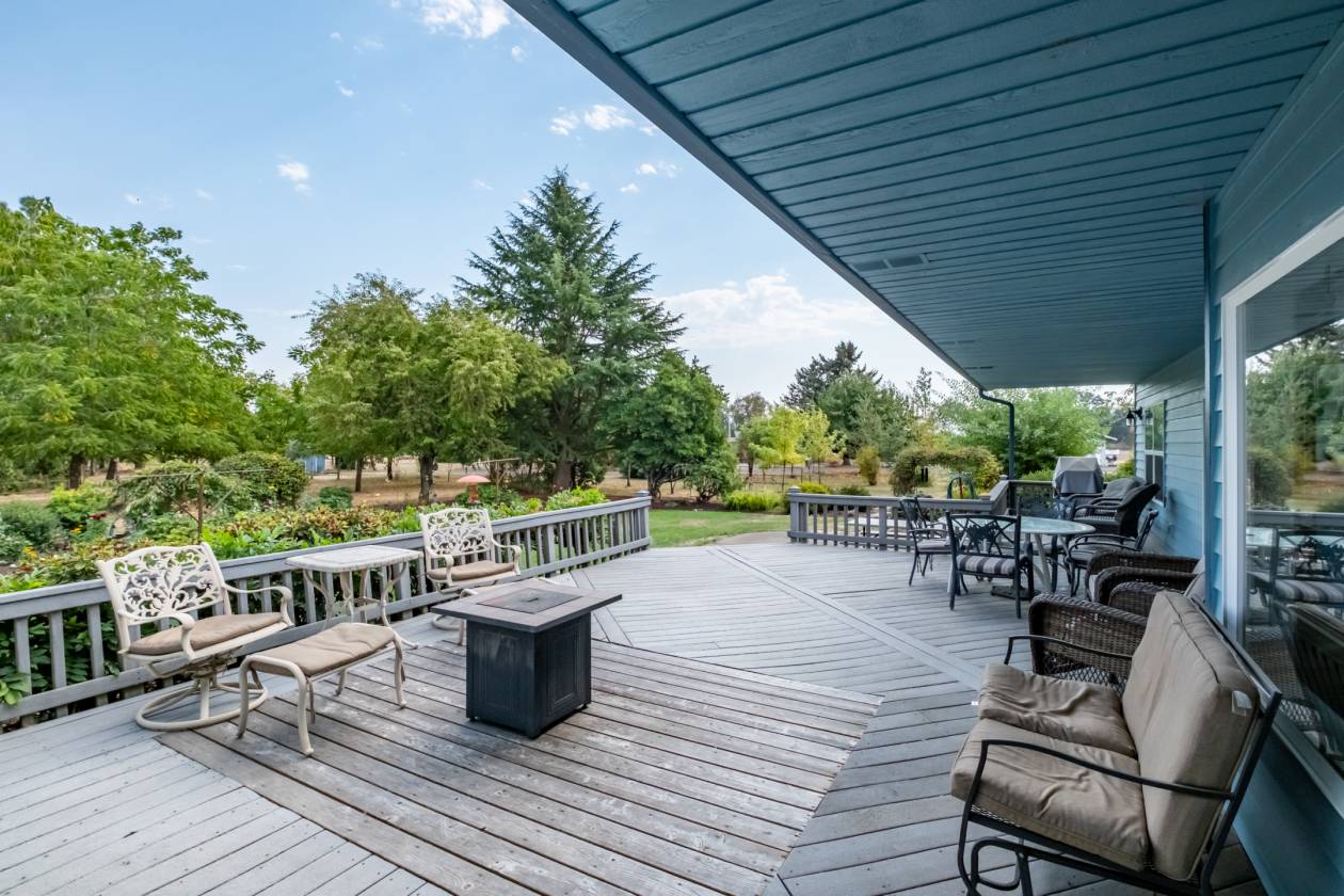 Entertaining is easy with patio doors leading to an extensive, huge deck for barbecues and gatherings. The grounds are a park-like setting with an abundance of berries, gardens, fruit trees, and nuts, all maintained by a full sprinkler system.