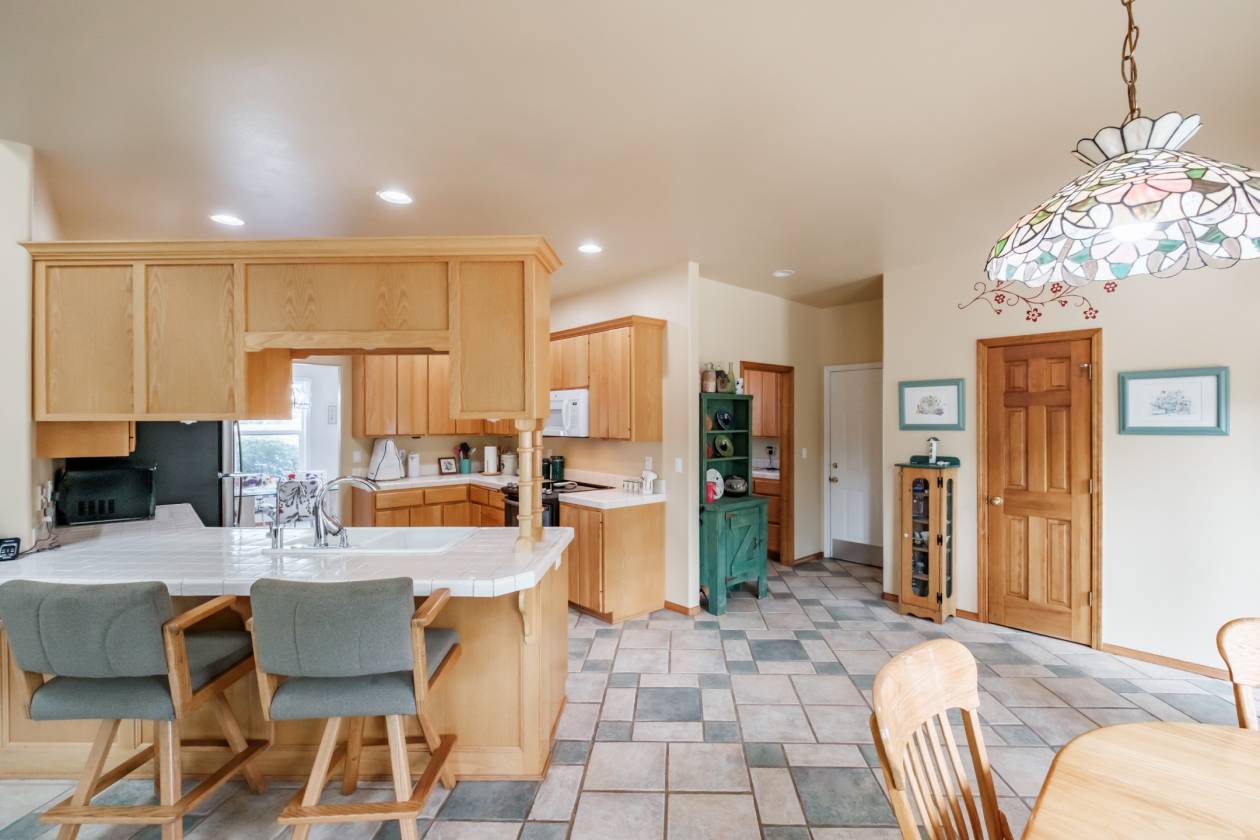 This great kitchen is ready for memory-making meals, featuring extensive tile countertops, cabinet space galore, and a walk-in pantry with its own countertops, perfect for a coffee bar. Eating bar for 4, breakfast nook looking out to the backyard, a formal dining room for those big dinners.