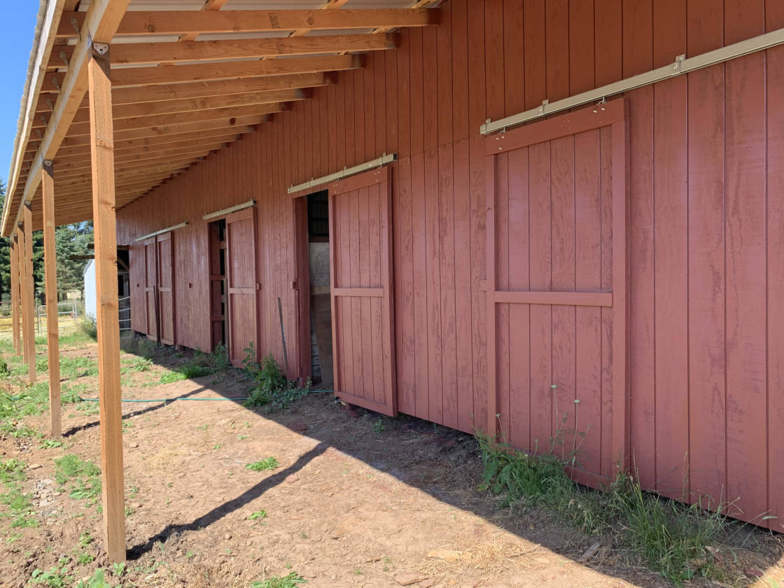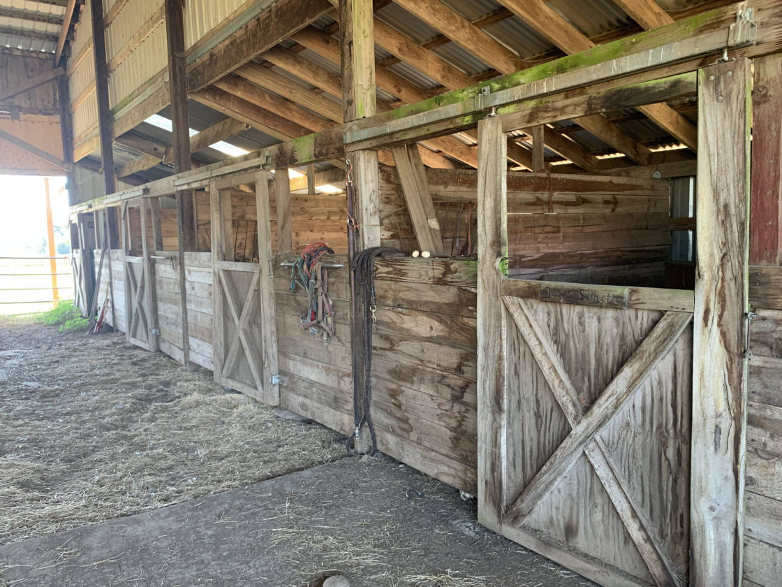 - Stable Barn: This barn is 60X84 with 10 stalls. Part of the building has a concrete floor which is excellent for hay and equipment storage. There are five stalls at the back of the barn with a new awning and area for nice stall runs. Some of the stalls are oversized stalls that could be used for foaling. There is a tack room that could be easily expanded. This building is open on east side and has a large sliding door on the south side for easy access.