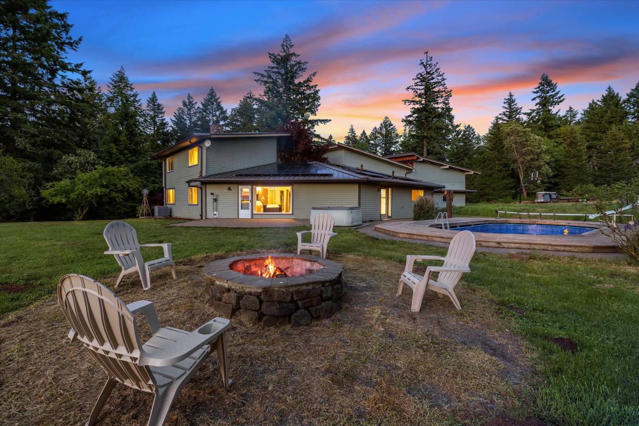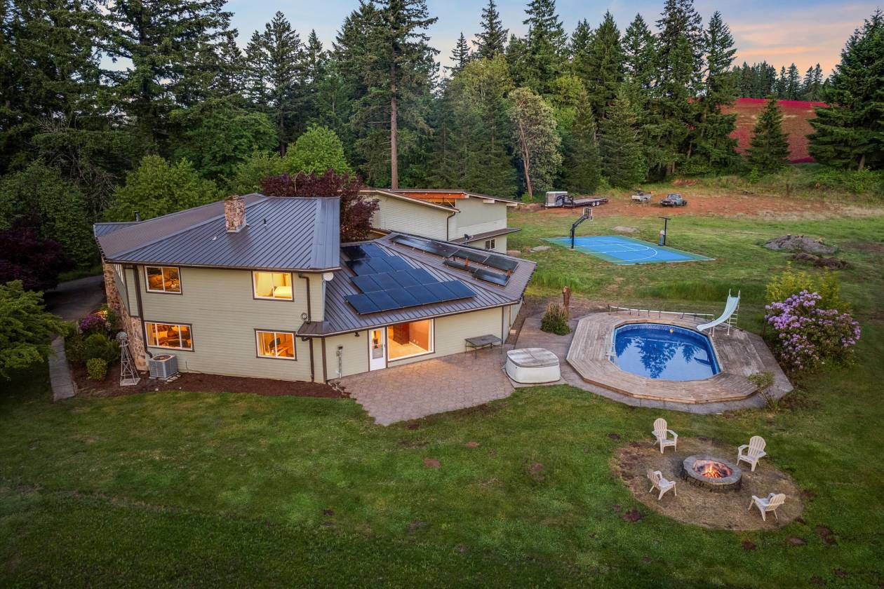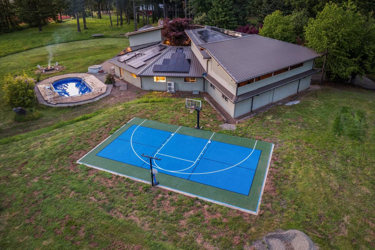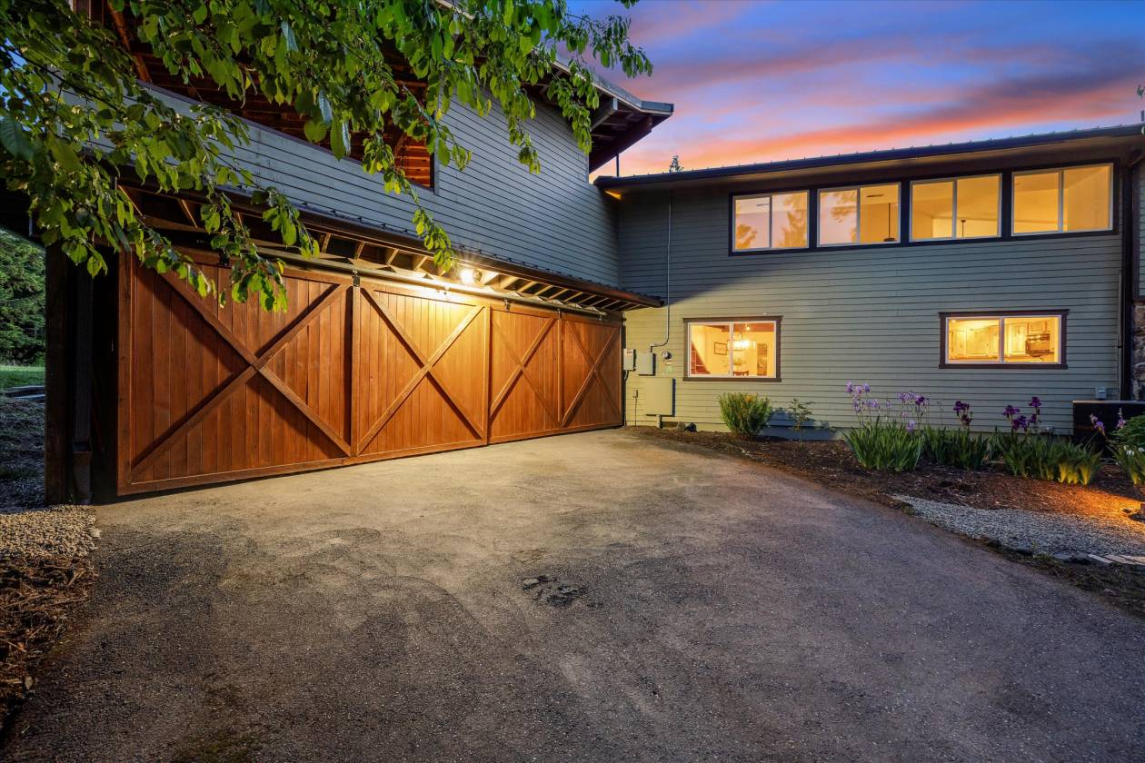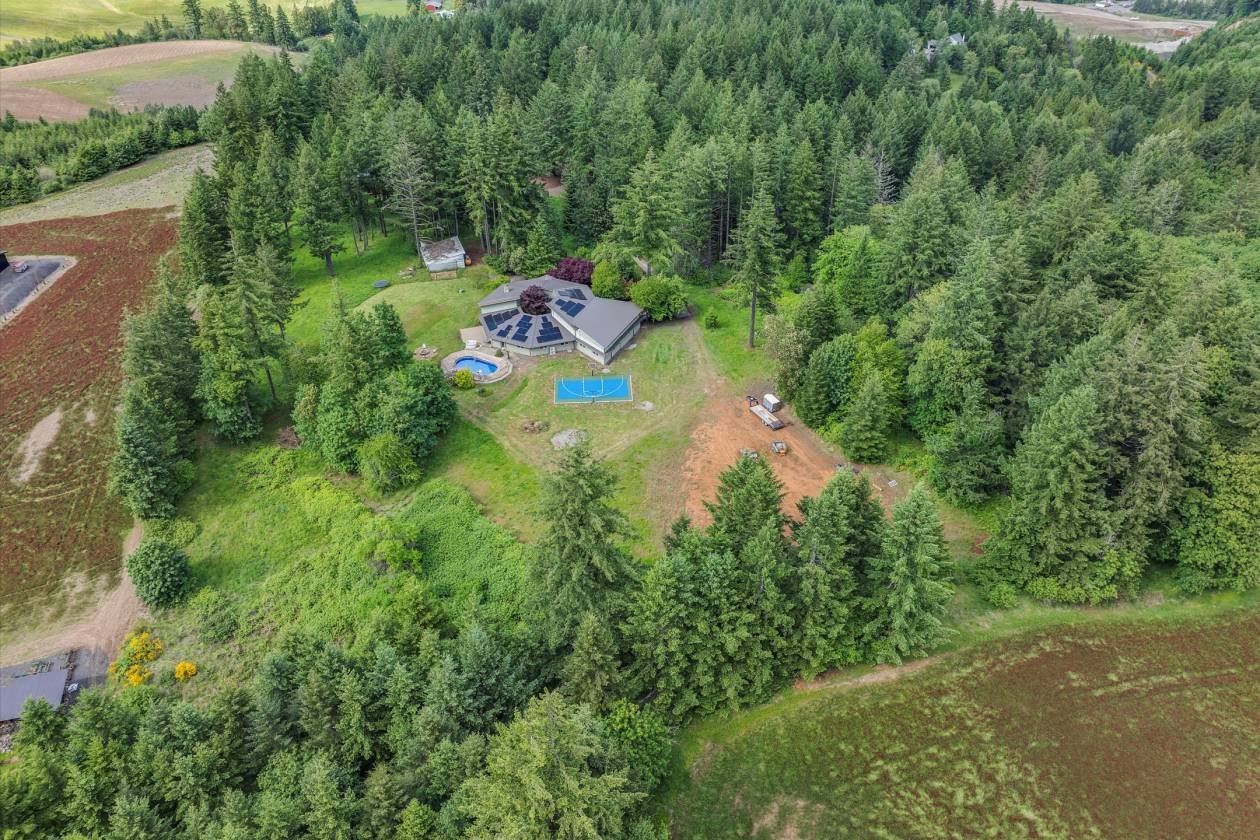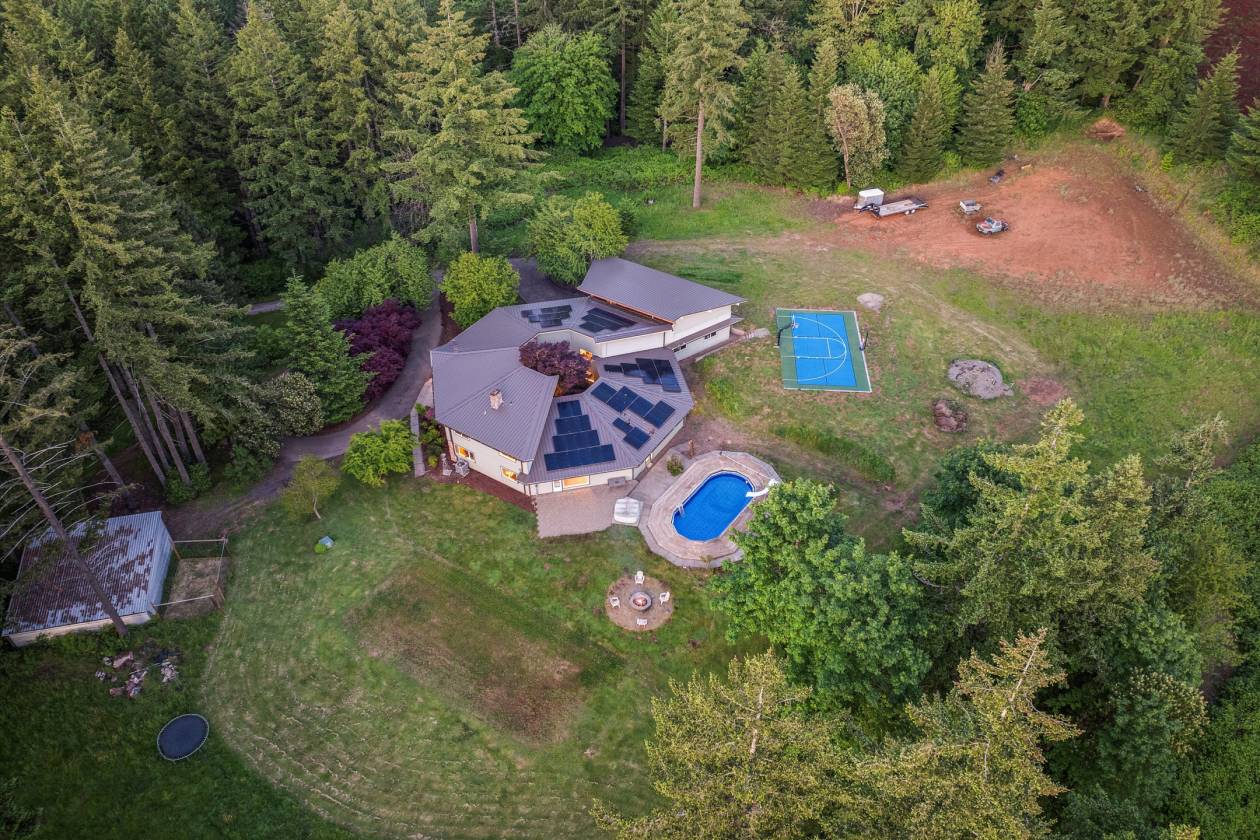 This exceptional 6,500+ square foot custom-built residence offers a rare blend of architectural distinction and lifestyle amenities. Designed in a unique octagonal layout, the home centers around a private courtyard with easy access that enhances indoor-outdoor living. The spacious interior features six bedrooms and five bathrooms, including a generous primary suite. Beautiful wood floors, complemented by vaulted ceilings and exposed beams lend an elegant, rustic atmosphere. The upstairs boasts an enormous family room for entertaining or stretching out, a large private gym and a covered porch with batting cage. Situated on six hilltop acres with sweeping views, the property includes a swimming pool with deck, a 50x30 sport court, and a four-stall barn making it possible to enjoy all aspects of your outdoor lifestyle. There is great horse property potential! On the practical side, energy-efficient systems, including high-efficiency heat pumps, a wood furnace, and advanced, highly effective solar panels ensure sustainability and cost savings. A huge garage and attached workshop gives storage, a place to tinker, and one more reason to call this place home. This is a rare opportunity to own a property that offers privacy, versatility, and a distinctive lifestyle setting.