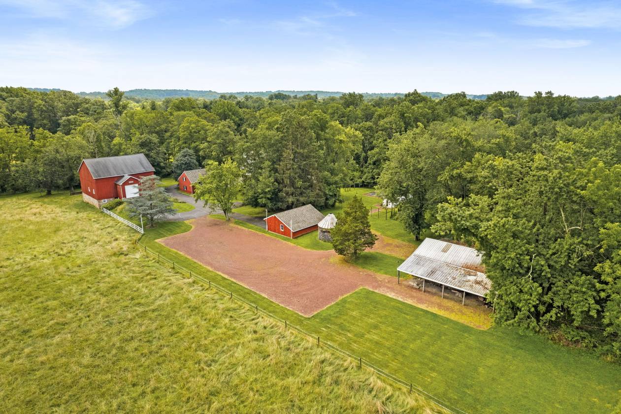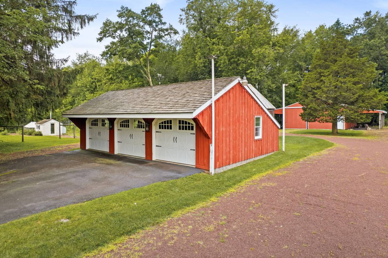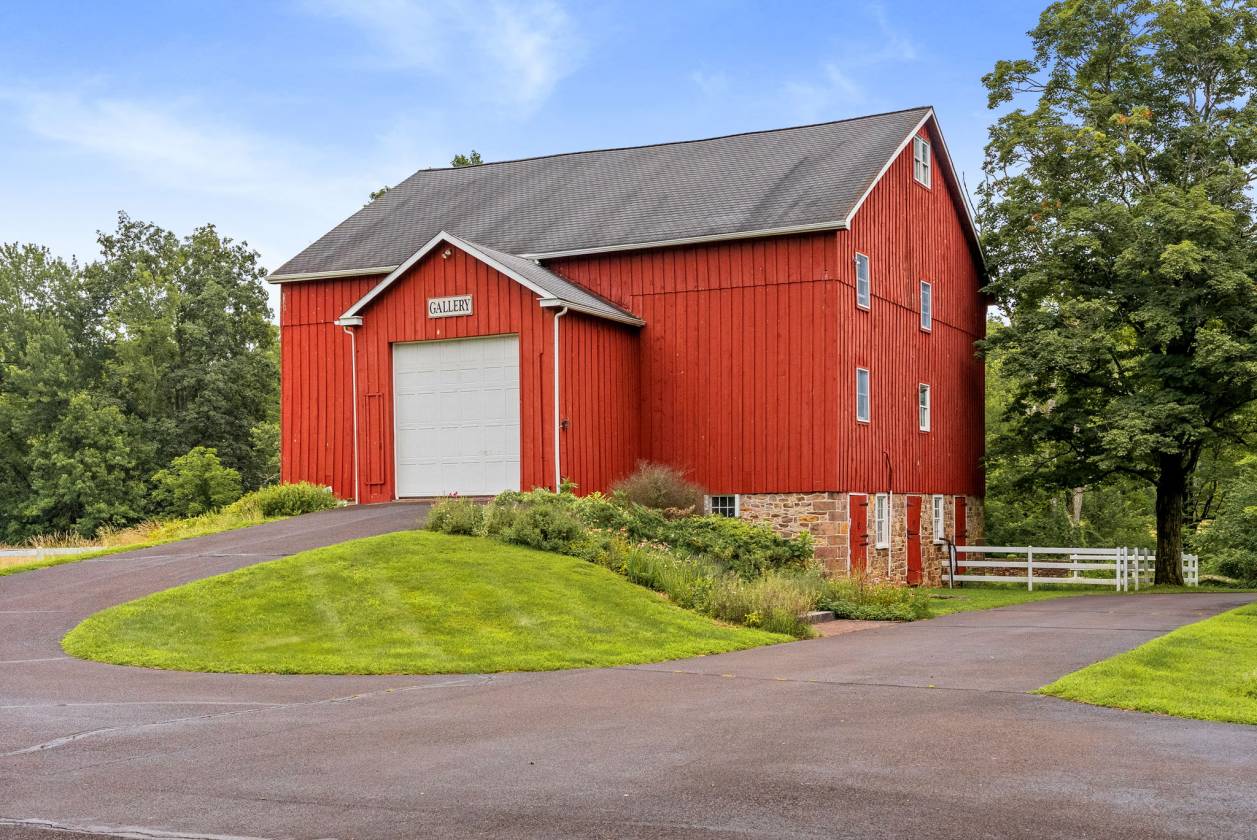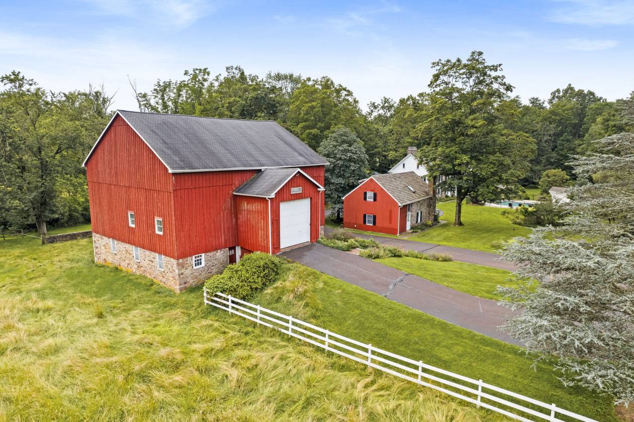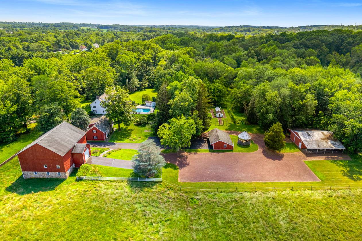 Gorgeous Bucks County Farmstead gracefully nestled on a scenic, tranquil backdrop of rolling country land that offers the utmost in privacy yet is convenient to everything. Over 20 acres of beautiful meadows, hayfields, open space, endless perennial gardens, rustic spring house with neighboring creek and more! This truly inspiring and lovingly preserved hobby farm offers a perfectly positioned main house, carriage house, large barn with stalls and gallery space, detached 3-car garage, pole barn and greenhouse. The stately tree-lined drive is a precursor to the beauty that awaits. The antiquity and sustainable space in the stone farmhouse offer a glimpse into its 1700’s past while bestowing some modern touches although maintaining the historic charm. Features include 4 bedrooms, 3.5 baths, bonus third floor flex space which can be utilized as a studio or fitness space and partially finished lower-level ideal for a billiard/pub room. Abundant in character, this vintage beauty showcases skillfully crafted exterior and interior stonework along with deep windowsills, exposed beam ceilings, period hardware, cedar roof, 4 wood-burning fireplaces, wood floors and built-ins throughout. Relax outdoors on the covered back porch or lounge at the saltwater pool with convenient pool house highlighting a full bath while admiring the wildflowers and long distant meadow views with the sounds of nature all around. Guests can enjoy their own serenity in the eye-catching, spacious Carriage House featuring 3 bedrooms, 2 full baths, kitchen and living space adorned with wood beam accents and a sizeable picture window to admire the grounds. The lower portion of the classic Red Barn can easily host horses and other animals with multiple stalls while the upper portions are finished to accommodate a multitude of uses. In the past, this included an art studio and gallery, but any collector will delight in this space as well as the separate Pole Barn building. So much to be discovered on this glorious compound bordering 50 acres of preserved land. Meander through your own nature preserve and hike on your own walking trails, grow your own vegetables, and raise farm animals while enjoying this hidden piece of paradise showcasing charm and cozy living quarters. The mural-like setting located just minutes from downtown Doylestown, exemplifies one of the finest properties in Bucks County with its traditional design and every amenity appreciated for today's lifestyle.