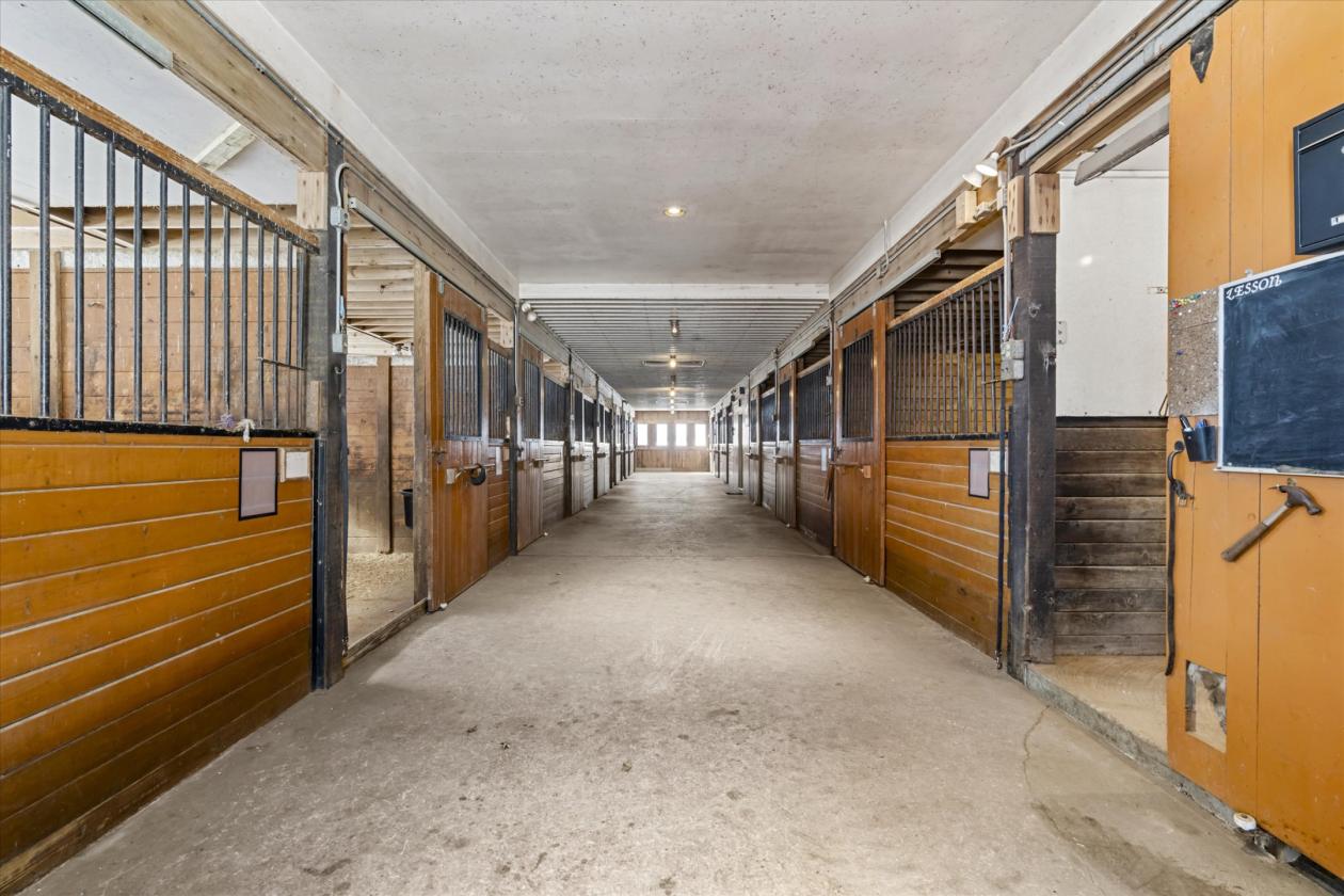 - In total, the farm includes a total of 32 stalls of various sizes, including 2 foaling stalls, and 26 stalls with rubber mats. Equine infrastructure is the star here, with two separate barns including a main 20-stall barn featuring a barn office and a 1-bedroom student/manager apartment, plus a historic 12-stall “Century Old” bank barn tucked into the hillside. Barn aisles are wide and functional, with concrete flooring, well-ventilated stall fronts, sliding doors, and abundant natural light. 4 Paddock run in behind the main barn. 2 Wash stalls with hot and cold. 2 heated Tackrooms for your saddles & tack. Trainers' office, with a private full bathroom, with a shower. 1 Bedroom, 1 Full bath, Living Room, with Laundry, Apartment above the Trainers' office.