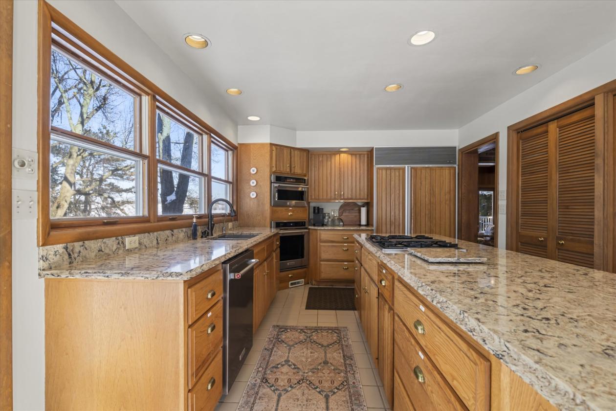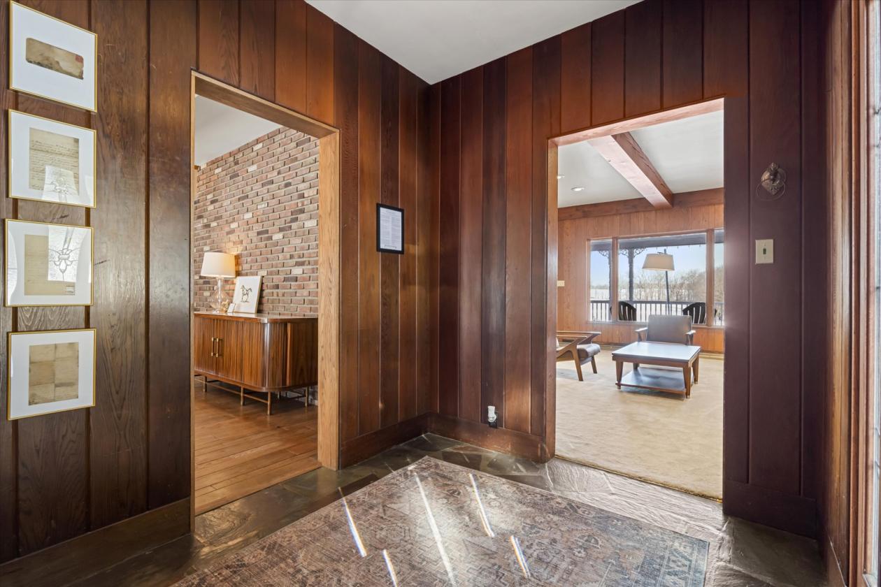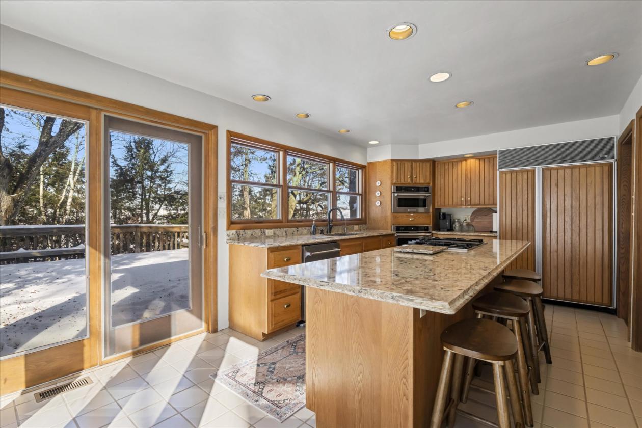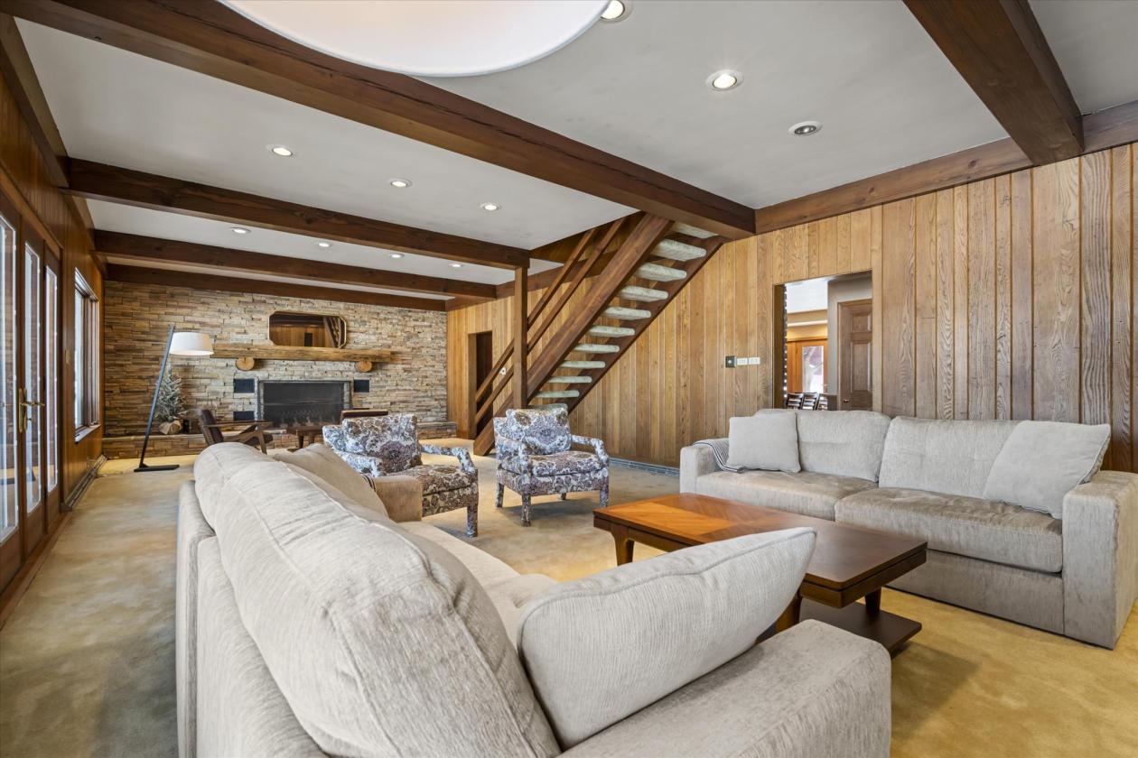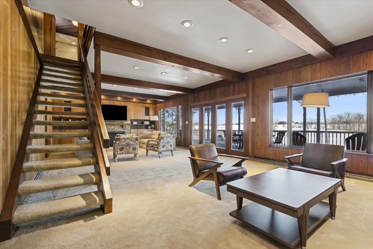 - The estate residence is a 5-bedroom, 3 full bath home currently operated as a successful Airbnb. The enormous living room is anchored by two opposing stacked-stone fireplaces and opens through French doors to a covered, ceramic-tile side porch with sunlights, overlooking the lake. Rich wormy chestnut walls and trim add warmth and character, complemented by solid oak 6-panel doors throughout. The entertainer’s kitchen shines with granite countertops and wall-to-wall shelving for exceptional storage, and French doors lead to an expansive deck with charming “cupcake” steps to the outdoors. The lower level offers ideal separation for an in-law suite, guests, or teenagers who want their own space. Additional highlights include a lighted tray ceiling in the dining room, well water, a spring house, and a septic system.