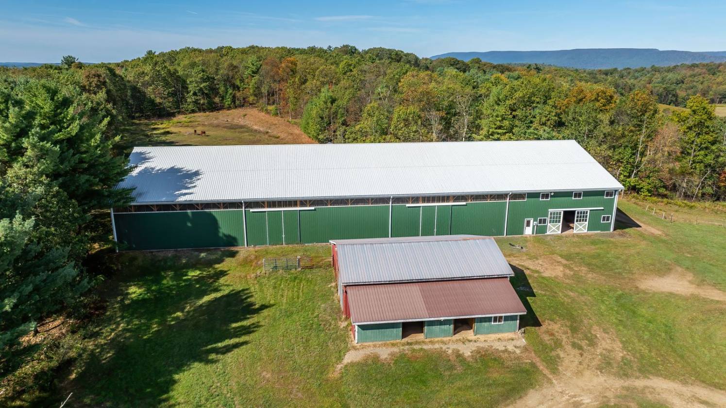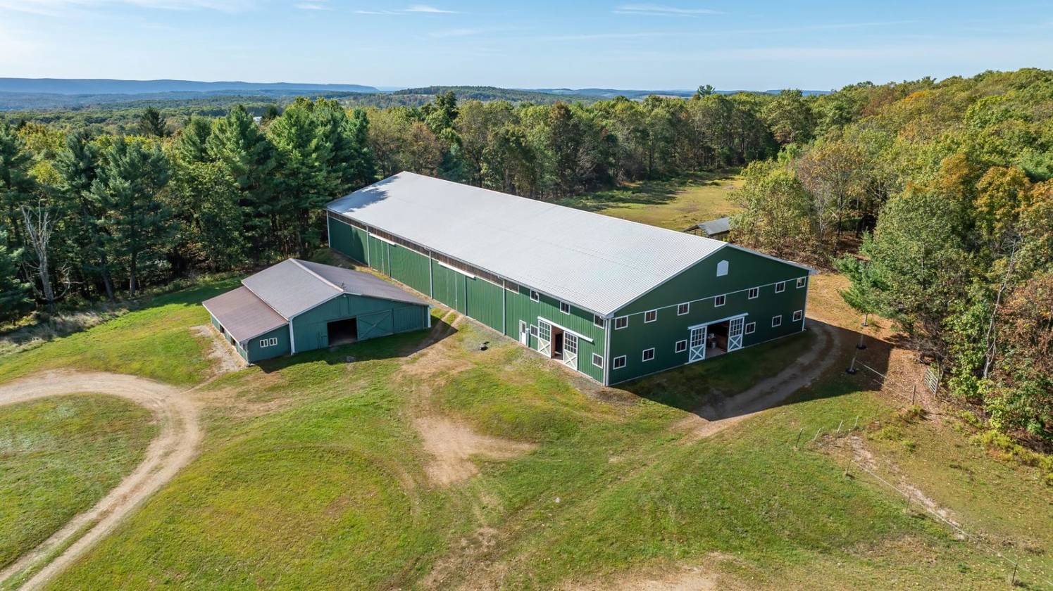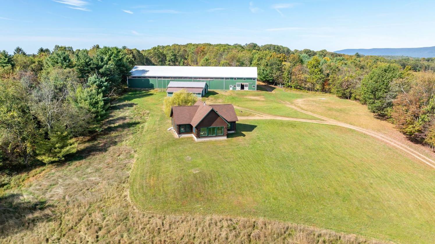 Equestrian Paradise on 31± Acres - Stunning Lincoln Log Home & Premier Horse Facilities Welcome to this breathtaking 31± acre estate featuring a custom Lincoln Log Home offering 4 bedrooms and 2.5 baths. The home has been thoughtfully updated with new Anderson doors and windows, a newer roof, and beautifully renovated bathrooms. Enjoy panoramic, long-range views that stretch across the countryside—truly a setting that captures the best of country living. The residence is served by a recently installed, energy-efficient geothermal heating system, providing comfort and sustainability year-round. For the equestrian enthusiast, this property delivers exceptional amenities. The 40' x 40' barn includes 7 stalls plus a pony stall, frost-free water, a tractor storage bay, and a turnout area. The impressive 200' x 80' indoor arena, built by Stable Hollow Construction, features nine 12' x 12' stalls with swing-out bucket doors, 19' ceilings, a tack room, viewing room or office, and a large upper-level viewing or hay storage area, served by a dedicated electric meter.