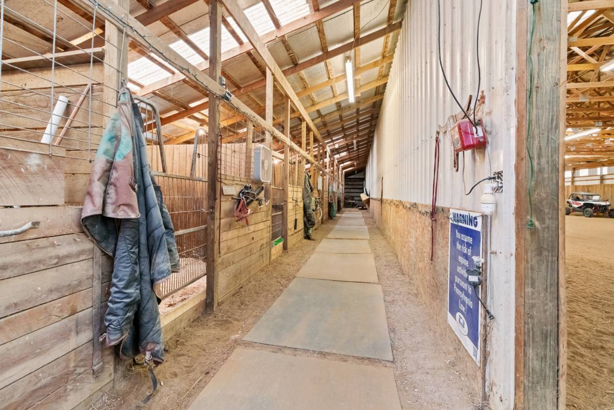 Experience the perfect blend of rural tranquility and modern comfort with this turnkey equestrian property on 16.59 unrestricted acres in Clinton Township, just 15 minutes from Grove City and an easy commute to Pittsburgh. This thoughtfully designed ranch home and equestrian facility are connected under one roof, offering seamless access from the mudroom to the 70’x120’ indoor arena and 10-stall barn, all designed for year-round comfort and convenience. The two-bedroom, one-and-a-half-bath ranch home has been extensively updated, featuring brand-new laminate wood flooring (2025), a fully remodeled main bath (2020) with dual showerheads and walk-in shower, and a new half bath (2025) added in the stable area for barn-side convenience. The great room with open-concept kitchen is perfect for hosting gatherings, showcasing stainless-steel appliances, a gas stove, warm wood cabinetry, and a spacious center island. A stacked washer/dryer is conveniently located just steps from the mudroom for quick access between the home and barn. The back door opens directly to a private hot tub area overlooking the pastures, creating a relaxing retreat after a day of riding. The property also includes a tool and equipment shed, separate from the barn and arena areas! Equestrian amenities include an indoor arena with 88 tons of upgraded sand footing, direct exterior access for equipment, a half bath accessible from the arena, new water hydrant and plumbing, and access to miles of horseback riding and ATV trails from the property. Each stall offers both indoor and outdoor access, so you can let the horses in or out without ever going outside during inclement weather due to a mudroom connecting the home and barn! The four electrified and newly fenced pastures (~6.17 acres) are designed for rotational grazing and connect directly to the central corral and indoor stalls. The indoor stalls also feature electrical outlets for fans and heated buckets. A brand new 32-foot custom run-in barn (2023) shelters multiple horses and greatly minimizes the need for stall time. The water trough area in the central corral is accessible by all pastures and includes an electrical outlet to heat the water in the winter months! The setup supports both personal and professional equestrian use, ideal for hobbyists, boarding, lessons, or small training operations. After a day of riding, relax by the fire pit or soak in the hot tub while enjoying peaceful views of your private pastures. Whether you’re a professional equestrian, hobby rider, or someone seeking a private country retreat with income potential, this exceptional equestrian oasis combines modern updates, practicality, and unmatched freedom with no zoning restrictions and numerous updates (too long to list)!