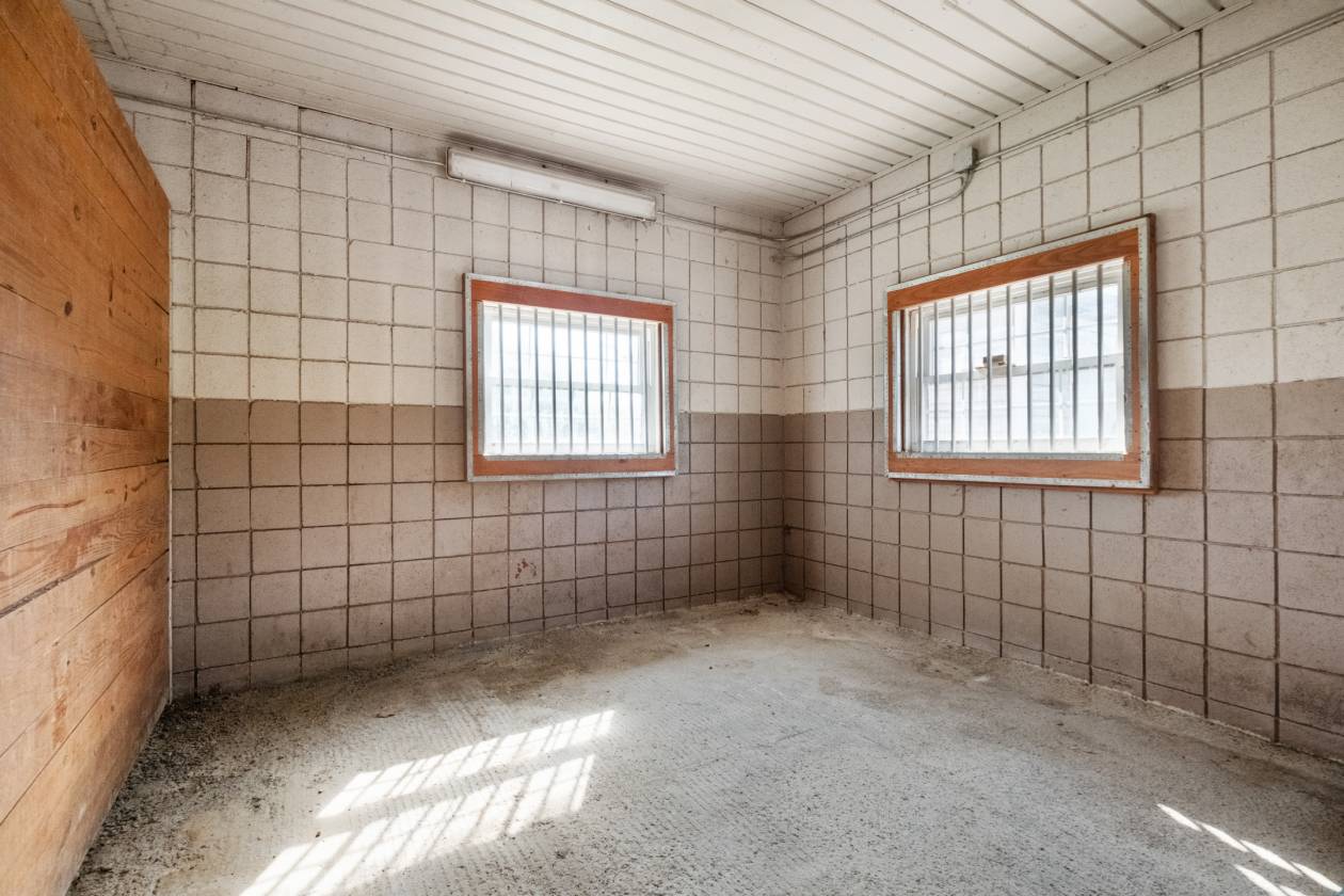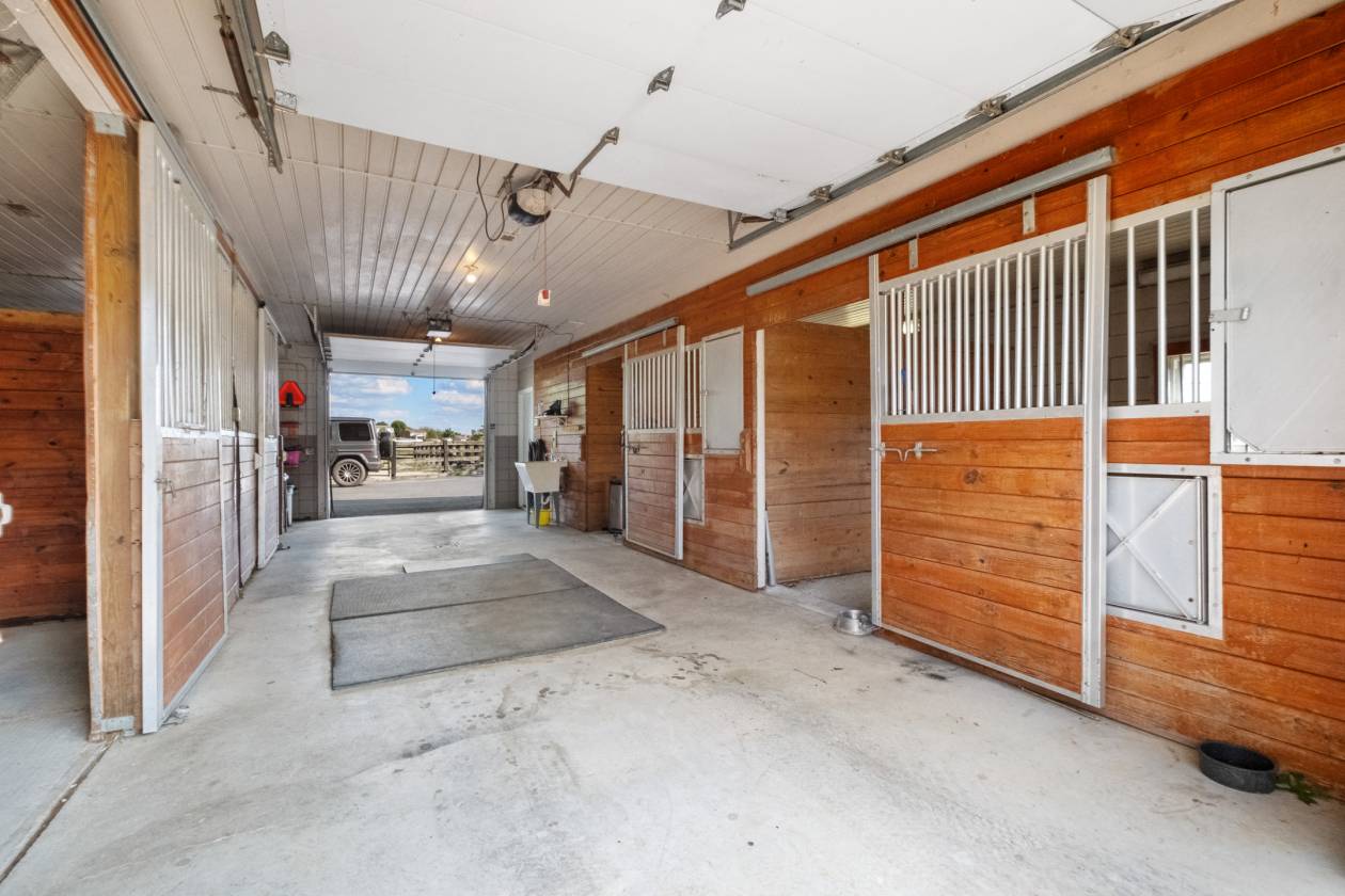 • The barn is equipped with a tack and feed area, hot and cold water access, and excellent drainage. Wide center aisles make movement safe and efficient, while large doors open directly to lush, fenced pastures—perfect for daily turnout and grazing.