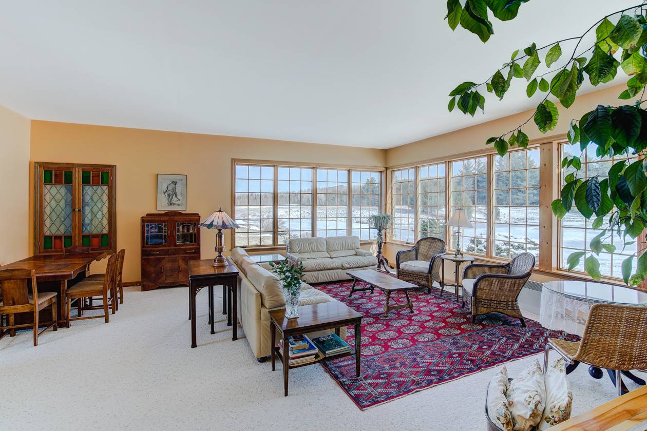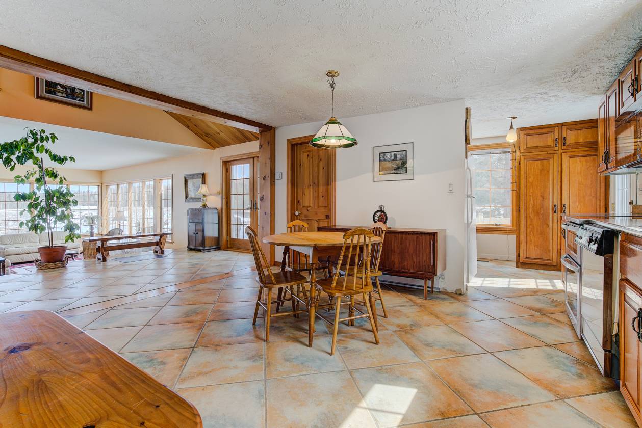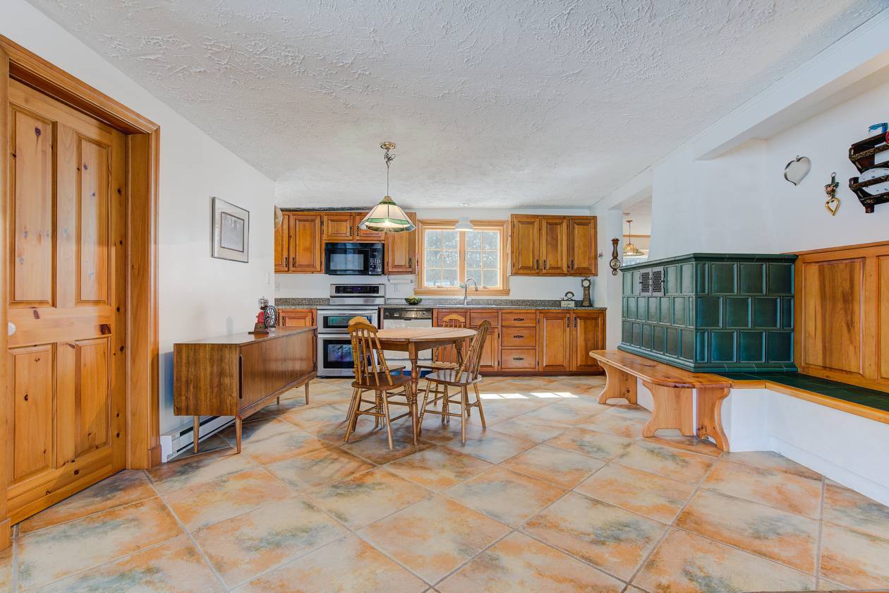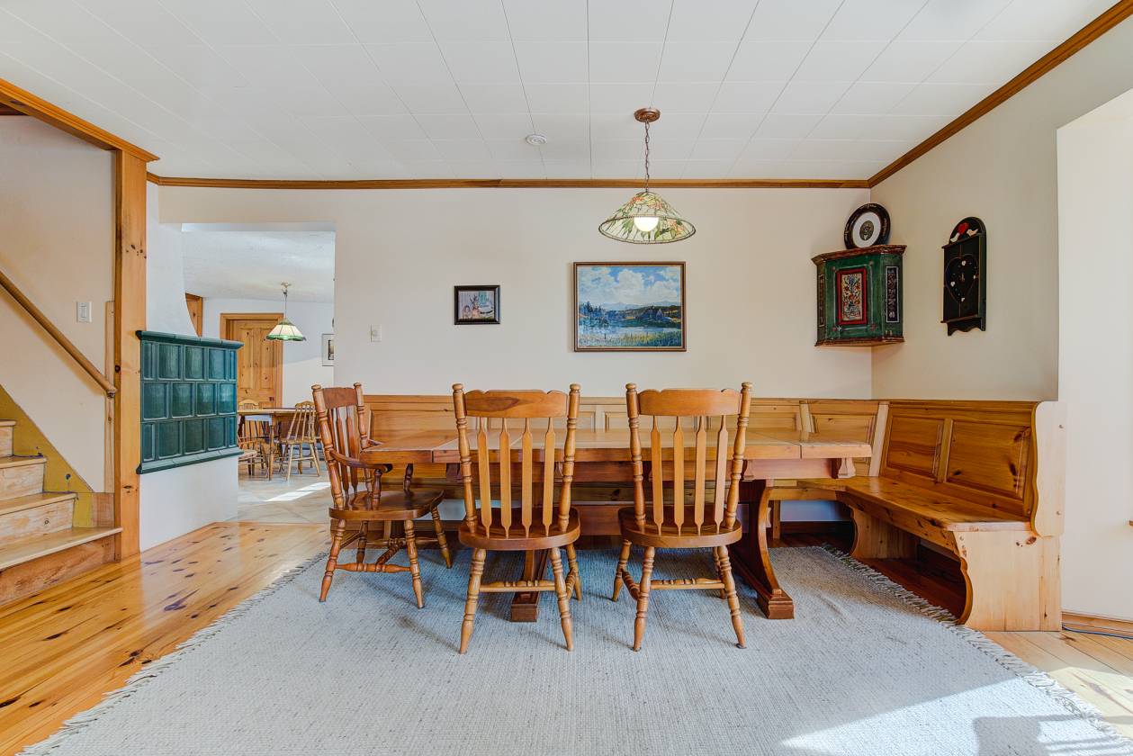 - The house has an open concept living space, inviting for family gatherings. The living room with its view of the pond is flooded with natural light. The spacious kitchen with uniquely designed wood stove, wooden cabinets and dining area, offers a direct access to the outdoor terrace. The family room/dining room offers a direct view of Jay Peak.