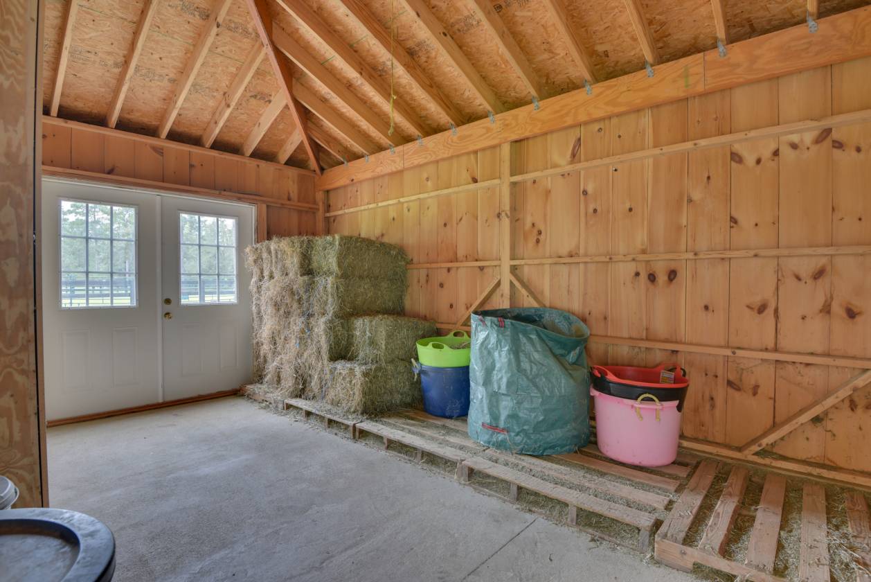 - Feed room features ample storage and direct exterior access for ease of delivery of hay, shavings and grain.