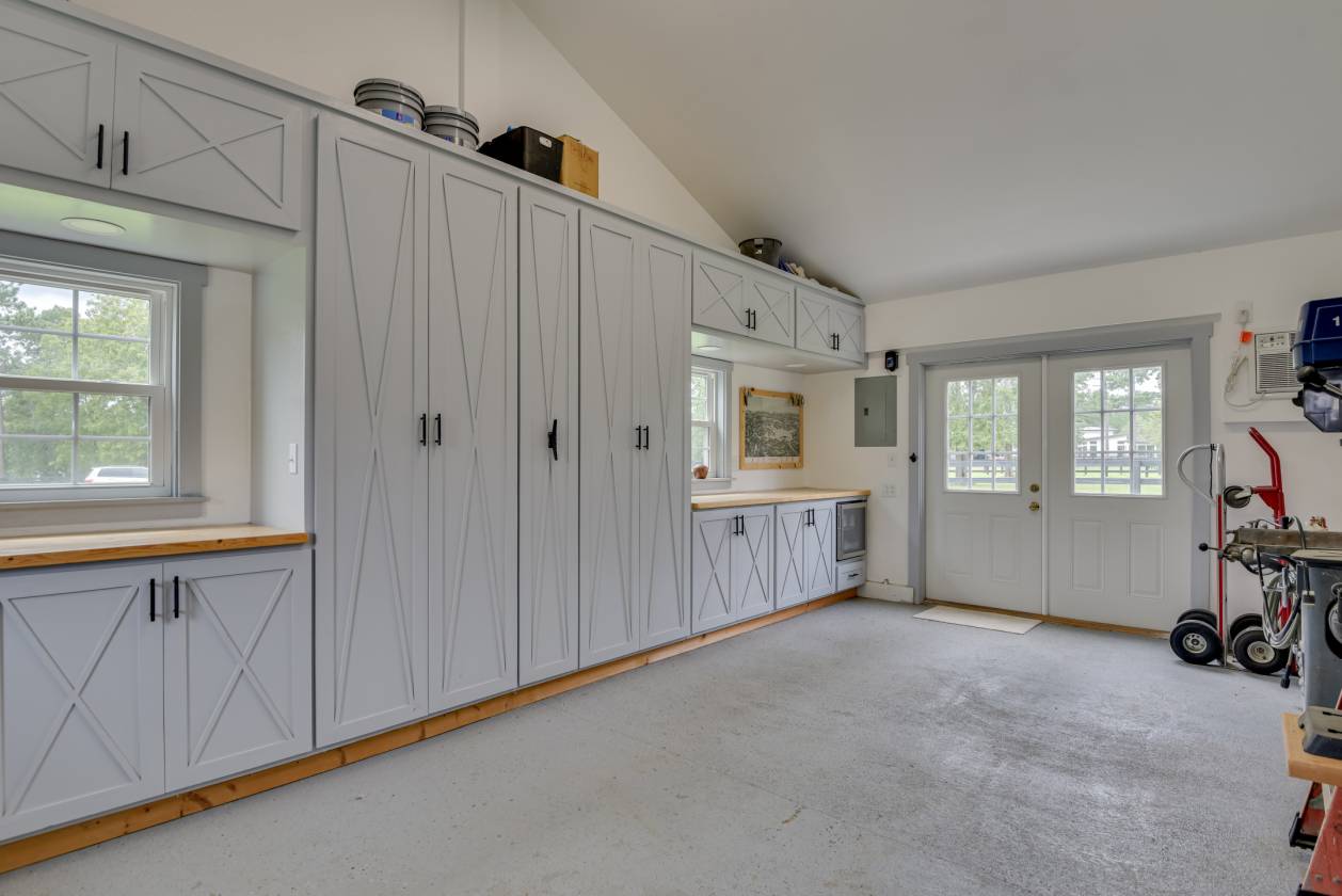 - A climate controlled large shop with double doors for easy access has storage, a beverage refrigerator, TV hook up, room for all the necessary farm equipment, and so much more.
