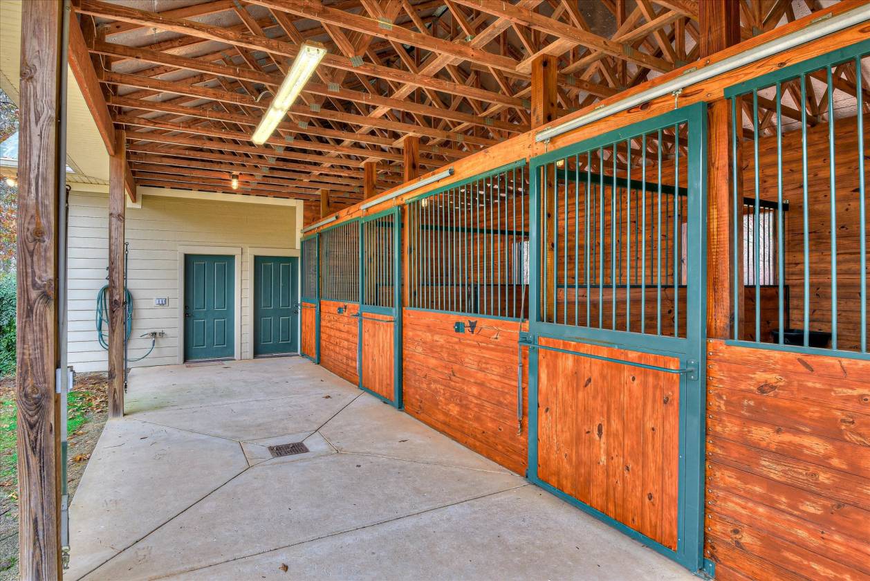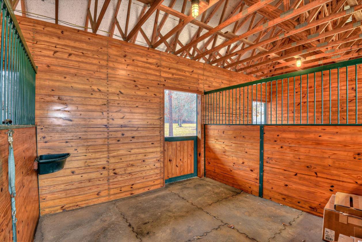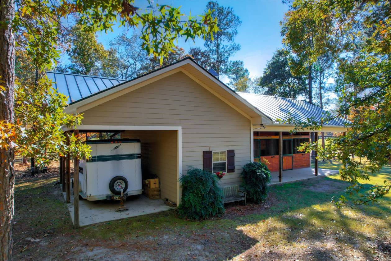 Beautifully maintained custom home and turnkey equestrian property on 5.54 acres in Three Runs Plantation, offering privacy trees along three sides, immediate trail access, and a short hack to the community's riding arenas, pool, and clubhouse. Built in 2013 by Designer Builders (Todd Gaul), this 4-bedroom, 2.5-bath home provides 3,159 sq ft with quality finishes throughout. The main living areas feature hardwood floors, crown molding, and a Great Room with an authentic Hitchcock ceiling, gas fireplace, and custom built-ins. A dedicated bar with custom cabinetry connects the Great Room and dining room. The dining room offers a tray ceiling and custom wainscoting detail. The kitchen includes Bosch appliances (Sharp microwave drawer), double ovens, a separate pantry, breakfast area, and sitting area. Additional spaces on the main level include a laundry room, back hall, and powder room. The primary suite on the main floor includes two walk-in closets, a spacious bathroom, and custom wood shutters on the windows. Three additional bedrooms are located upstairs, along with a full bath. Access to the floored attic provides generous storage. Outdoor living includes a screened porch with tile flooring and vinyl window panels (screens and vinyl replaced in 2024). A pressed concrete and brick patio is located off the porch with a gas grill connected to the propane tank. The home is fully landscaped and irrigated, including 11 dogwood trees. Asphalt driveway with concrete turnaround and walkways. Three-car garage, with one bay currently used as a workshop. The equestrian amenities include a 3-stall barn (12'x12' stalls) with tack room, storage room, and overhangs on three sides, also built by Todd Gaul, featuring a standing seam metal roof and hot/cold water in the tack room. Stalls were professionally refinished in fall 2025. The property offers three acres of fenced grass pastures, with the front pasture irrigated, hydrants to two pastures, and fencing repaired and painted in 2025. Propane services the stove, hot water heater, fireplace, and grill. Heating and cooling are electric heat pumps with separate systems for each level. A well-planned home and equestrian setup with direct trail access and a private, established setting within Three Runs Plantation. Three Runs Plantation offers equestrian amenities, including two riding complexes, each with a mirrored dressage arena, a jumping arena, and a grass jump field with a water feature. Additional community amenities include a clubhouse, pool with a cabana, and an activity center with a fitness room. Buyer pays a one-time Capital Contribution to the HOA
