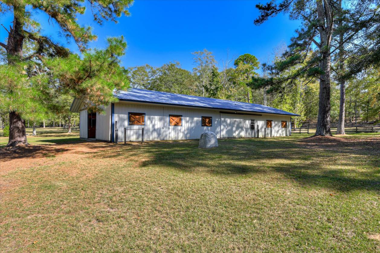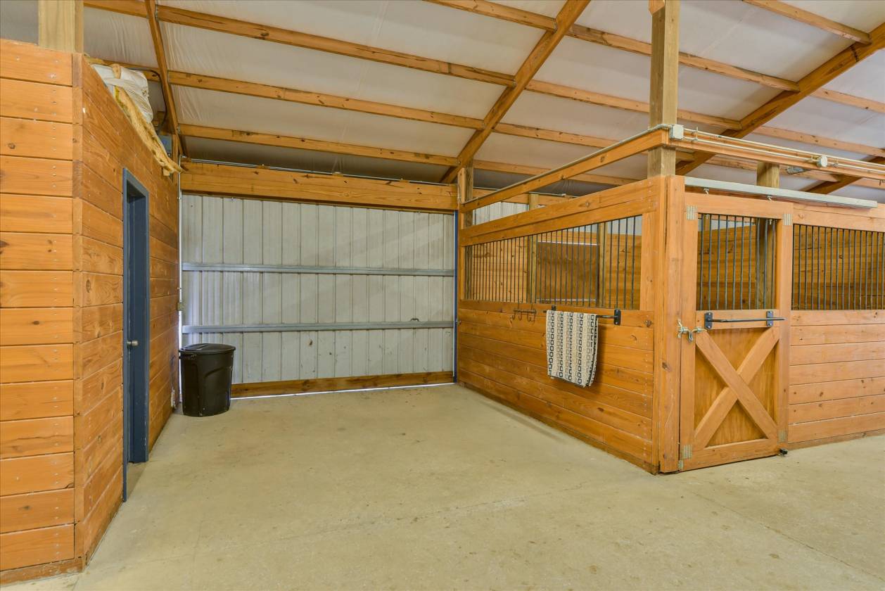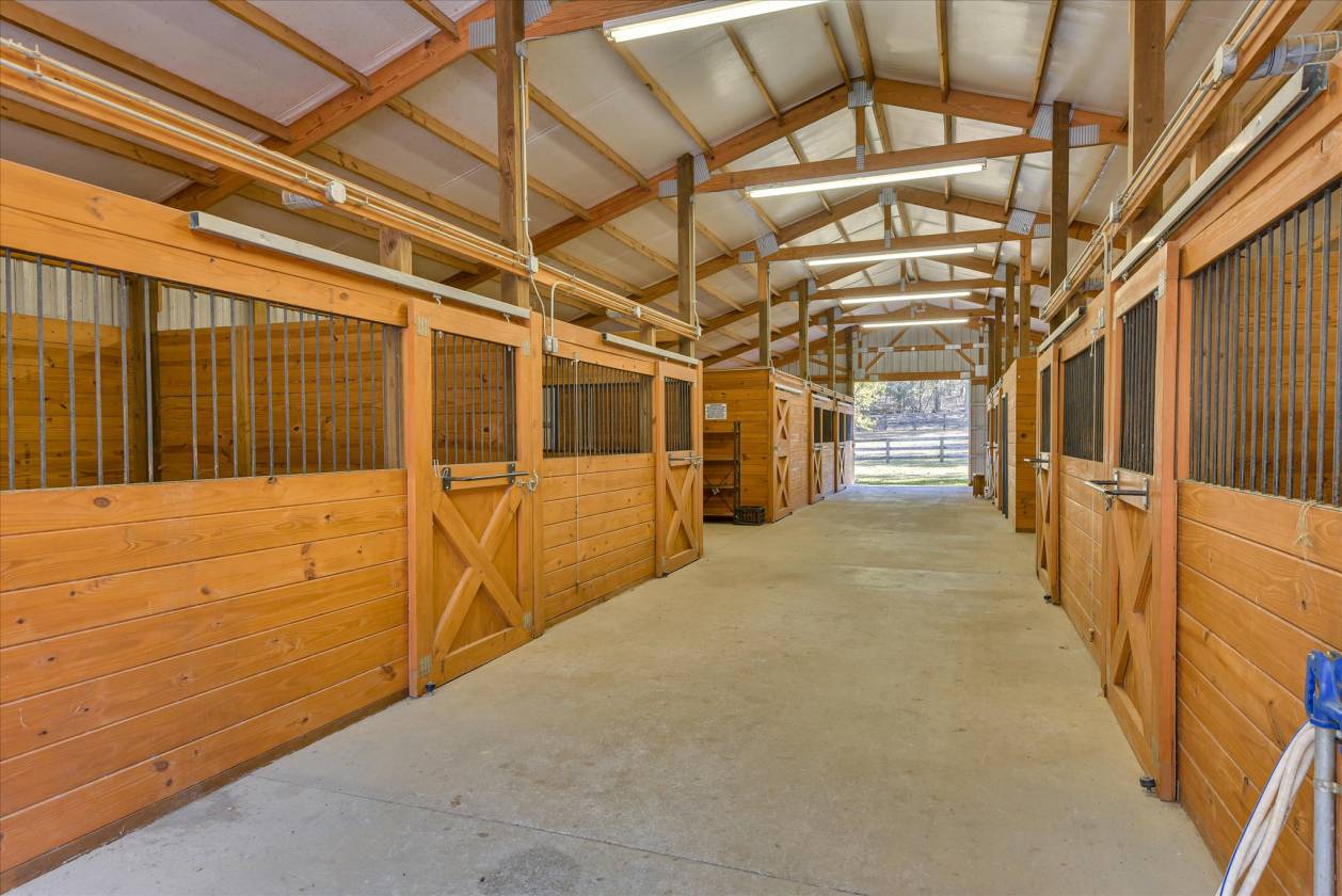 - well designed 10 stall barn with dutch windows 12 x 12 stalls, four sliding doors providing great ventilation. tack room with washer/dryer hook up, feed/junk stall, and full bath