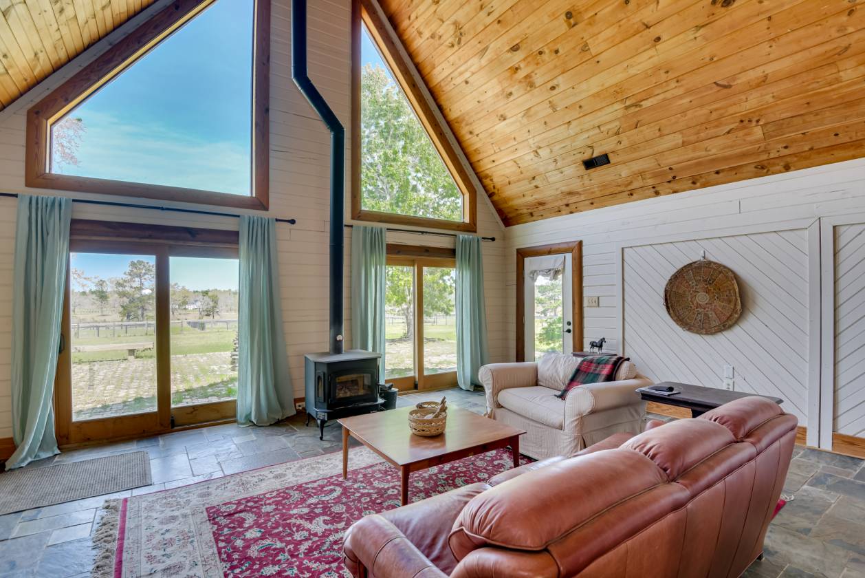 Latigo Ranch, reminiscent of the wide-open spaces of the American West, offers the opportunity to own a truly unique estate, suitable for any discipline of equestrian use, cattle ranching, a homestead or a private paradise. The modern rustic log home with 3300+ feet of living space situated on 50 glorious acres features an open floor plan with a cozy wood burning stove in front of soaring windows with panoramic views of the land. The main level includes a custom kitchen with granite counter tops & stainless appliances open to the main living/dining area, a spacious master bedroom w/en-suite bath with two walk-in closets, a laundry, & an additional bedroom and bath. A 2020 built contemporary staircase provides access to the loft, two additional bedrooms both w/ample storage space, and an additional bath. A large yard fenced with no climb provides a play area for furry friends. Your equine partners will appreciate the 2023 three stall barn with electric and water, tack room, feed room, hay/equipment storage and three run out paddocks attached. No climb fencing encompasses two large pastures, four ample size paddocks (each with its own large run-in shed) all with wonderful, lush grass. A round pen, several level spots with super footing and wide-open spaces are all there for your riding pleasure. A large covered open pole barn for farm equipment and two additional storage sheds plus a storage area in the carport allow ample storage options. With roughly 20 already improved and cleared acres, and 30 remaining acres with some beautiful hardwoods and mature pines available to be selectively cleared let your imagination run wild. Ride onto Latigo Ranch and live your dream.