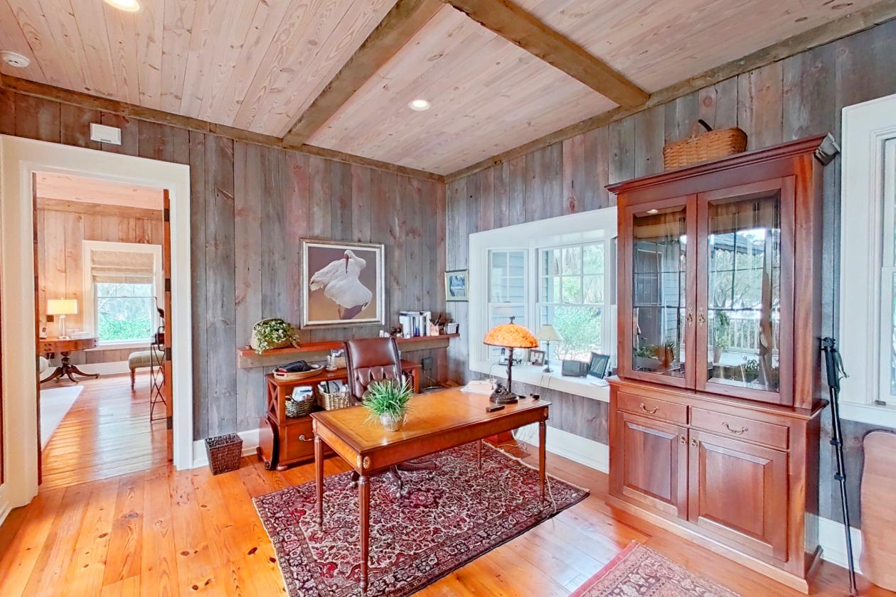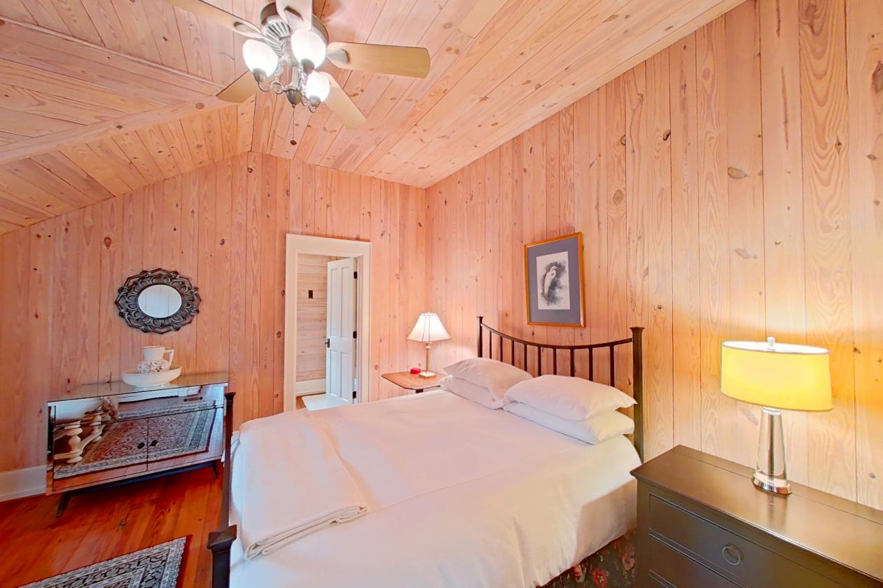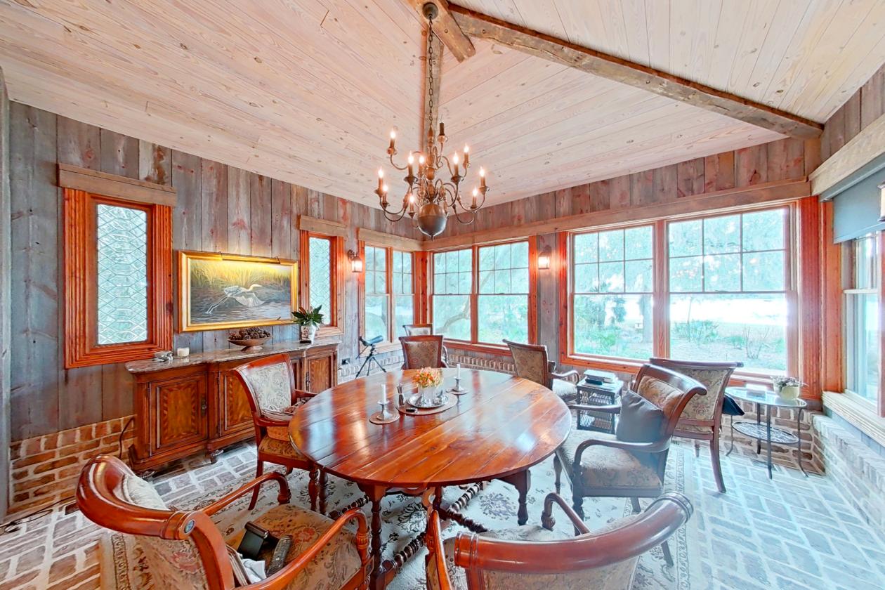 - The main residence features two bedrooms and two-and-a-half baths, with soaring vaulted ceiling crowning the great room and creating a warm yet dramatic gathering space. A grand cooking fireplace anchors the country kitchen and dining area, blending rustic charm with timeless elegance. Two screened porches invite you to relax and take in tranquil views of the shimmering salt pond, offering seamless indoor-outdoor living.
